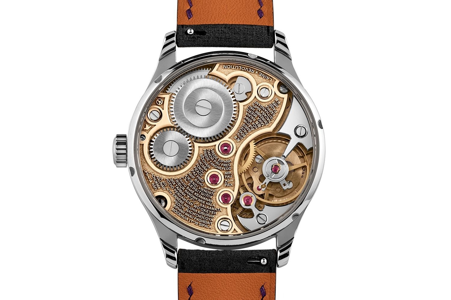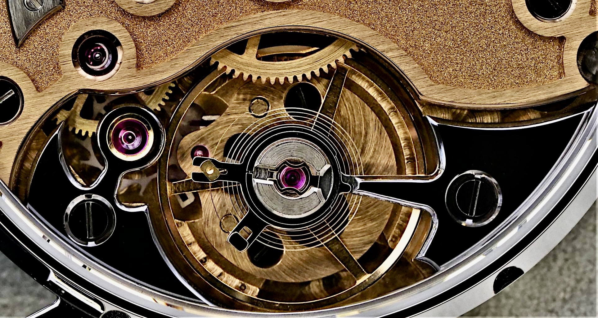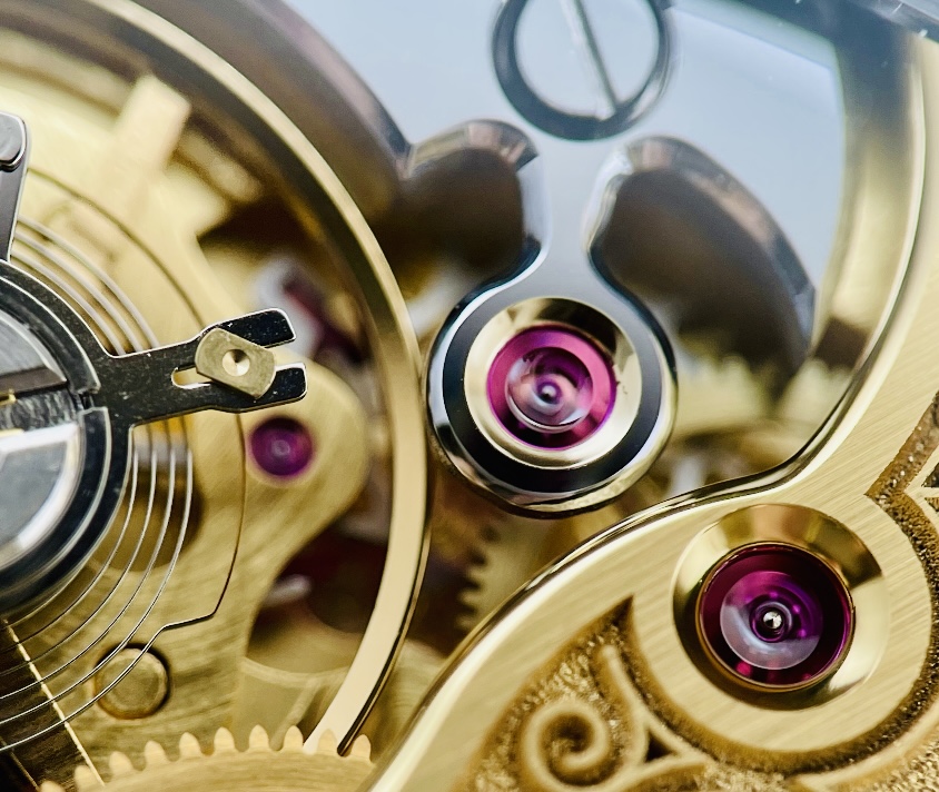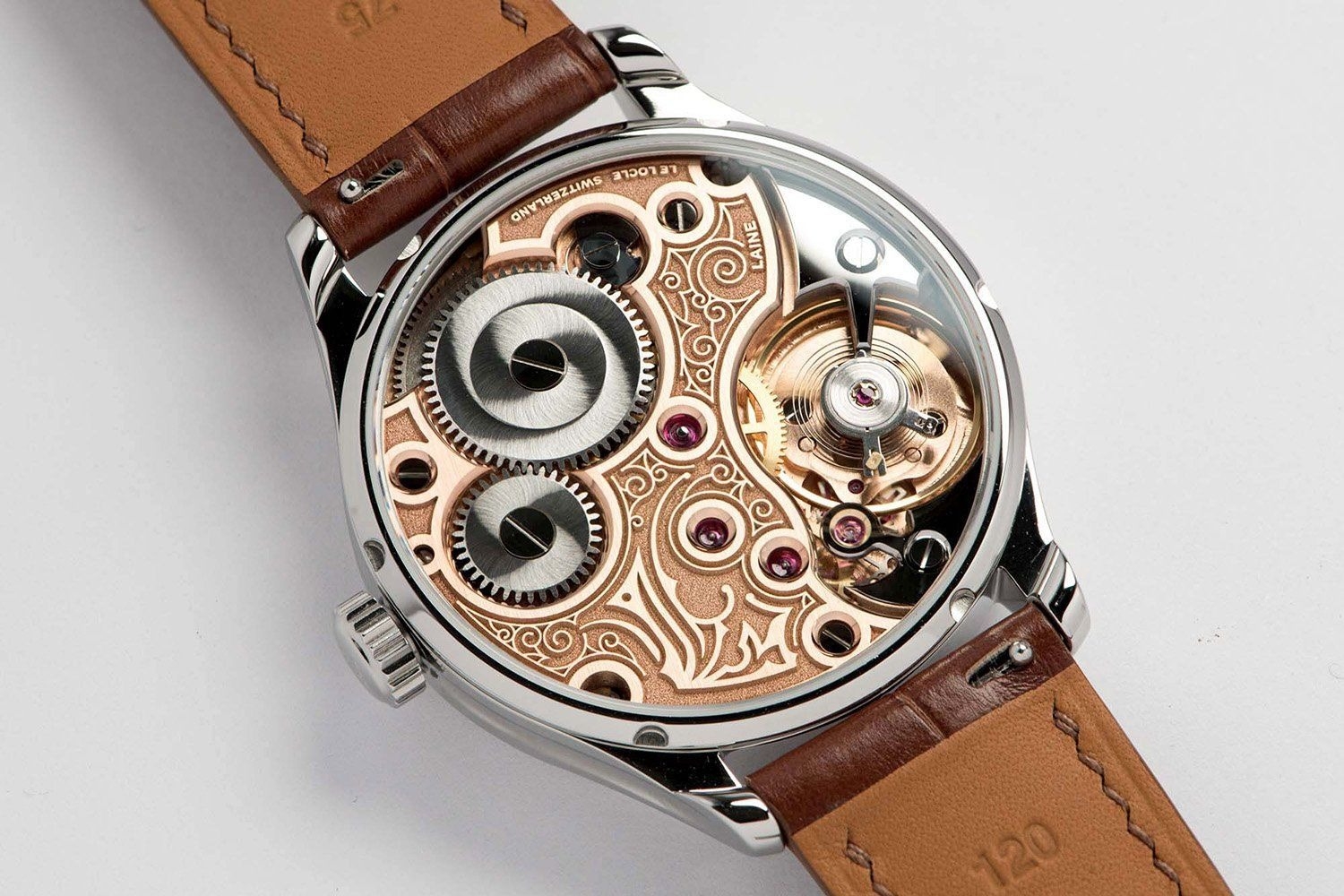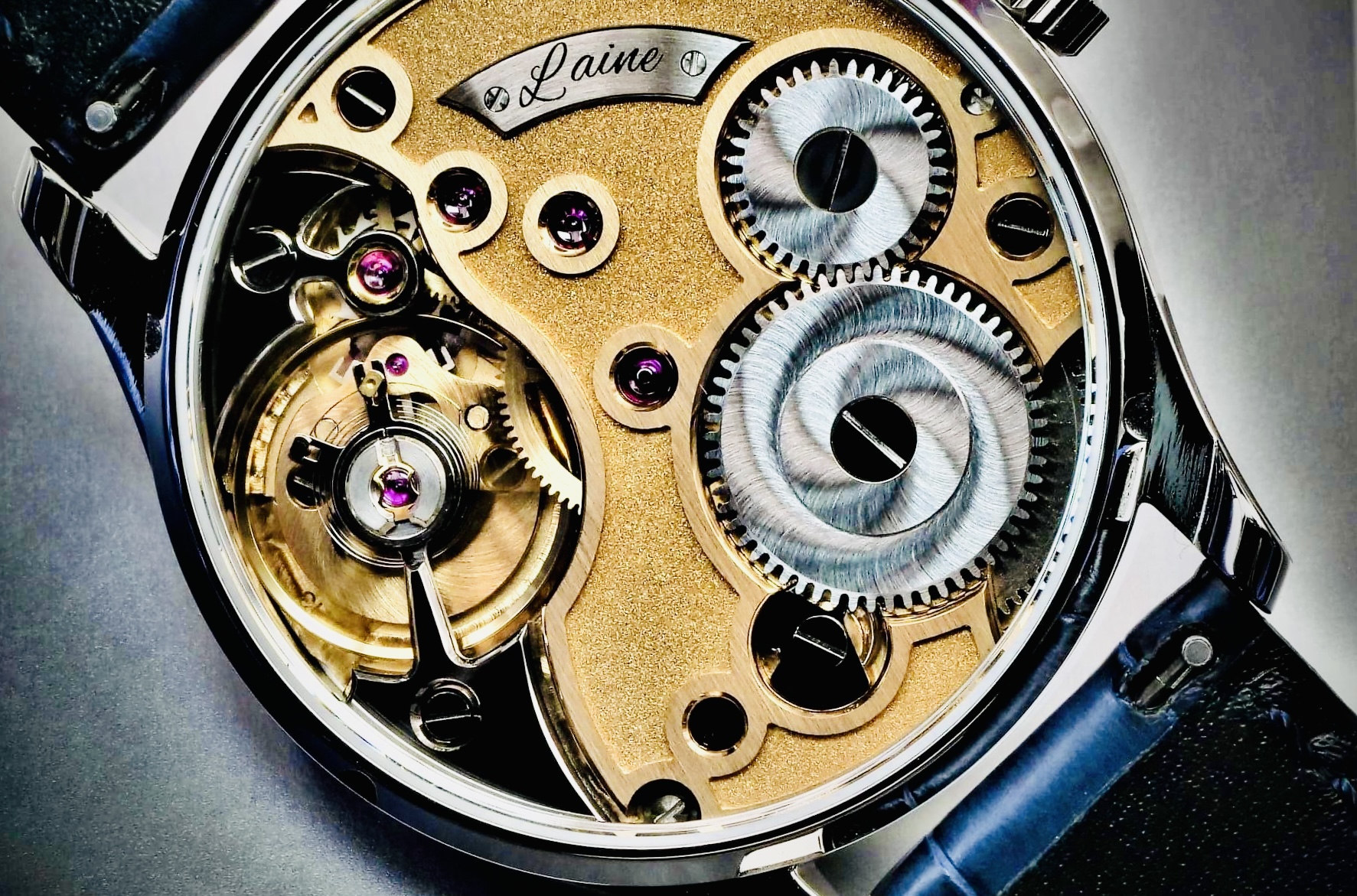 Đầu tiên, toàn bộ kiến trúc của bộ máy là khác nhau. Thay vì một tấm khung ba phần tư đơn giản, Laine đã tạo ra một tấm đế cong tuyệt đẹp, uốn lượn quanh bánh cóc và bánh xe của hộp cót với sự uyển chuyển của một vũ công belly dance, đồng thời có các mũi nhọn sắc như dao cạo được vát bằng tay và đánh bóng đến mức hoàn hảo chỉ để thể hiện khả năng phi thường của mình. Tấm khung này được Laine chế tạo bằng máy tính (CNC) thu nhỏ của riêng mình. Sau đó, một lớp hoàn thiện tùy chỉnh được áp dụng, kết hợp phủ sương và chạm khắc thu nhỏ đẹp nhất, sử dụng máy khắc laser của chính Laine trong một căn phòng trong xưởng chế tạo, bên cạnh nơi anh ấy áp dụng phương pháp xử lý điện vàng hồng cho tấm khung chính.