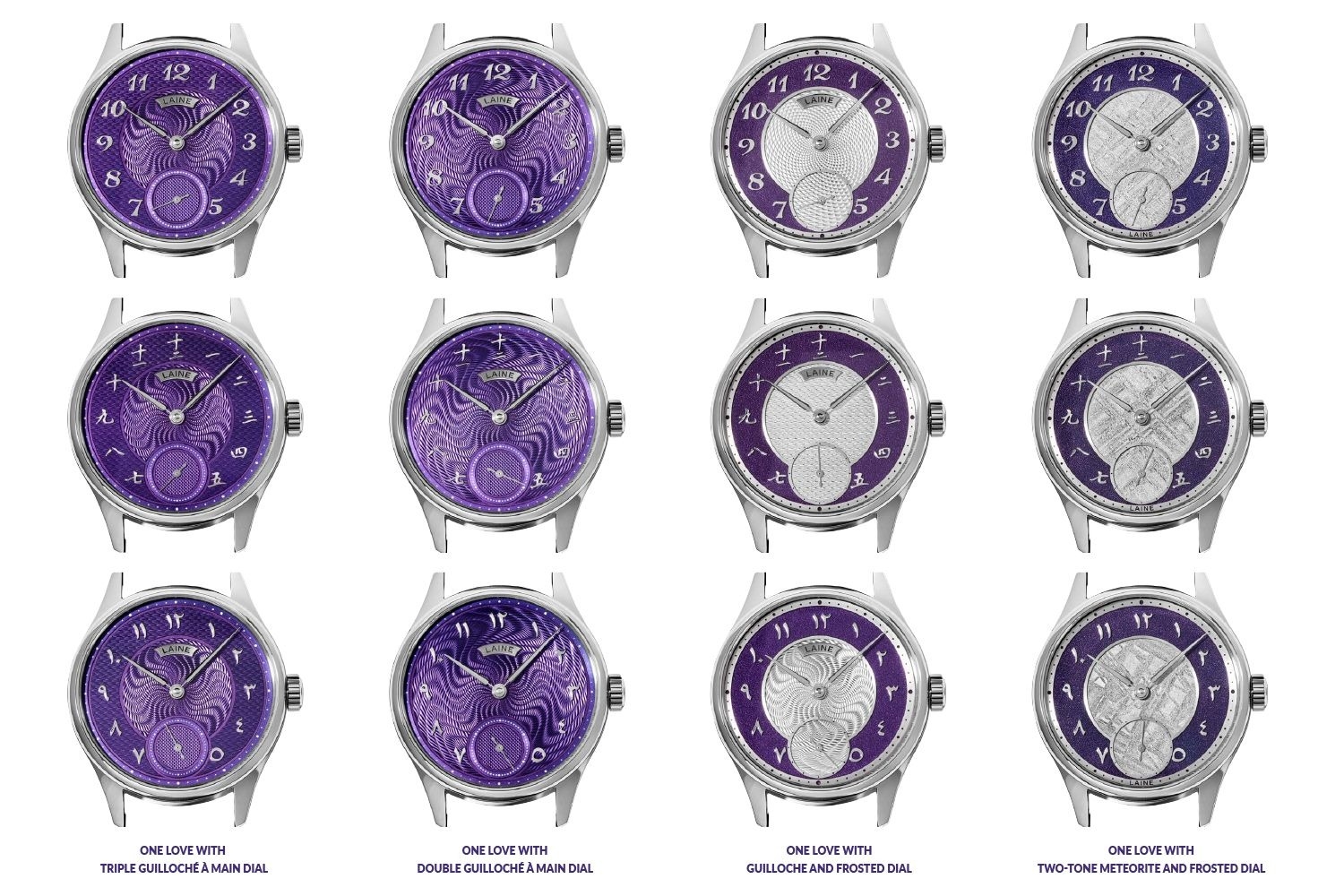 Dưới đây là một bộ sưu tập tuyệt vời của Torsti Laine, gồm có bốn chiếc đồng hồ sử dụng một tông màu chung và bộ máy được chạm khắc đầy chi tiết. Nhưng bốn chiếc đồng hồ không giống nhau mà mỗi chiếc có một mặt số có hoa văn trang trí tinh xảo: Guilloche. Trên mặt số là các cọc số Breguet, chữ số Trung Quốc và chữ số Ả Rập. Kết quả là tạo ra 12 chiếc đồng hồ độc đáo, tượng trưng cho sự thống nhất và hoà hợp. Đó là những chiếc đồng hồ có sức hấp dẫn, có thể gắn kết mọi người yêu đồng hồ lại với nhau.