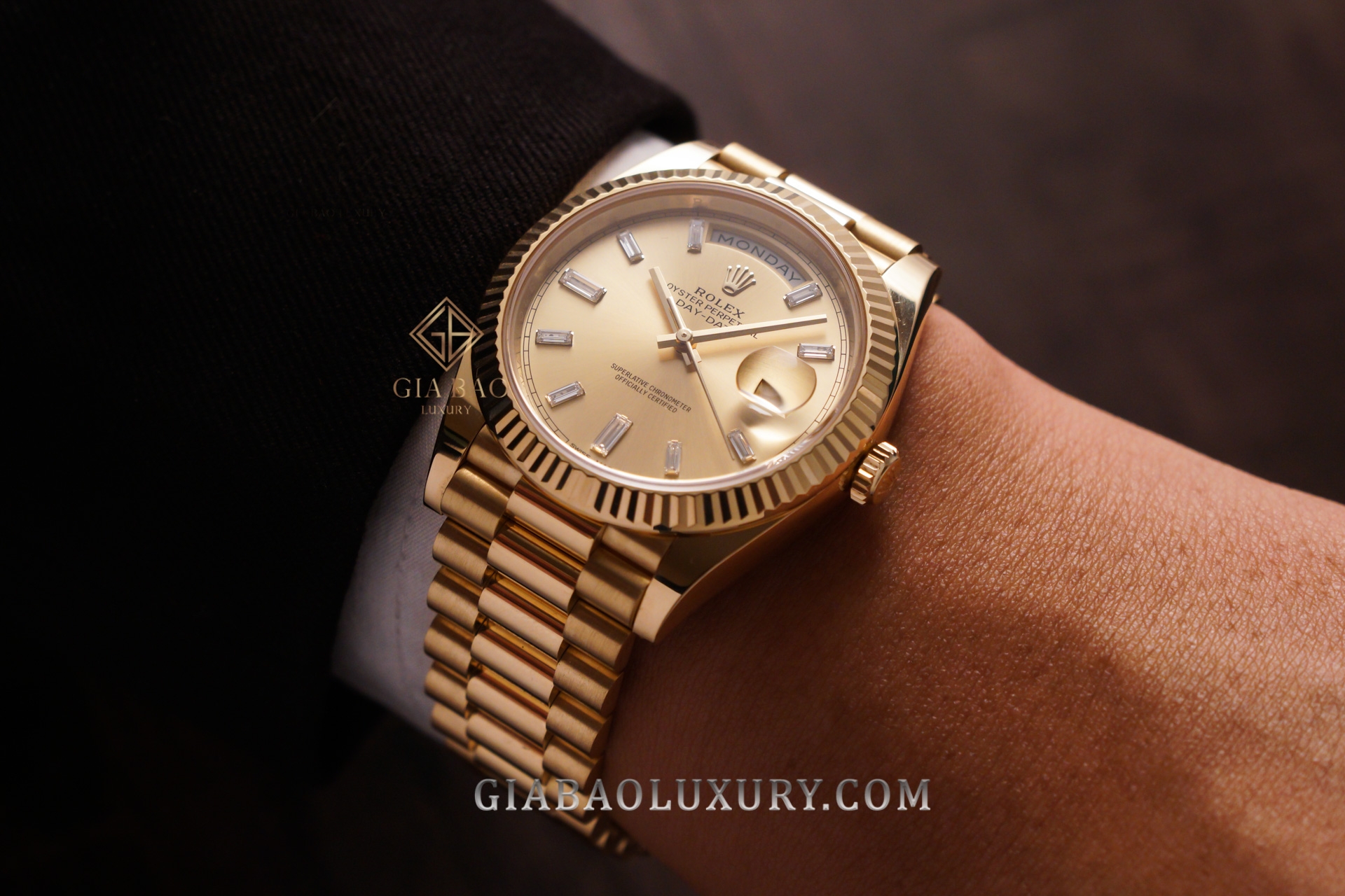 Với dòng Day-Date 40, tất cả các cọc số kim cương đều là kim cương ống Baguette. Lý do của điều này là vì Day-Date 40 có mặt số rộng rãi hơn, đặt được nhiều chi tiết hơn.