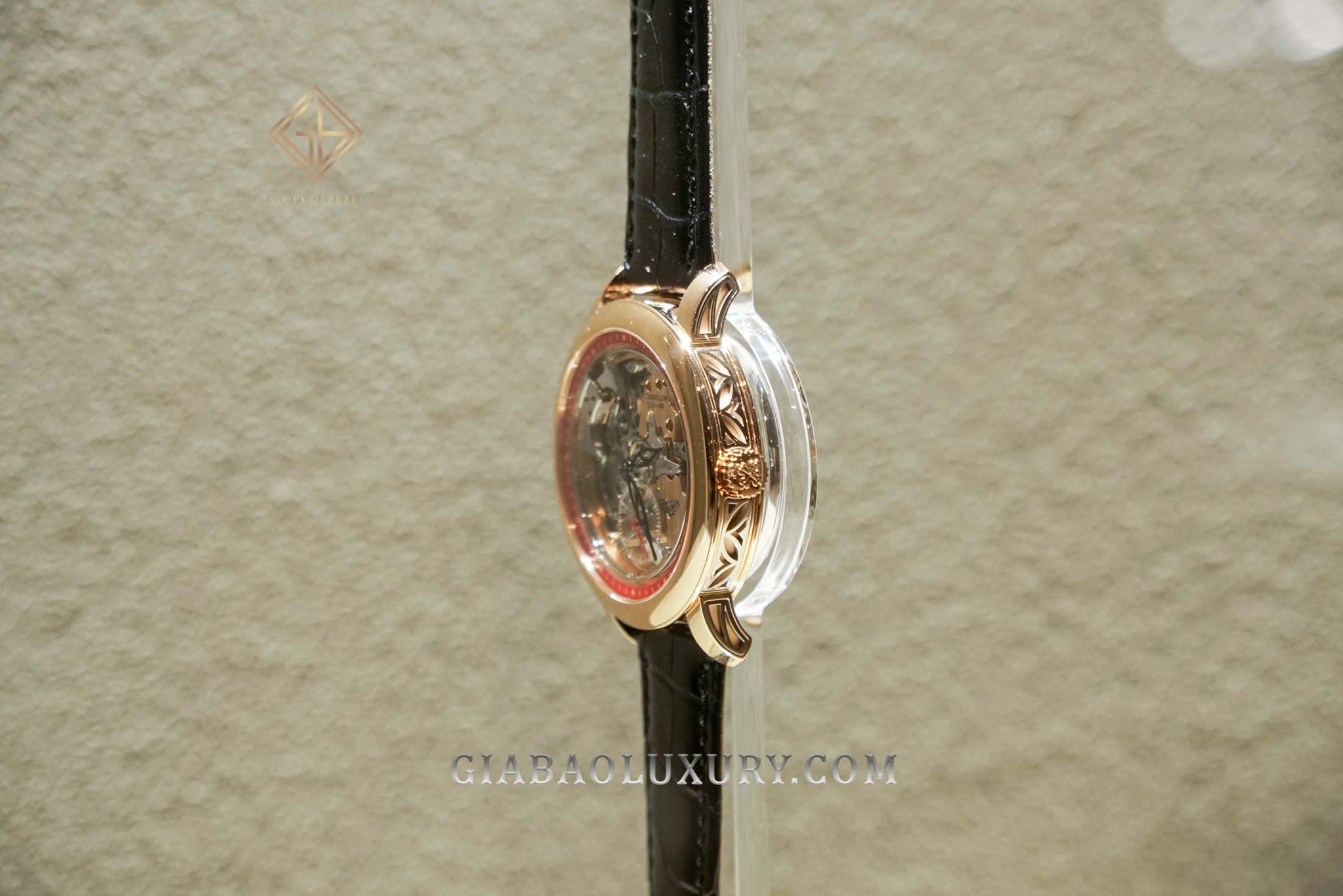 Khác biệt với chiếc 6102, chiếc 6104 sở hữu thiết kế có phần rực rỡ và cuốn hút hơn. Bộ vỏ khung có kích thước 38,3mm được hãng chế tác từ chất liệu vàng hồng nguyên khối 18k và vành bezel khảm 38 viên kim cương Baguette lấp lánh được chế tác hoàn hảo, giúp tôn lên sự cuốn hút của mặt số đen huyền bí ở phiên bản lịch thiên văn học này.