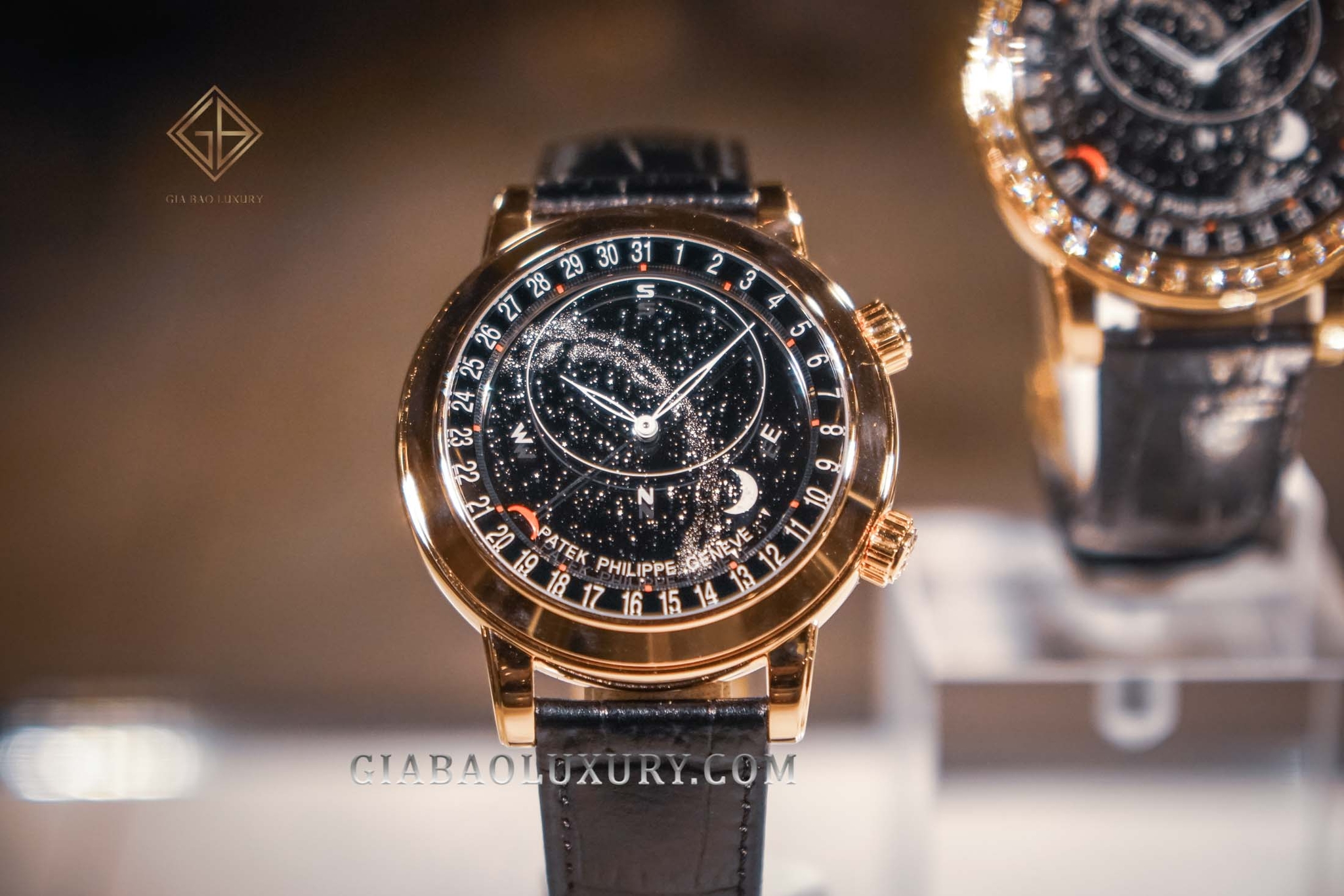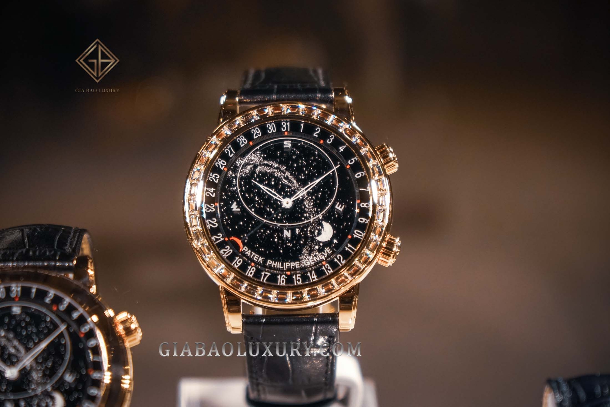Tiếp đến là tủ kính trưng bày những mẫu thuộc dòng Celestial (đồng hồ thiên văn), trong đó ta không thể bỏ qua 2 tuyệt phẩm 6104 và 6102. Chiếc Patek Philippe Grand Complications 6102 Sky Moon Celestial lần đầu được ra mắt vào năm 2015. Sở hữu diện mạo mang đậm phong cách đỉnh cao của Patek Philippe, 6102 có bộ vỏ tròn với đường kính lớn lên tới 44mm.