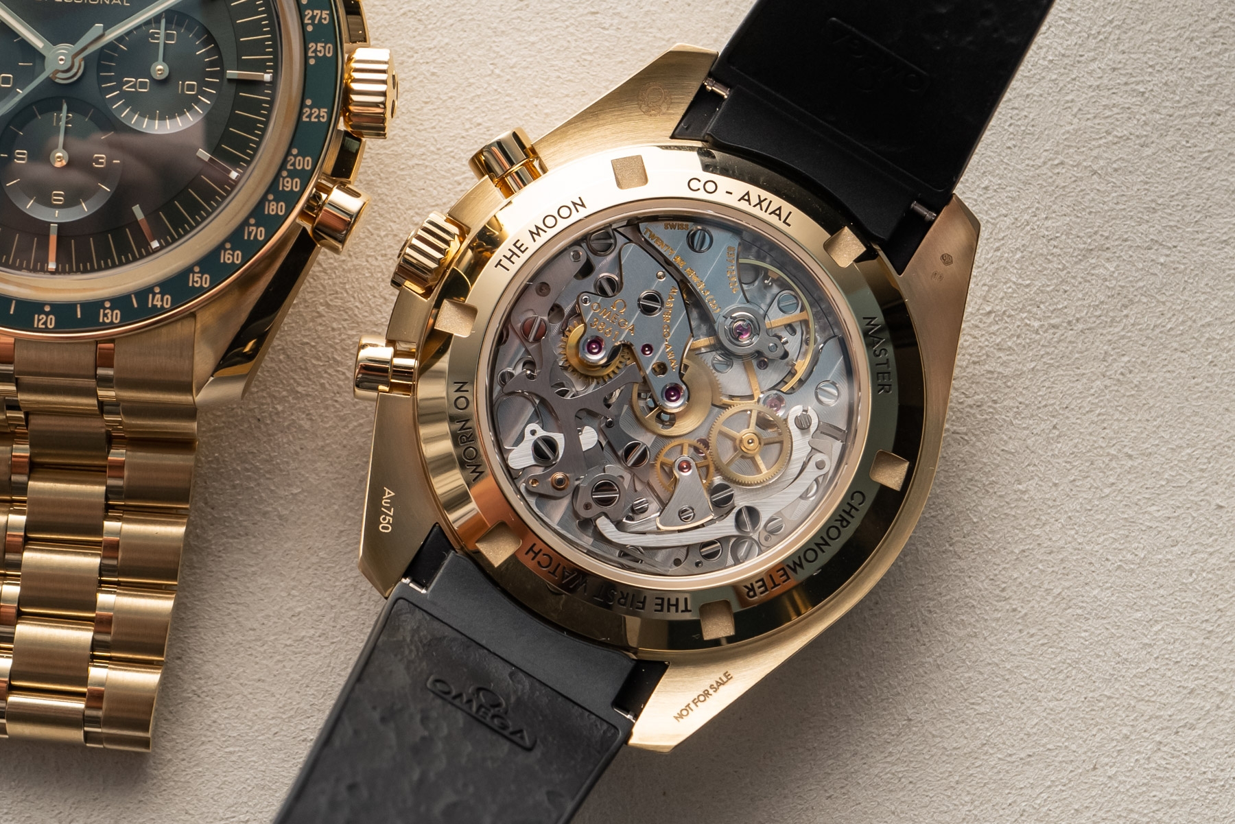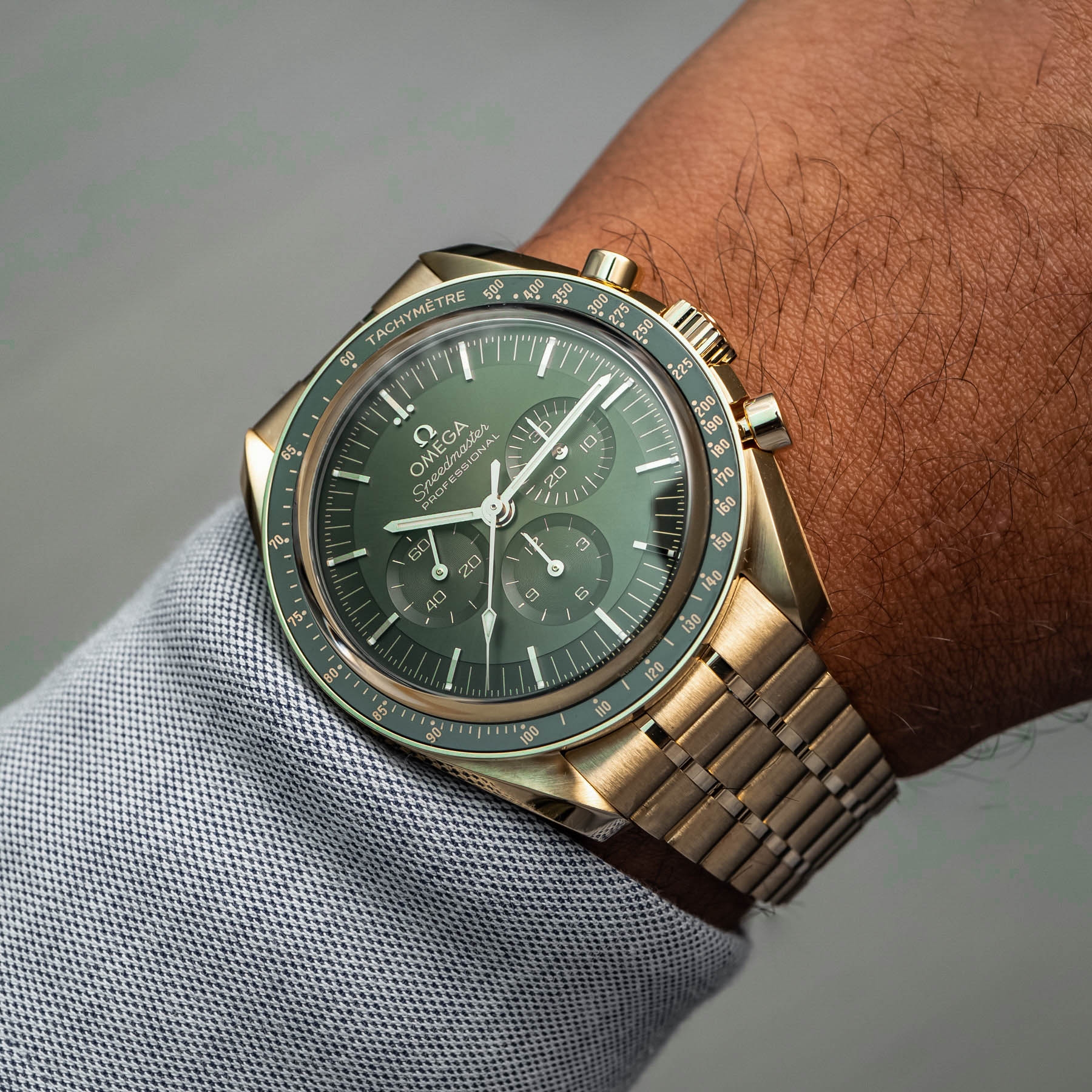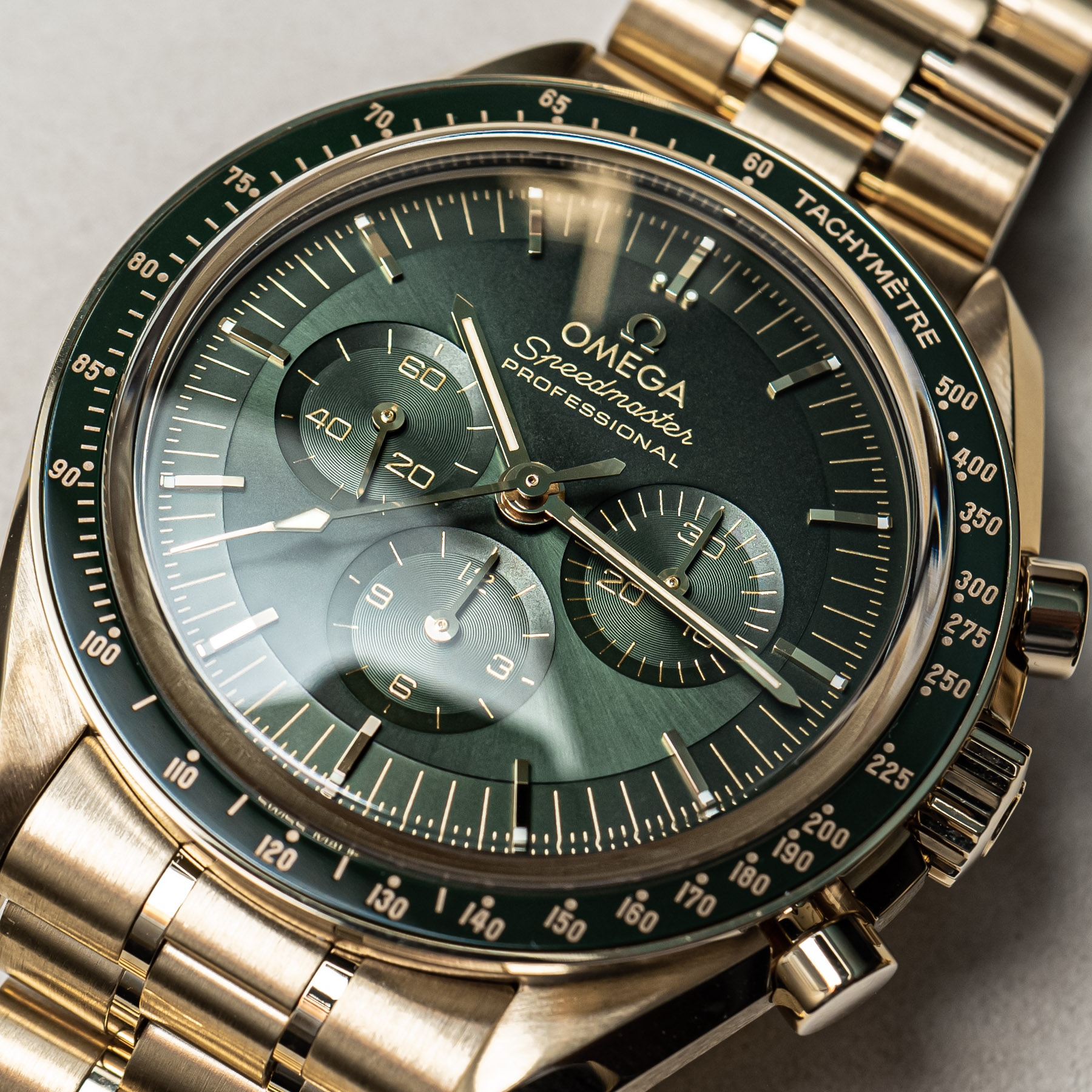 Tại sao Omega Speedmaster Moonwatch Professional Moonshine lại được xem lựa chọn đồng hồ chronograph mới đáng kỳ vọng năm 2022 dù mới phát hành? Nhìn vào mức giá, đồng hồ Omega Speedmaster Moonwatch Moonshine Gold với mặt số “Panda Gold” có giá 26.400 USD cho dây đeo cao su và 36.500 USD cho dây đeo bằng vàng nguyên khối, và mẫu mặt số màu xanh lá cây có giá 24.600 USD trên dây da màu xanh lá và 34.800 USD đối với dây vàng nguyên khối, thì không cần phải giải thích.