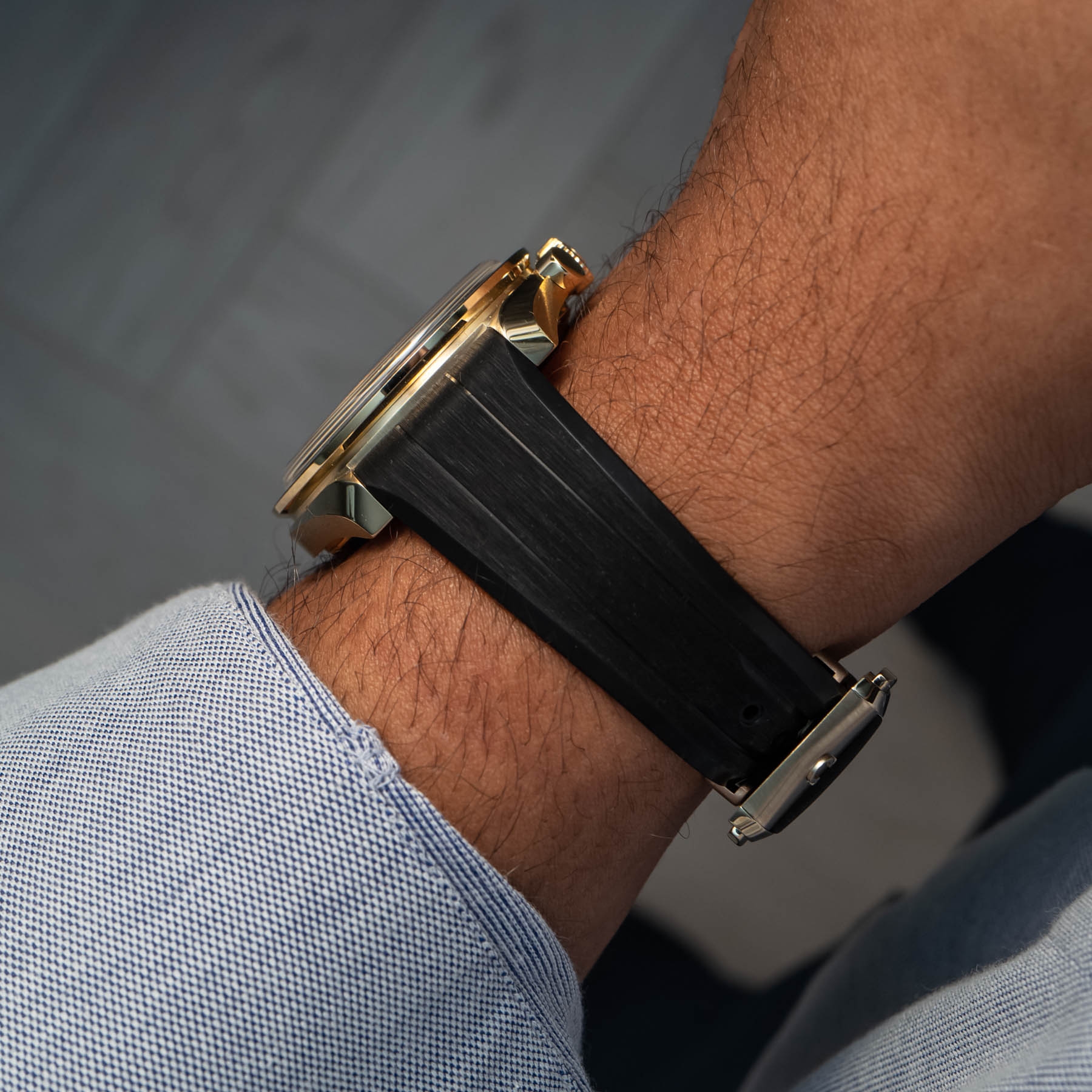 Không cần tranh cãi, sự kết hợp vỏ vàng và dây kim loại luôn khiến một chiếc đồng hồ có thể thu hút được sự chú ý từ đám đông. Đó là những chiếc đồng hồ đại diện cho sự giàu có và địa vị, điều đã được chứng thực rõ ràng từ đồng hồ Rolex President nổi bật. Đổi lại, Speedmaster Moonwatch phiên bản mặt số vàng có dây đeo da lại gợi nên vẻ đẹp tinh tế và khá ý nhị, dành cho những khách hàng muốn giữ lại một phần nổi bật cho mình. Phía cuối của dây đeo là khoá với chức năng có thể mở rộng một đoạn đến 2,3mm tiện ích.