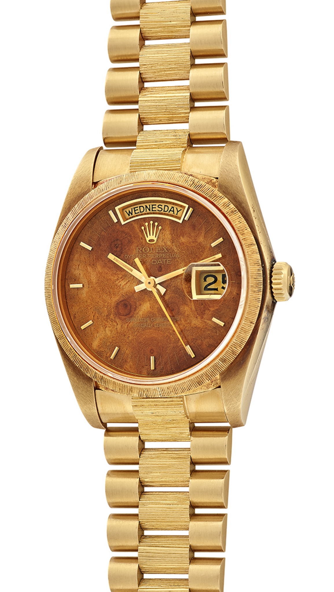 Có một mặt số vân gỗ sang trọng cùng bộ vỏ vàng khối, Rolex Day-Date Corteccia ref. 18078 hiện có giá ước tính là 14.000 đến 25.200 Euro.