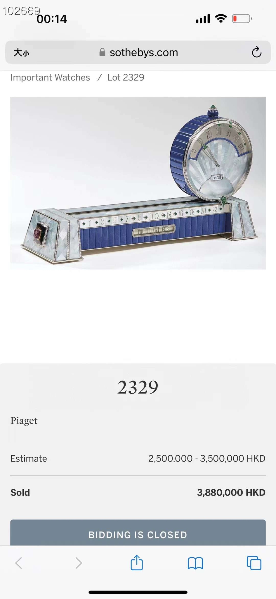 Được sản xuất vào khoảng năm 1990, Piaget Retrograde Sliding Clock là một tác phẩm cơ khí đầy kỳ công và ấn tượng. Chiếc đồng hồ này xuất hiện trong một cuộc đấu giá của đơn vị Sotheby’s vào năm 2014 và được bán với giá 500.300 USD (11,7 tỷ đồng). Và hiện tại, vẫn nằm trong top những chiếc đồng hồ Piaget được bán với giá cao nhất.