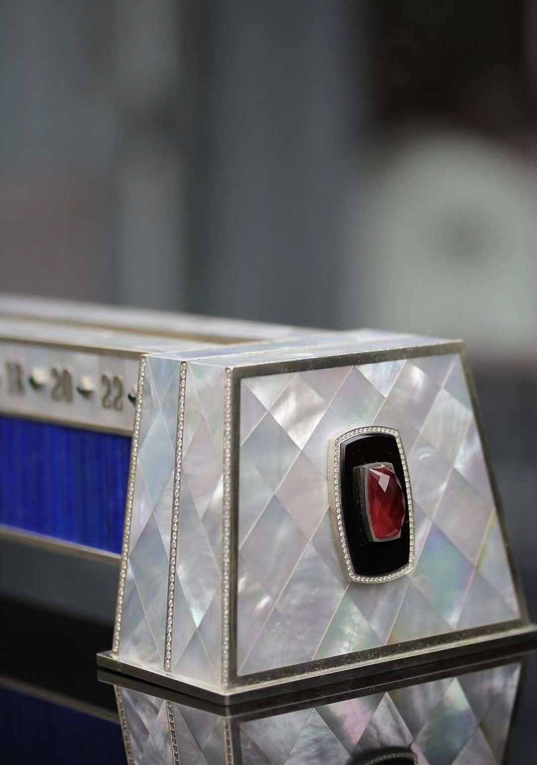 Ngoài tính cơ khí ấn tượng, Piaget Retrograde Sliding Clock còn được trang trí bởi số lượng lớn đá quý thiên nhiên bắt mắt. Có 53,26 carat kim cương (926 viên kim cương), 2 viên hồng ngọc với tổng trọng lượng 34,46 carat, 930g vàng đi kèm 60 viên ngọc lục bảo (11,63 carat), đá lapis lazuli xanh và xà cừ được sử dụng tổng thể thiết kế. Được biết, thương hiệu Piaget đã dành ra 800 giờ lên ý tưởng và thiết kế, 320 giờ gia công, cơ khí và lắp ráp các bộ phận, 330 giờ cắt đá quý và 350 giờ để nạm đá quý lên các bộ phận.