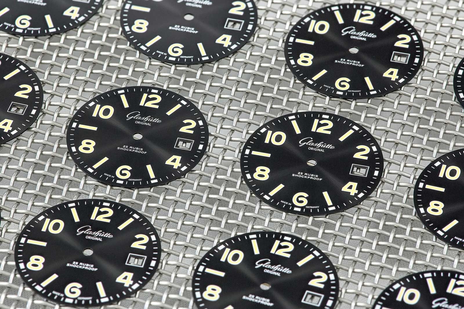 Trái ngược với điều đó, sản xuất mặt số không có các sự lựa chọn khác, ngoài việc phải tự mình làm. Trong nhà máy sản xuất Pforzheim, có 75 bước để hoàn thiện việc sản xuất một chiếc mặt số. Các công đoạn bao gồm: hàn, cắt, chải, đánh bóng, sơn, sơn và thực hiện bất kỳ phương pháp nào khác cho đĩa Lịch tuần trăng, hoặc làm một mặt số hiện đại lấy nguồn cảm hứng từ những năm 1960. Sai số xuất hiện trong quá trình gần như là bằng 0.