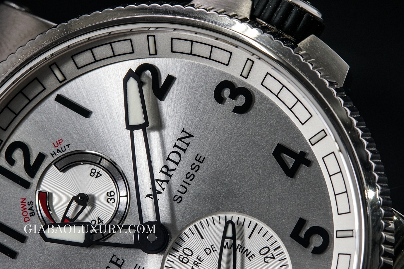Còn ở góc 6h, ta có mặt số phụ và kim hiển thị 60 giây, cùng với đó là một cửa sổ nhỏ thông báo lịch ngày cho chủ nhân chiếc đồng hồ. Cũng trên mặt số phụ này là tên cỗ máy UN 118 cùng dòng chữ Chronometre De Marine được chạm khắc vòng rất tinh xảo.