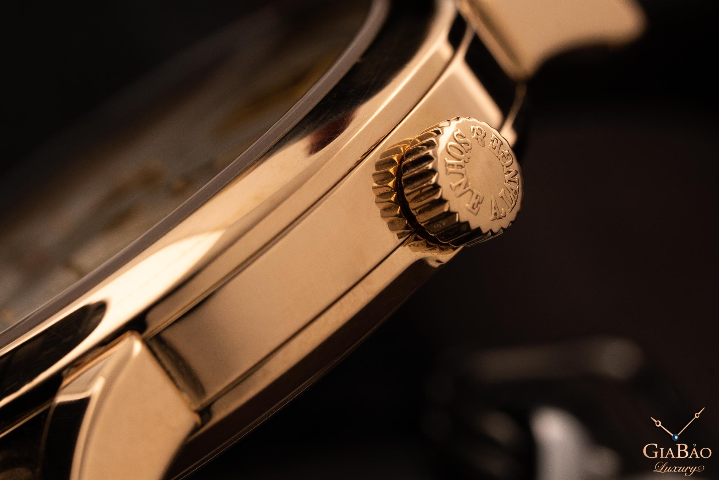 Toàn bộ hệ thống máy móc phức tạp, mặt số cầu kỳ đó được bao bọc bởi lớp vỏ bằng vàng hồng có đường kính 38.5mm (bộ máy có đường kính 30.6mm). Bộ vỏ đồng hồ cũng được thiết kế theo phong cách đơn giản nhưng cũng rất tinh xảo. Từng cạnh đều được đánh bóng cẩn thận, những góc nhọn thì được vát đều, tạo cảm giác dễ chịu cho người đeo. Bên cạnh núm chỉnh giờ quen thuộc ở góc 3 giờ, chúng ta có thêm nút bấm ở góc 10 giờ với nhiệm vụ chỉnh ngày như tôi đã nói ở trên.