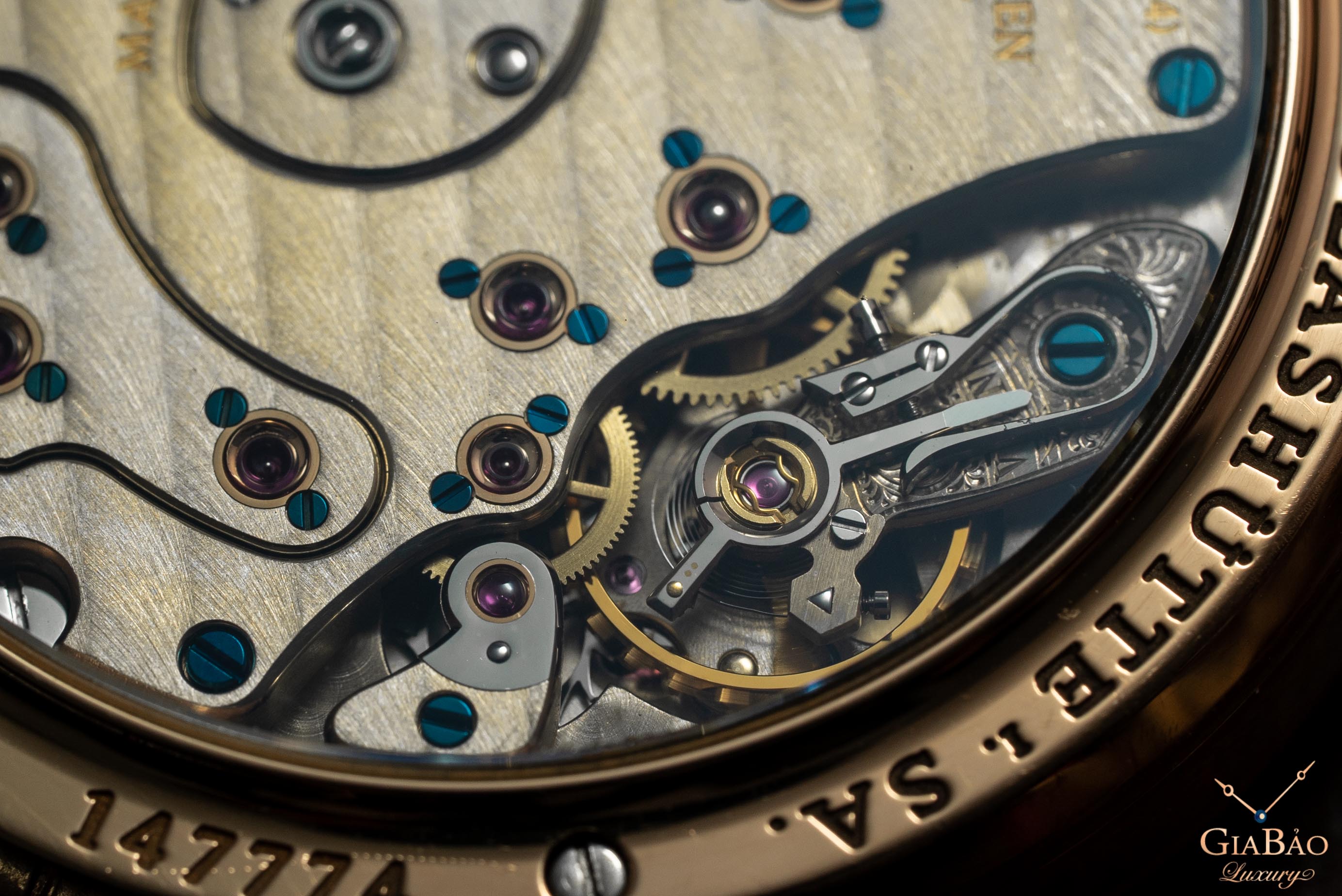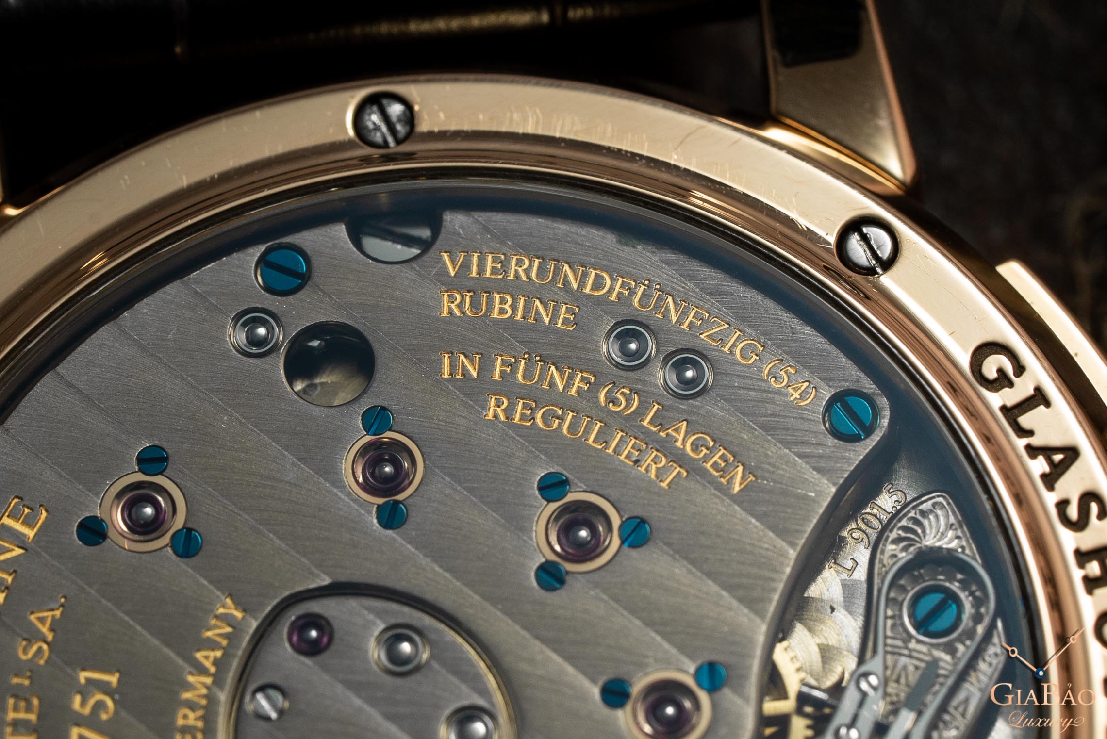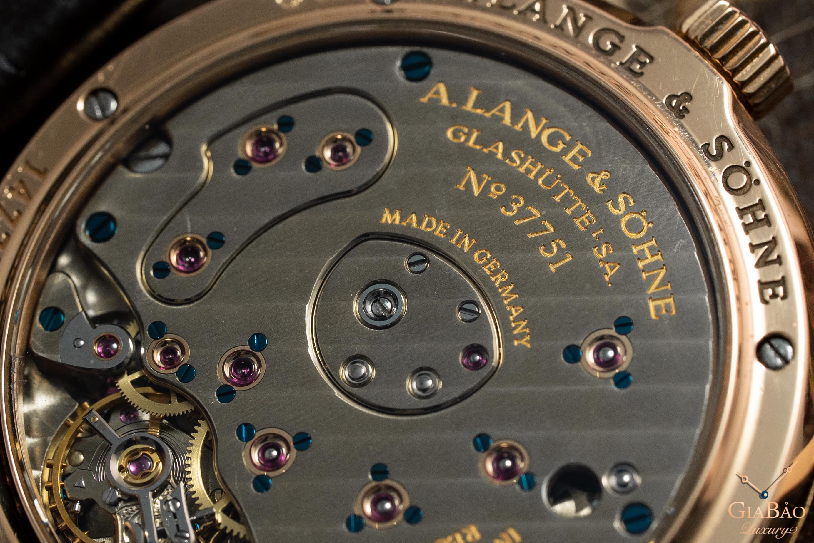 Điều khiển tất cả những tính năng phức tạp trên chính là bộ máy Caliber L901.5 được sản xuất in-house hoàn toàn bởi A. Lange & Sohne. Từ mặt kính Sapphire phía sau, bạn có thể dễ dàng quan sát được độ hoàn thiện tinh vi của bộ máy này. Phần lớn bộ máy được che phủ bởi cầu nối 3/4 đặc trưng của người Đức, nhưng chúng ta vẫn có thể quan sát được những chi tiết quan trọng nhất.