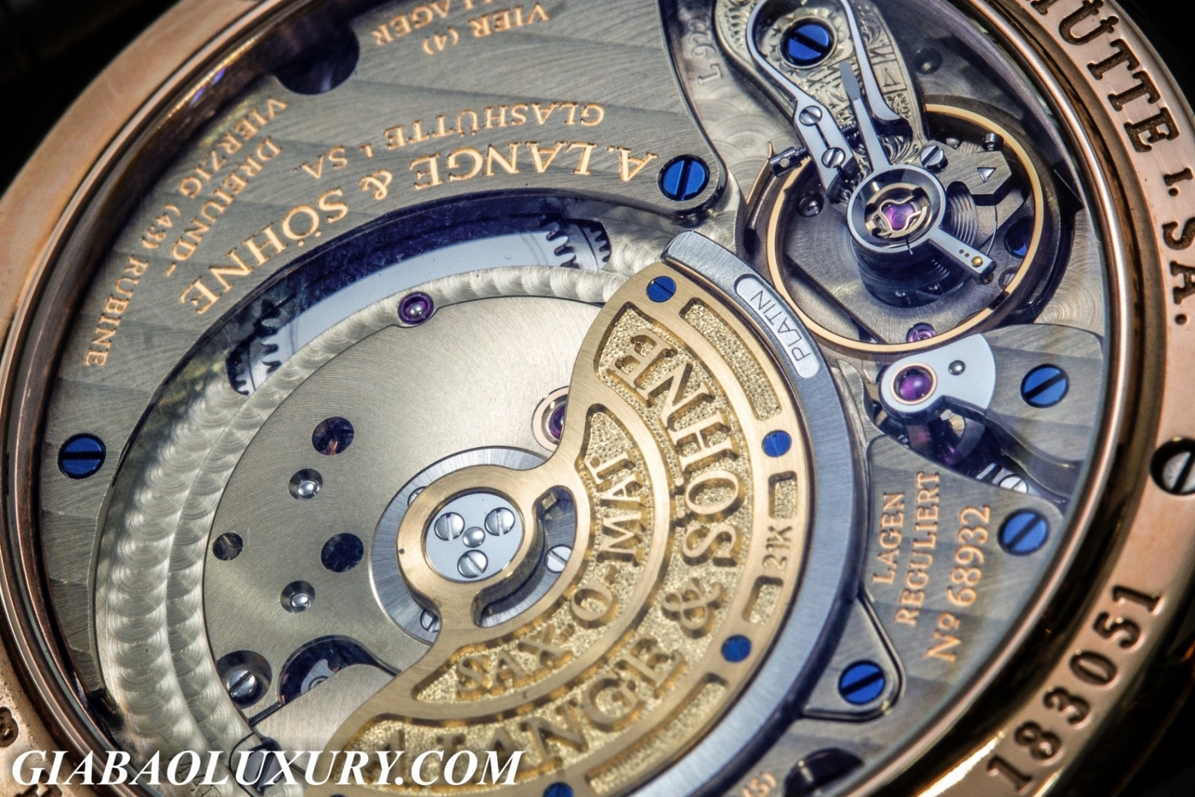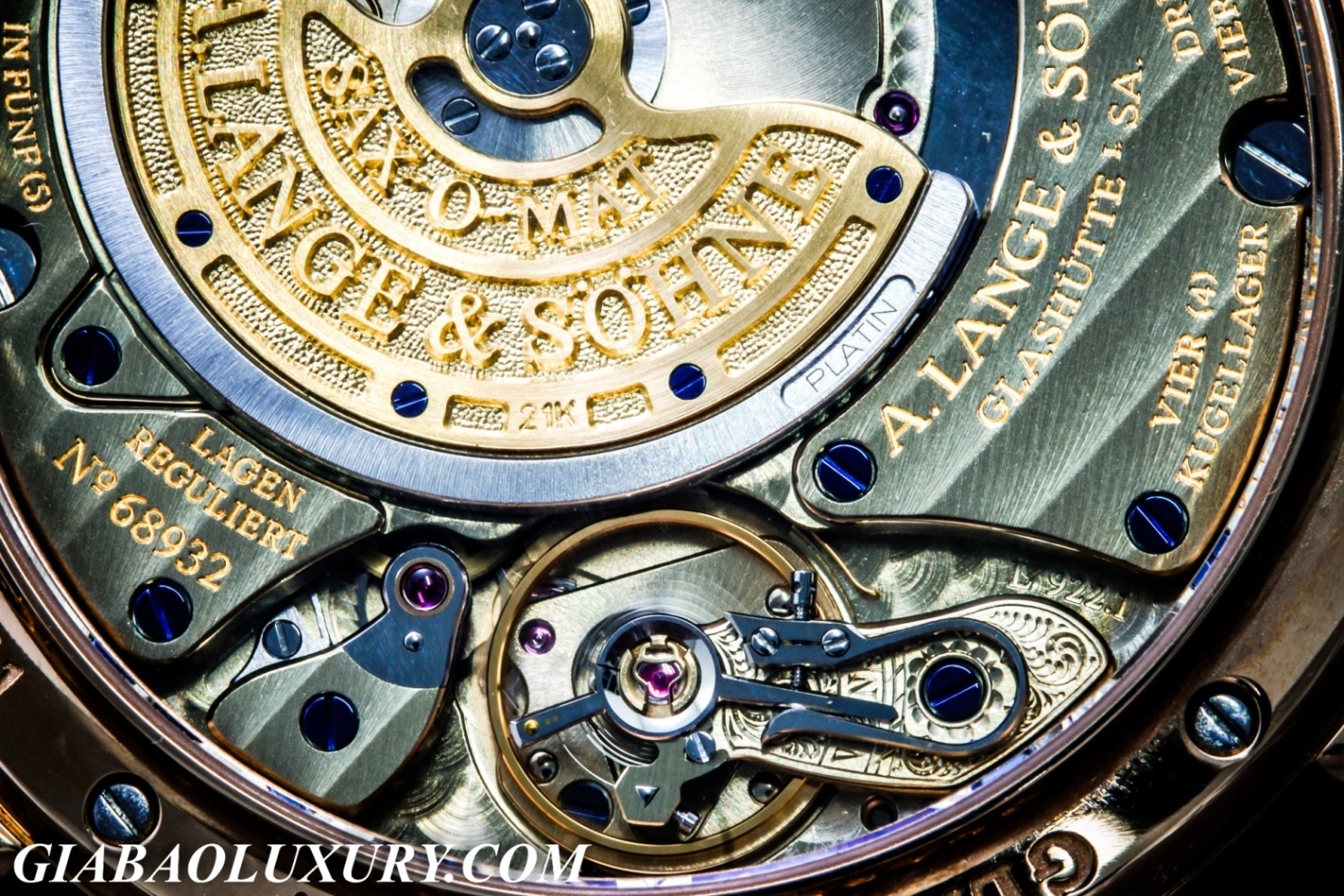 Bộ máy đồng hồ được cấu thành từ 478 linh kiện được xử lý một cách cực kỳ cẩn thận và tinh tế, đúng với phong cách thường thấy của A. Lange & Söhne, trong đó có con lắc làm từ vàng 21k với vành ly tâm làm từ Platinum.