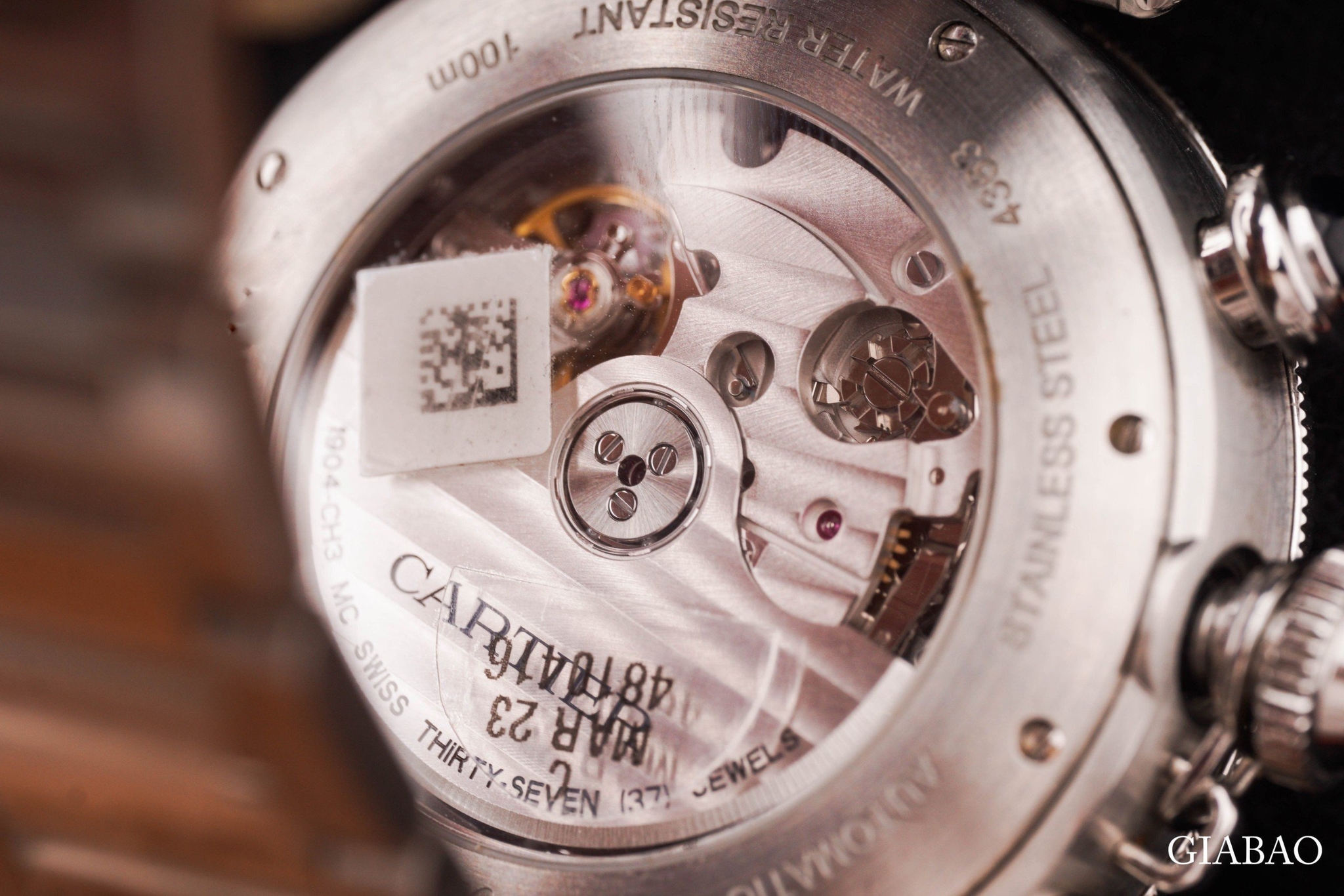 Bên trong đồng hồ Pasha de Cartier Chronograph là bộ máy tự động 1904-CH MC do Cartier sản xuất in-house. 1904-CH MC là bộ máy chronograph có cấu trúc bánh xe cột, ly hợp dọc nên cảm giác thao tác nút bấm thật sự mượt mà, dễ chịu mà lại chính xác. Đồng hồ có hai hộp cót, nhưng chỉ duy trì năng lượng hoạt động được trong vòng 47 giờ.