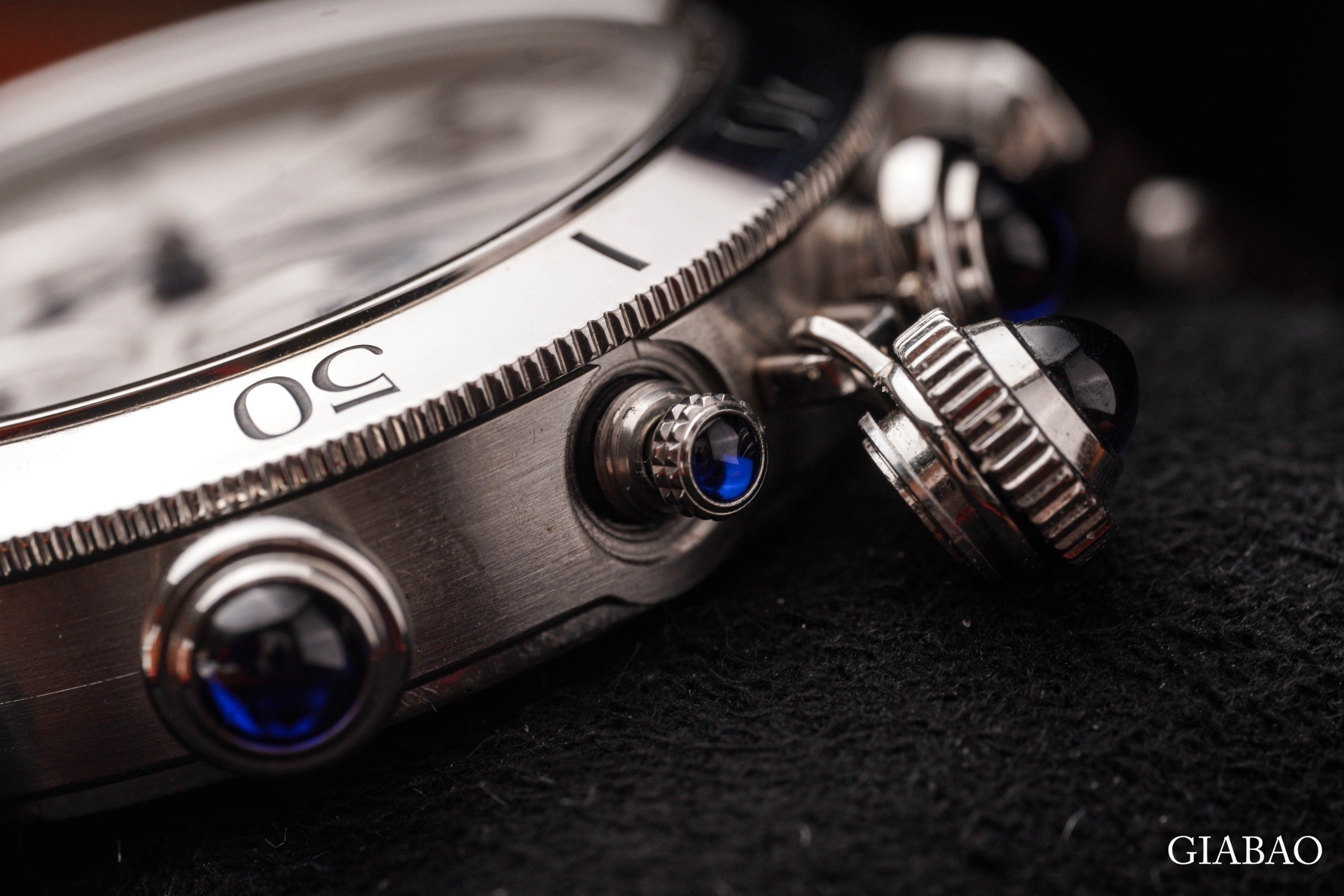 Những nút bấm với đá cabochon bên trên đã tiết lộ chức năng chính của Pasha De Cartier WSPA0018. Đúng vậy, đây là một chiếc đồng hồ có chức năng chronograph với các mặt số phụ phân bổ ở vị trí 3, 6 và 9 giờ. Và bởi các mặt số phụ chiếm phần lớn diện tích nên các cọc số đã được thay đổi. Nhà sản xuất chỉ giữ lại số Ả Rập ở vị trí 12 giờ.