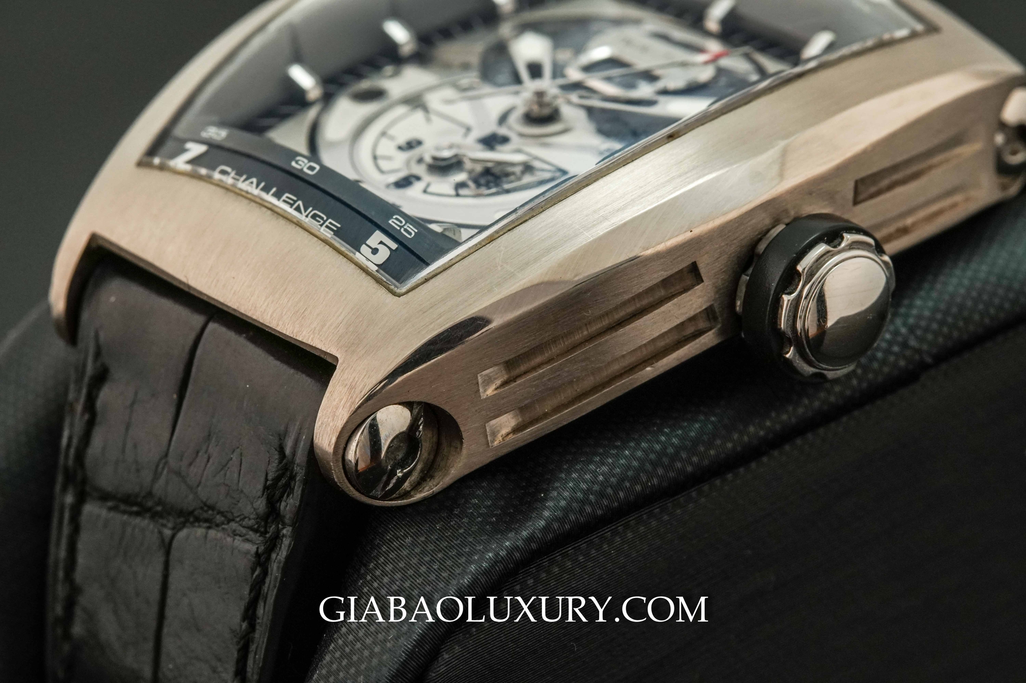 Bộ vỏ khung nguyên khối và kết cấu dây đeo da chuyển động linh hoạt, được cố định bằng bốn đinh ốc cũng bằng vàng trắng đã được đánh bóng khiến CVSTOS Challenge Twin Time nằm trọn trên cổ tay, mặc dù có kích thước lớn và nặng. Đặc biệt khi đi kèm dạng khóa bướm, muốn mở khóa, chỉ cần bấm vào chốt đặt tại hai bên, kích hoạt cơ chế tự mở của khóa đeo, nhà sản xuất đã đánh tan mọi nỗi lo lắng về tuột dây đeo. Trên bề mặt hai mảnh khóa được làm xếp mờ là tên thương hiệu CVSTOS nổi bật.