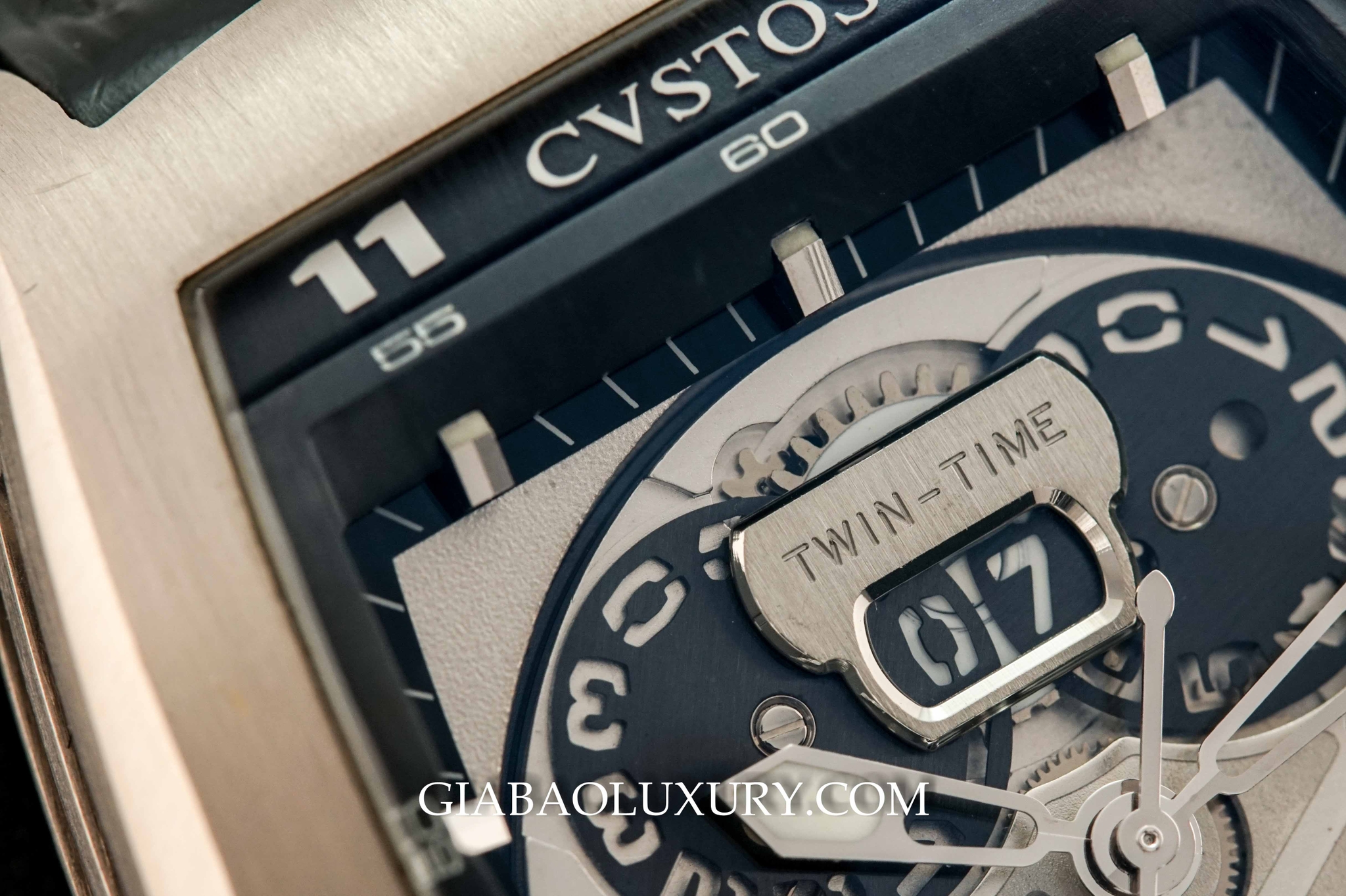 Nhờ sở hữu kích thước tương đối lớn, nên mặt số của chiếc CVSTOS Challenge Twin Time có diện tích khá lớn để trình diễn về mặt nghệ thuật cái đẹp lẫn công nghệ. Tại góc 12 giờ là hai đĩa chỉnh ngày riêng biệt. Việc sử dụng hai đĩa chỉnh ngày sẽ khiến nhà chế tác thêm mức độ phức tạp cho bộ máy phía dưới. Đặc biệt, sẽ là một trải nghiệm tuyệt vời khi được chiêm ngưỡng cú chuyển mình ngoạn mục từ ngày 9 đến ngày 10, ngày 19 đến 20 hay 29 đến 30 ở cả hai bánh đĩa. Về mặt trang trí, hai đĩa chỉnh ngày đã được phủ đen, làm khác hẳn trên nền màu bạc xung quanh. Nếu đưa mắt nhìn từ xa đến gần, ắt hẳn mặt số của chiếc Cvstos Challenge Twin Time giống hình một con robot, mà hai đĩa ngày chính là hai con mắt nhìn xuyên thấu màn đêm.