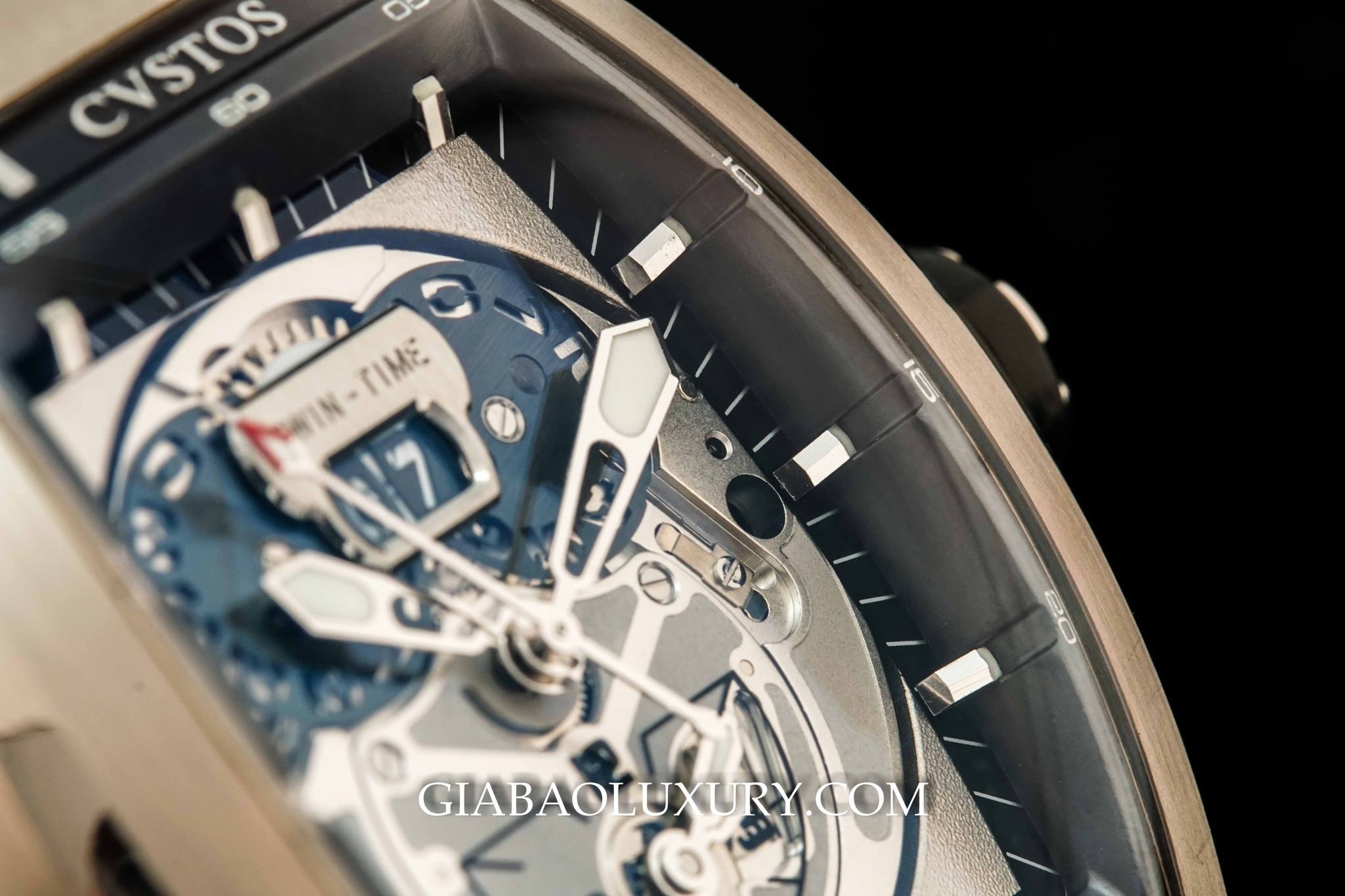 Cái miệng phía dưới chính là mặt số phụ chỉ múi giờ thứ hai – “twin time”, cũng chính là tên của chiếc đồng hồ này. Mặt số nhỏ tại vị trí 6 giờ, được đánh dấu bằng 4 cọc giờ tiêu biểu với dạng số Ả Rập. Hoàn thiện cho mặt số đầy tính biểu tượng của hãng là bộ kim mạnh mẽ và quyết đoán hình dáng của những thanh gươm. Toàn bộ bộ kim đều được phủ chất phát quang. Tuy nhiên, để tránh việc che đi những chi tiết thú vị bên dưới, nhà sản xuất CVSTOS chỉ sử dụng chất phát quang cho một nửa của bộ kim kích thước lớn. Duy có kim giây làm siêu mảnh, với đầu được sơn lớp màu đỏ, nhìn như một ngọn lửa nhỏ đang di chuyển mượt mà vòng quanh.