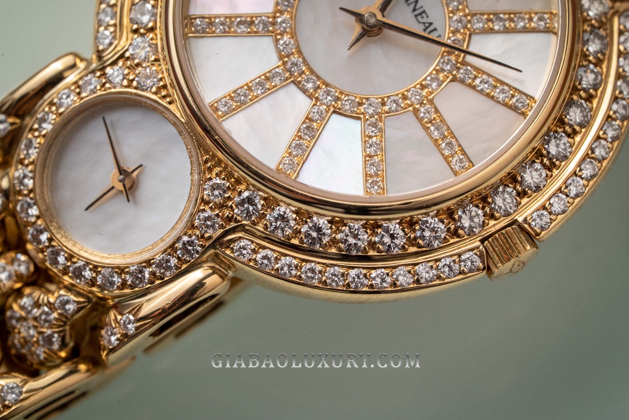 Mặt số chính của chiếc đồng hồ cũng được khảm trai trắng, tuy nhiên người thiết kế đã rất sáng tạo khi tạo nên 12 cọc số chỉ giờ không giống với bình thường. Những cọc số này dài, đồng tâm hướng về vòng tròn trung tâm và cả hai chi tiết này đều được khảm kim cương. Việc “phân vùng” khu giờ trên mặt số sẽ khiến cho từng ô khi ánh sáng chiếu vào sẽ lên ánh màu khác nhau, điều này cũng khá thú vị và đặc biệt.