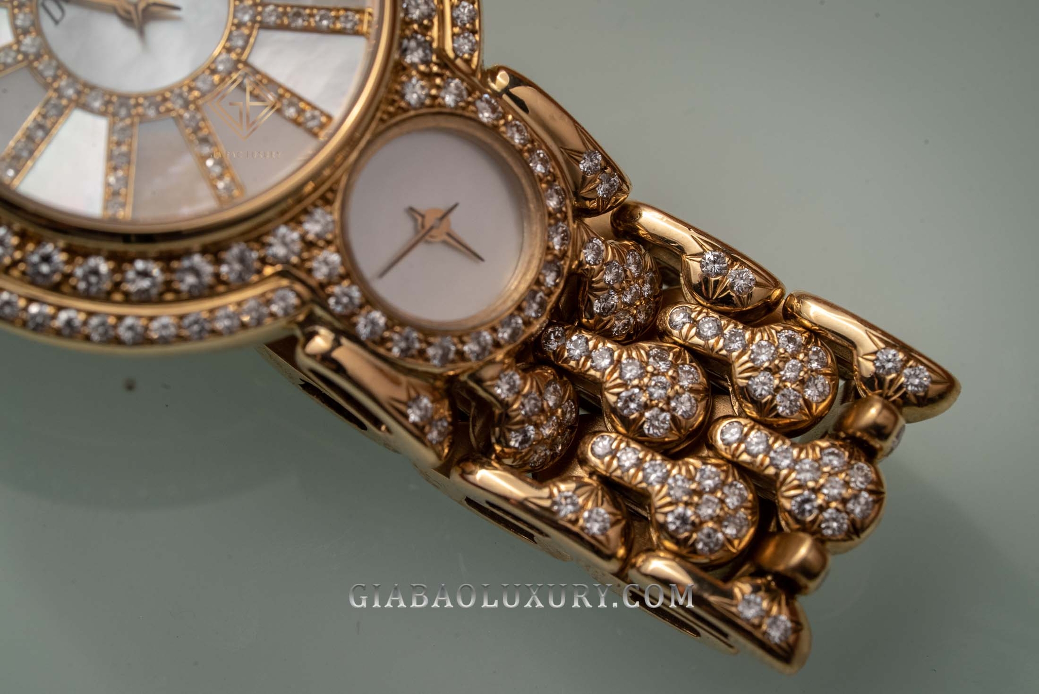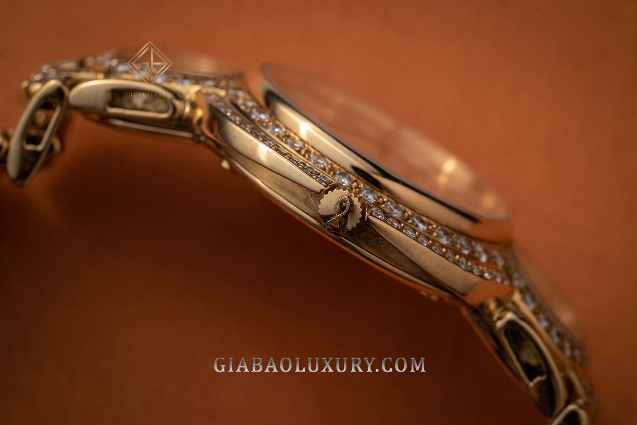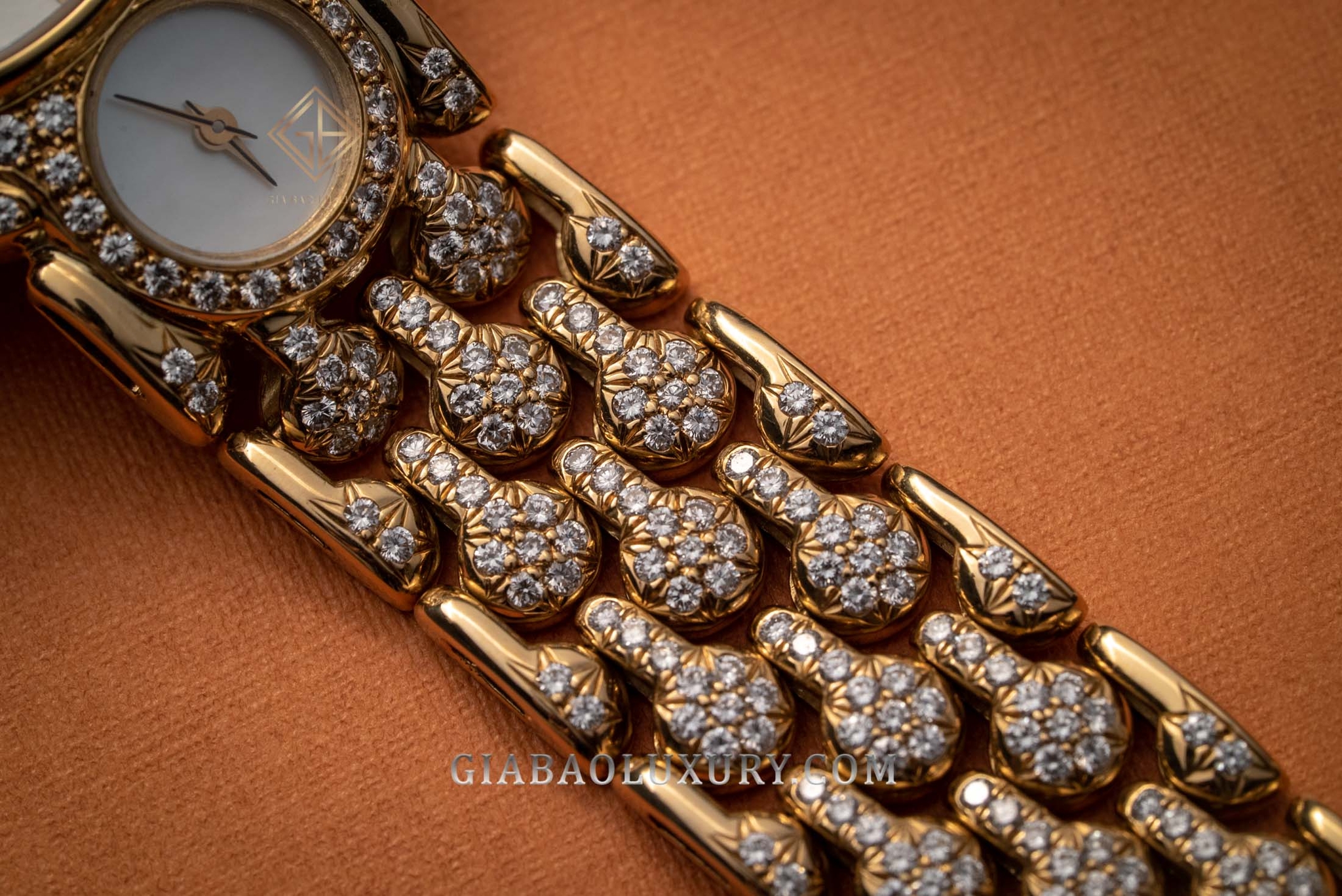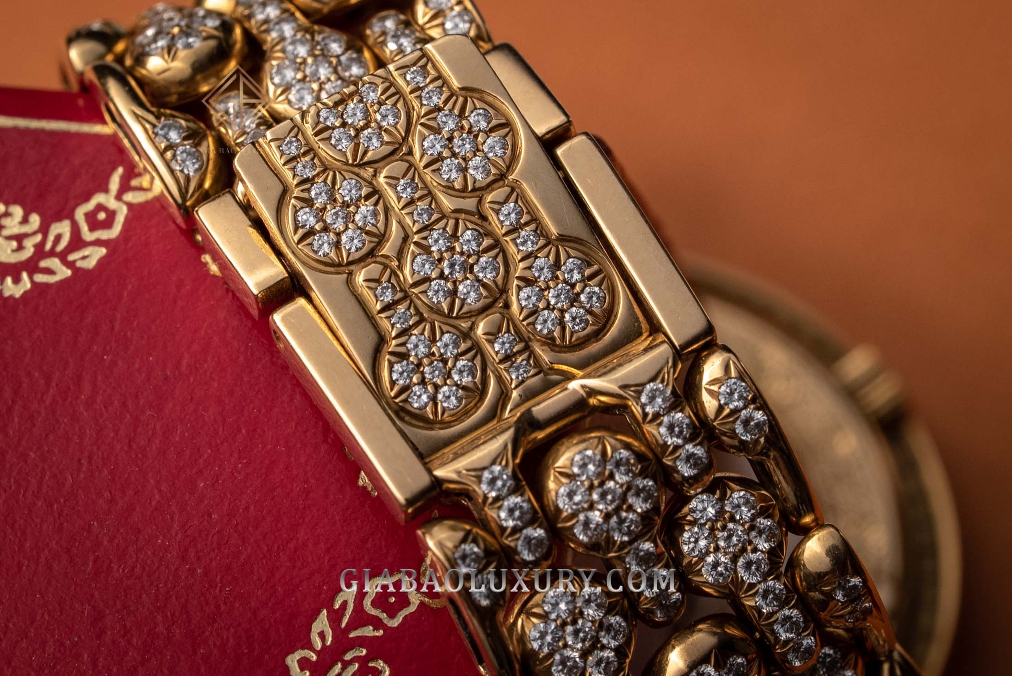 Khi cầm chiếc đồng trên tay, thực sự tôi không thể chê được phần kim cương được khảm trên cả phần khung và dây của chiếc đồng hồ này. Từng mối nối nhỏ của mắt dây với họa tiết hoa đối xứng đều được khảm 10 viên kim cương, phần khung bao trọn mặt số cũng được khảm hai hàng. Từng viên kim cương đều được lựa chọn vô cùng tỉ mỉ, cùng độ sáng, cùng kích thước.