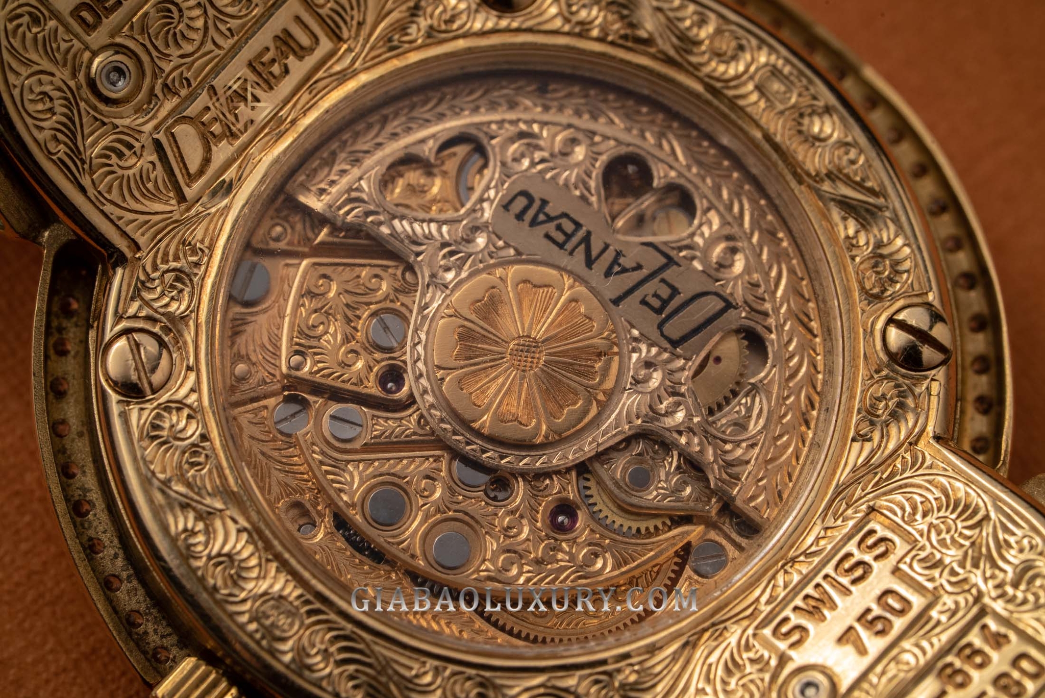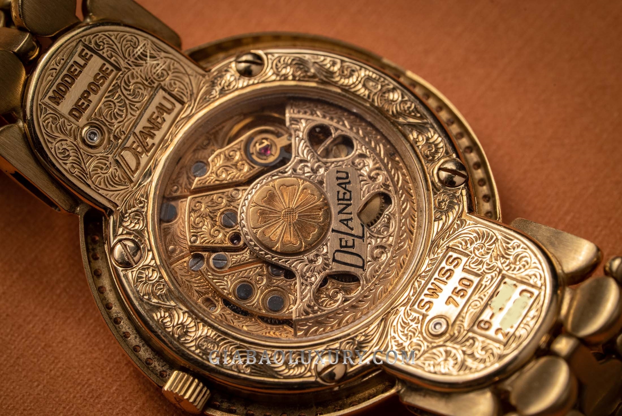 Khi lật mặt trong của chiếc DeLaneau G-664, các mối nối nhỏ đã được đánh bóng cẩn thận giúp cho việc đeo lên tay sẽ không khiến cho cổ tay cảm thấy khó chịu. Phần đáy của mặt số chính và 2 mặt số phụ đã được khắc thủ công vô cùng tỉ mỉ. Nhìn qua tôi cứ nghĩ rằng chiếc đồng hồ không lộ máy mà là cả một tấm lớn được khắc vân hoa nhưng không phải, cả bộ máy automatic điều khiển giờ của mặt số chính với rotor , các tấm cầu, inca-block đều được làm bằng vàng và khắc với các họa tiết hoa rất cổ kính.
