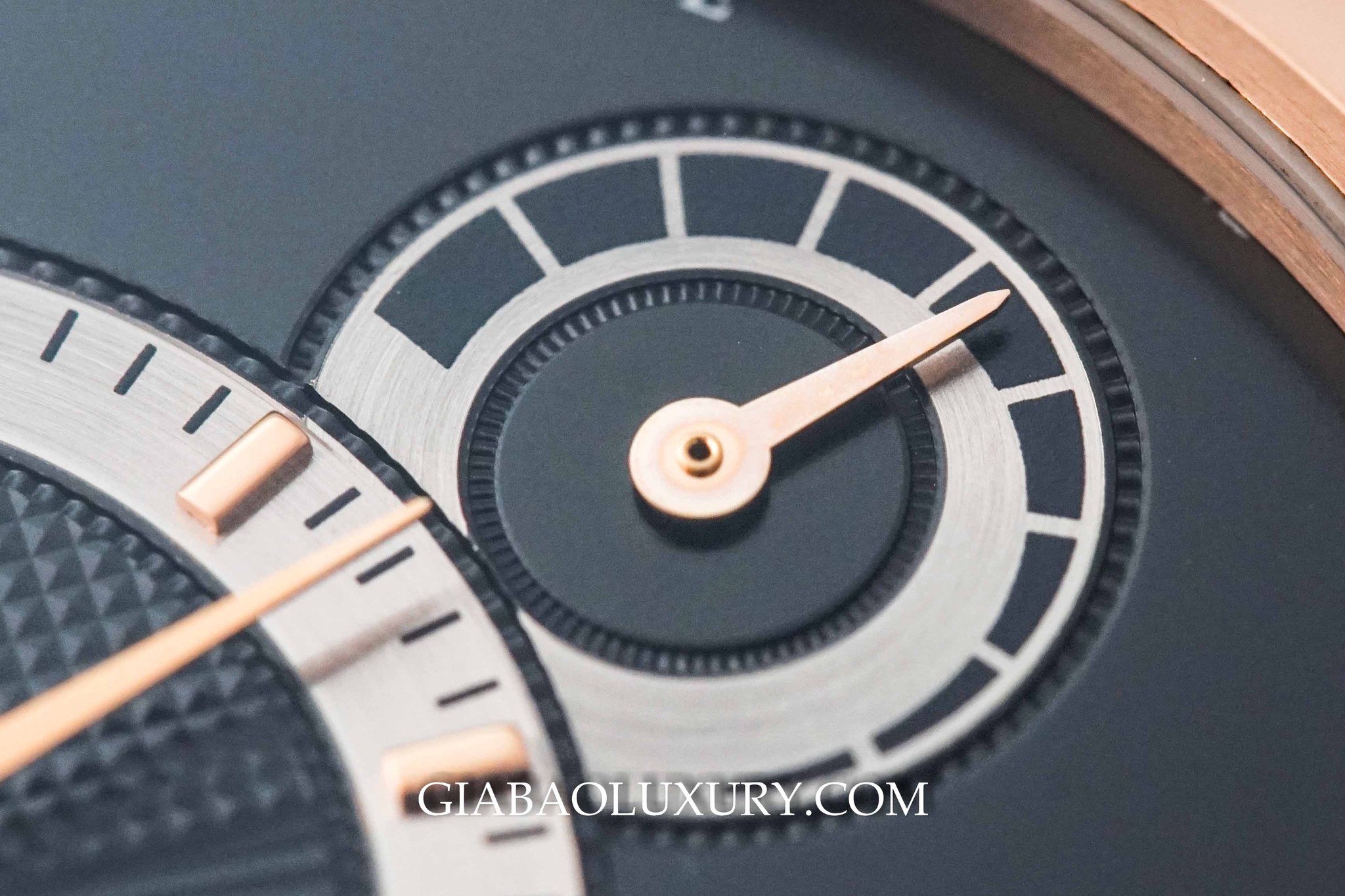 Quay trở lại với chiếc Glashutte Original Panomatic Reserve này. Riêng trong dòng Pano này, dễ dàng có thể nhận ra rằng, thiết kế mặt số được cách điệu theo hướng lệch tâm. Nói cách khác, mặt số được thiết kế theo hướng bất đối xứng đã tạo ra một cái nhìn đầy hiện đại, trẻ trung và mới mẻ. Hai vòng tròn nhỏ được sắp đặt ở vị trí bên trái của mặt số và được thiết kế đối xứng nhau. Điều đó có nghĩa là, diện tích hiển thị thời gian sẽ bị thu hẹp lại một chút. Tuy nhiên, điều này có vẻ không hề gây ra sự khó khăn cho người dùng. Vòng tròn to hiển thị giờ, vòng tròn nhỏ hiển thị giây. Nửa trên của vòng tròn to được thiết kế bằng vân Guilloche, nửa bên dưới lại được cách điệu giống như tia mặt trời. Trong đó, các cọc số và kim cũng đều được chế tác từ vàng hồng nên chiếc đồng hồ này mang vẻ đẹp ấn tượng, mạnh mẽ đầy quý tộc chứ không hề mờ nhạt.