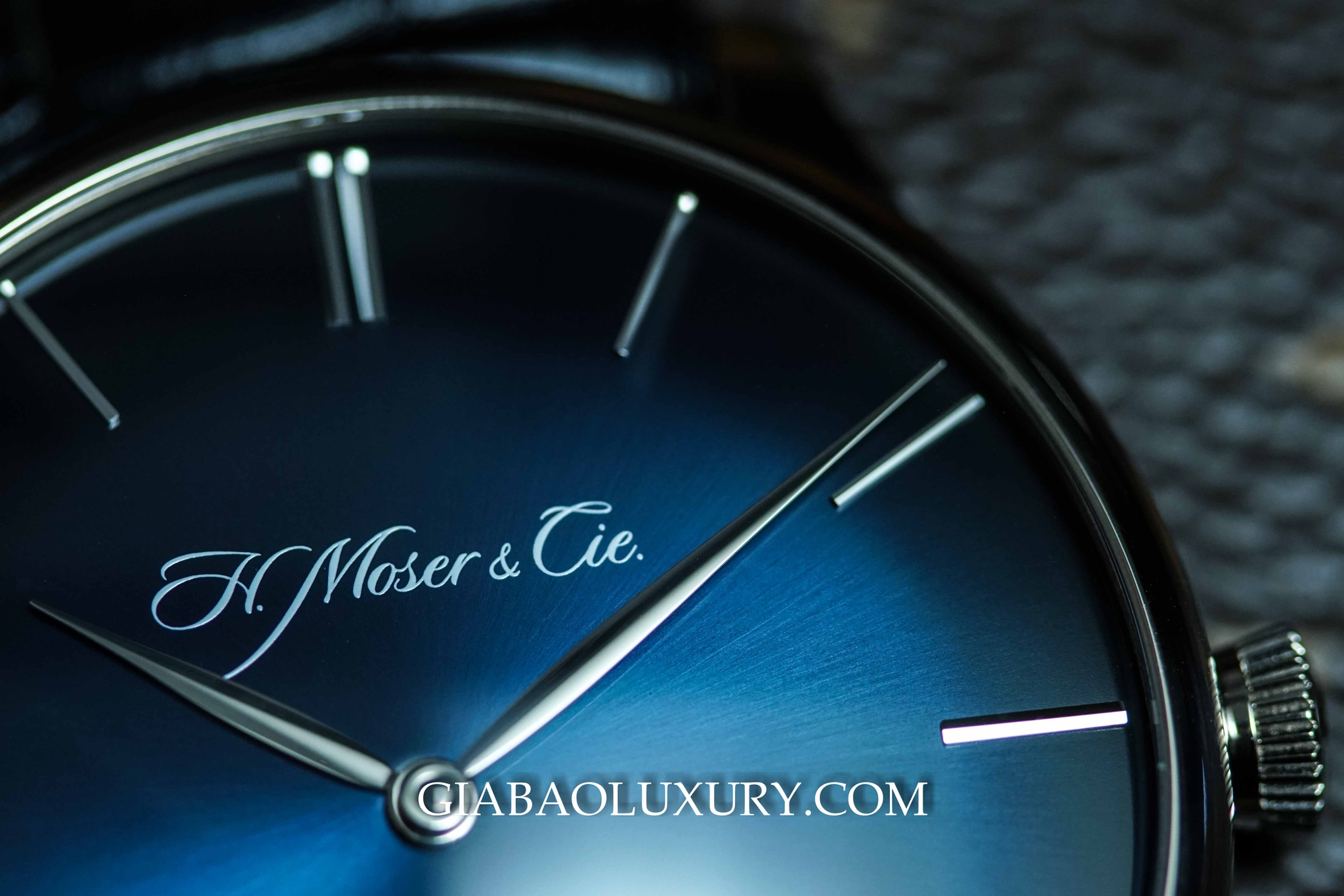Điểm trên mặt số là bộ kim dáng leaf vàng trắng thanh mảnh di chuyển từ từ chậm rãi, như đang dạo chơi trên bầu trời đêm, kết hợp nhuần nhuyễn cùng cọc chỉ giờ in nổi và tên hãng H. Moser & Cie mềm m tại góc 12 giờ.