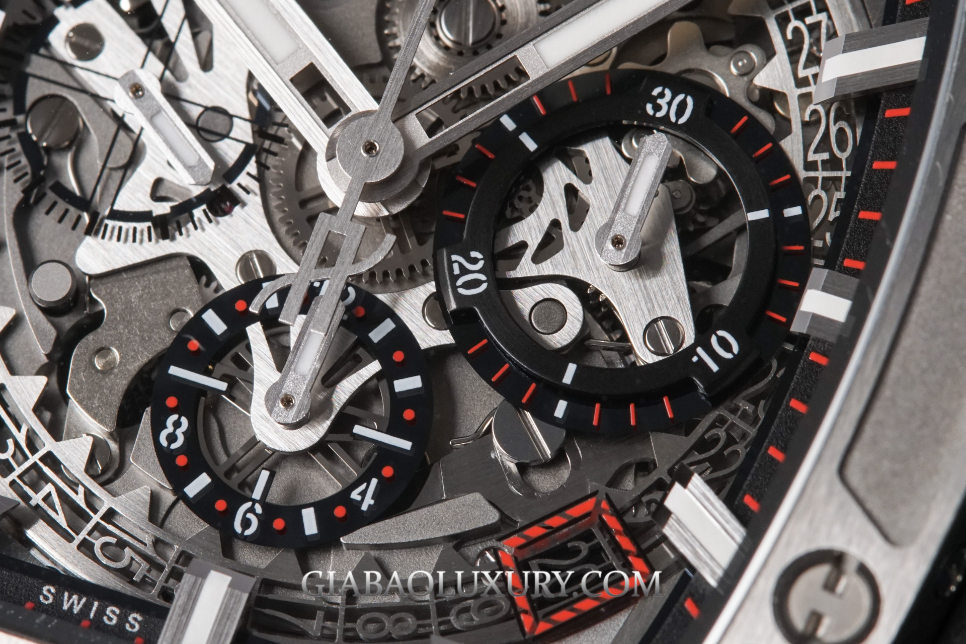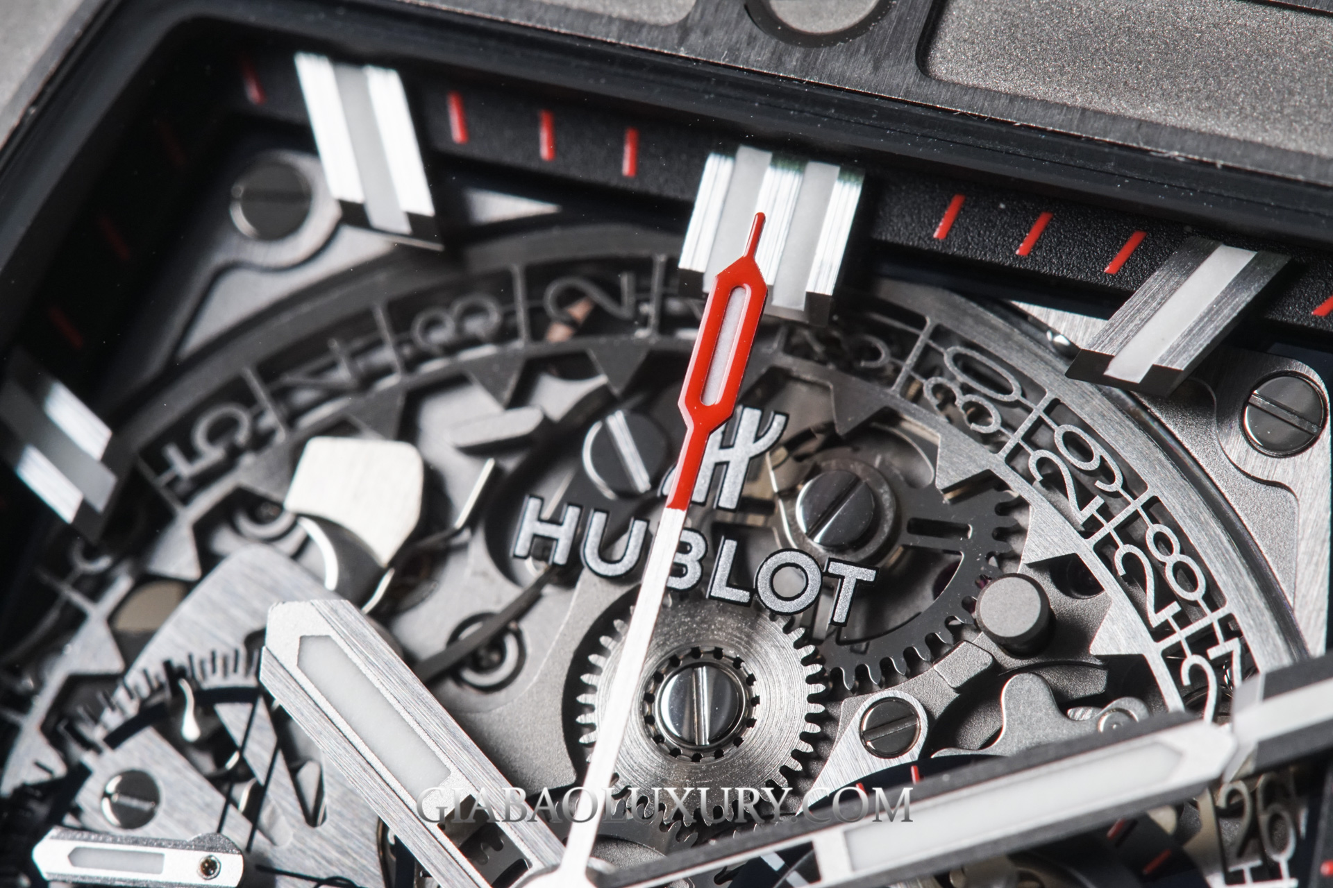Chi tiết lớn nhất và nổi bật nhất trên mặt số chính là đĩa lịch ngày được cắt gọt kỳ công và hiển thị qua cửa sổ màu đỏ ở góc 4 giờ. Nhìn vào kích thước, độ mảnh mai của từng con số, chúng ta có thể dễ dàng thấy được sự chăm chút của Hublot đối với sản phẩm của mình.