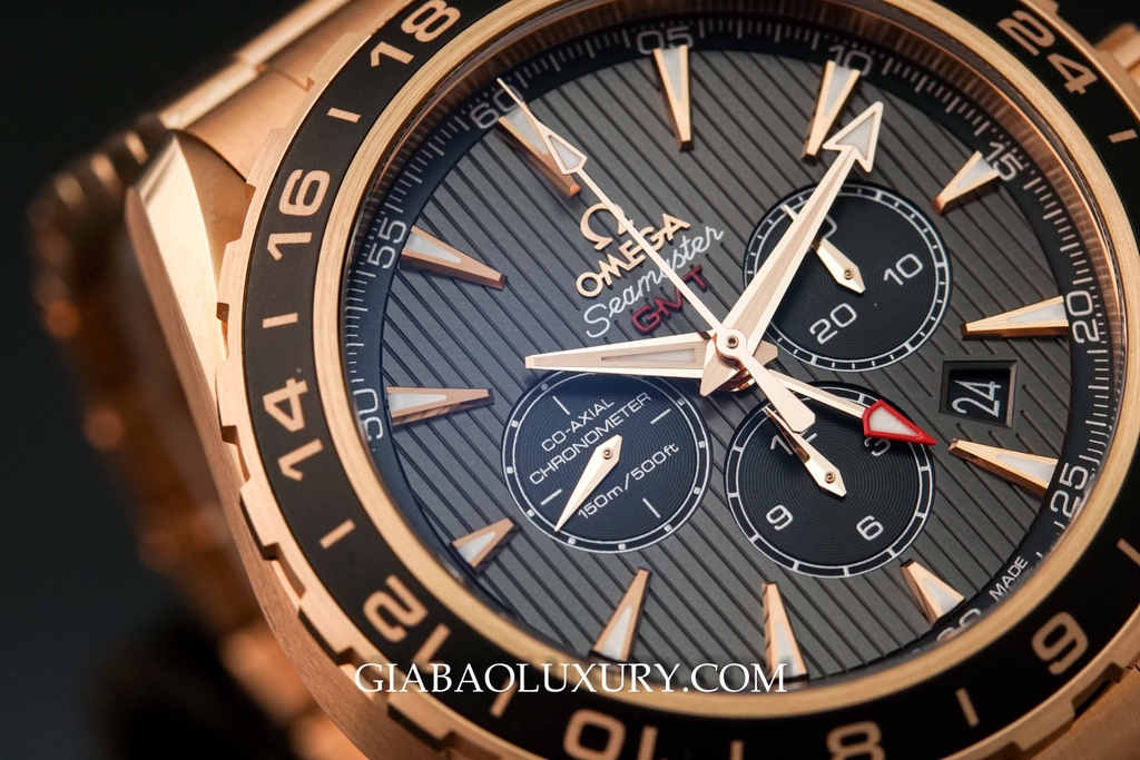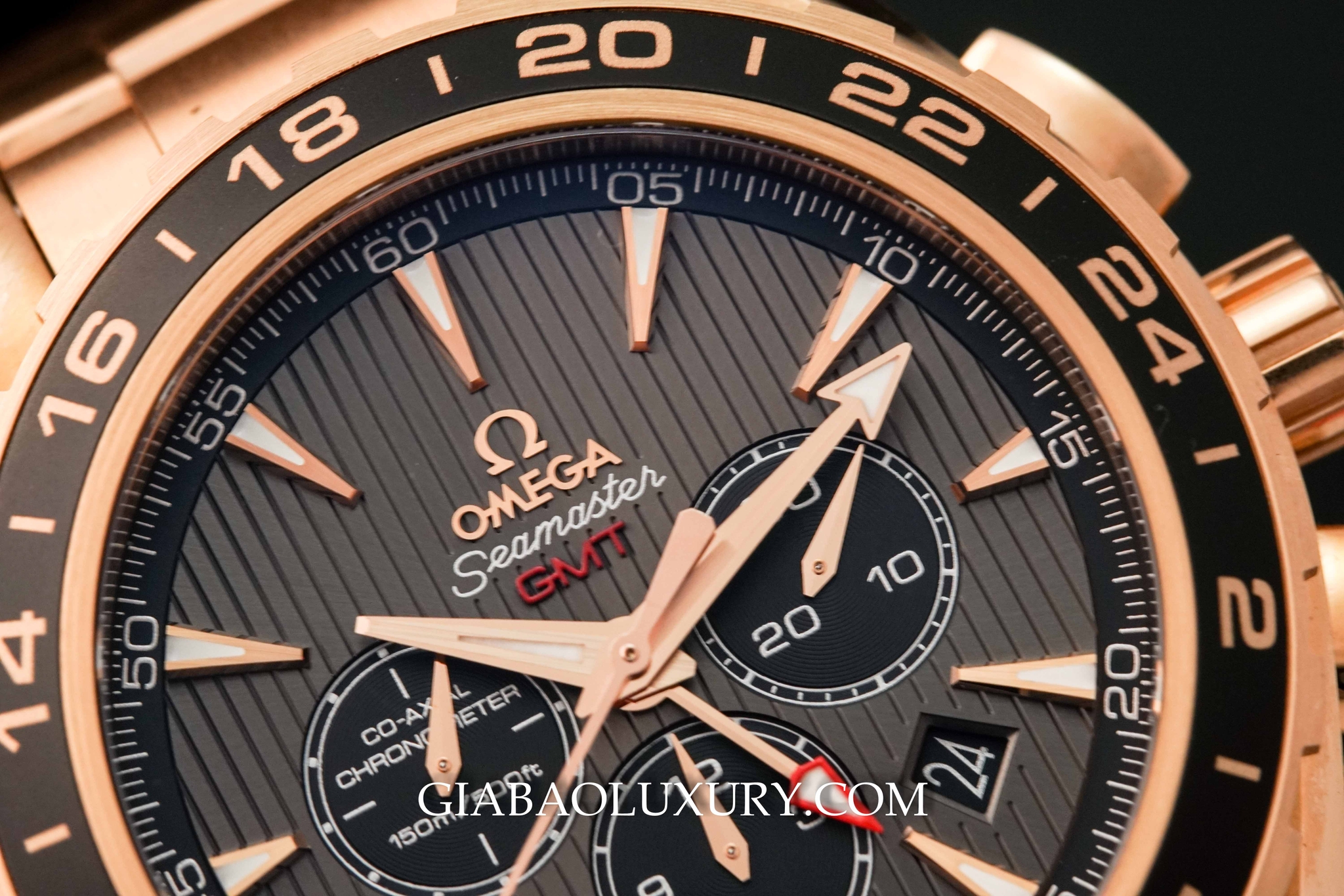 Với tên gọi Omega Seamaster Aqua Terra 150m Co-Axial GMT Chronograph 44 mm, chiếc đồng hồ ngày hôm nay ngoài chức năng giờ, phút, giây cơ bản, thì hai tính năng khác chính là giờ GMT và chronograph. Để phục vụ tính năng giờ GMT, Omega Seamaster Aqua Terra 150m Co-Axial GMT Chronograph 44 mm được trang bị một vành bezel quy mô 24 giờ có thể quay được, đi kèm một kim giờ trung tâm, có thể nhận biết bởi mũi tên màu đỏ. Kim giờ GMT được điều chỉnh thông qua núm chỉnh giờ, tại nấc đầu tiên, cùng chuyển động với kim giờ và phút trung tâm của chiếc Omega Seamaster Aqua Terra 150m Co-Axial GMT Chronograph 44 mm.