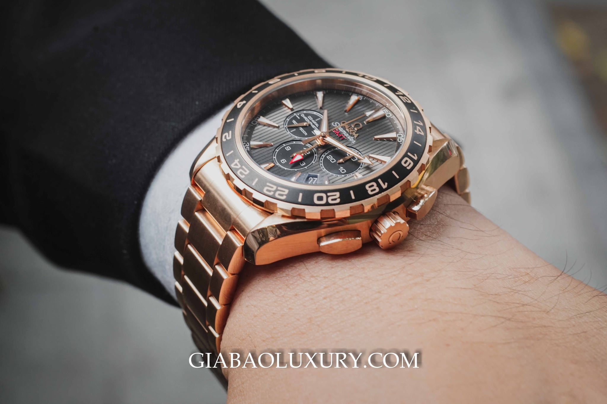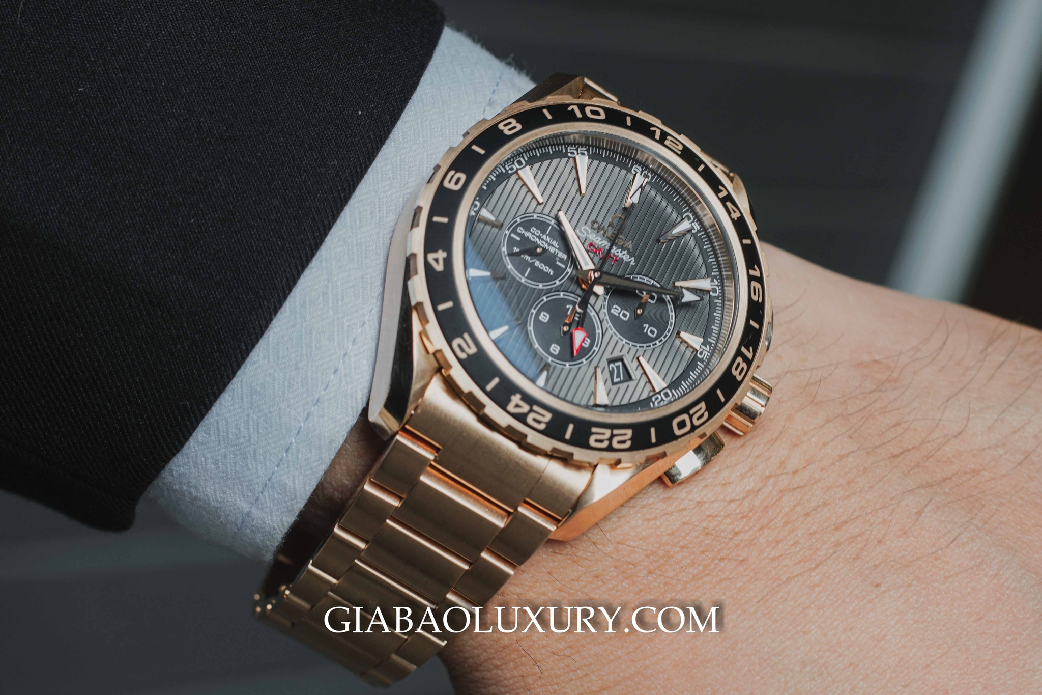 Với chất liệu vàng hồng của bộ vỏ khung, đầm tay chính là cảm giác mà chiếc Omega Seamaster Aqua Terra 150m Co-Axial GMT Chronograph 44 mm khi được đeo trên tay nam giới. Đặc biệt với kích thước 44mm, Omega Seamaster Aqua Terra 150m Co-Axial GMT Chronograph 44 mm thực sự là một chiếc đồng hồ khá kén người đeo. Bù lại, càng nối dây không quá dài, nên thực tế chiếc Omega Seamaster Aqua Terra 150m Co-Axial GMT Chronograph 44 mm cũng không quá lớn.