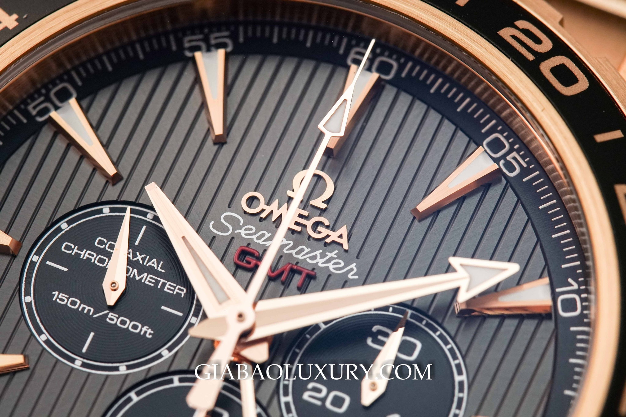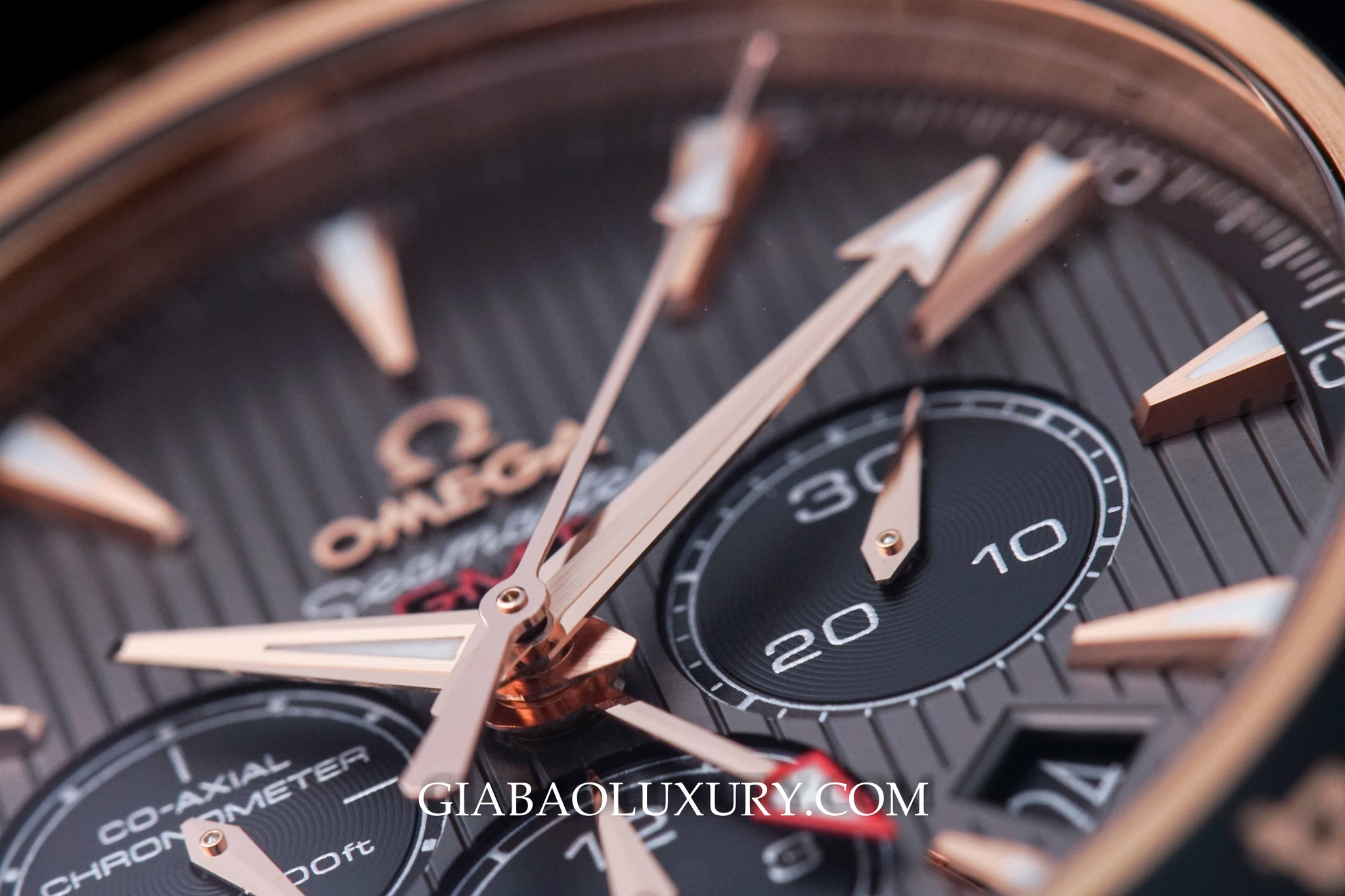 Về tính năng Chronograph, giống nhiều mẫu truyền thống, Omega Seamaster Aqua Terra 150m Co-Axial GMT Chronograph 44 mm có hai mặt số góc 3 giờ và 6 giờ lần lượt để bấm giờ và phút. Chronograph trong quá khứ là một tính năng rất hữu ích, trước khi các thiết bị đo đạc và tính toán chuyên nghiệp được ra đời. Giờ đây, dù không còn được sử dụng phổ biến để đo thời gian, nhiều nhà sản xuất vẫn tiến hành sản xuất những mẫu chronograph phức tạp hơn, thể hiện đẳng cấp riêng biệt trong giới chế tác.