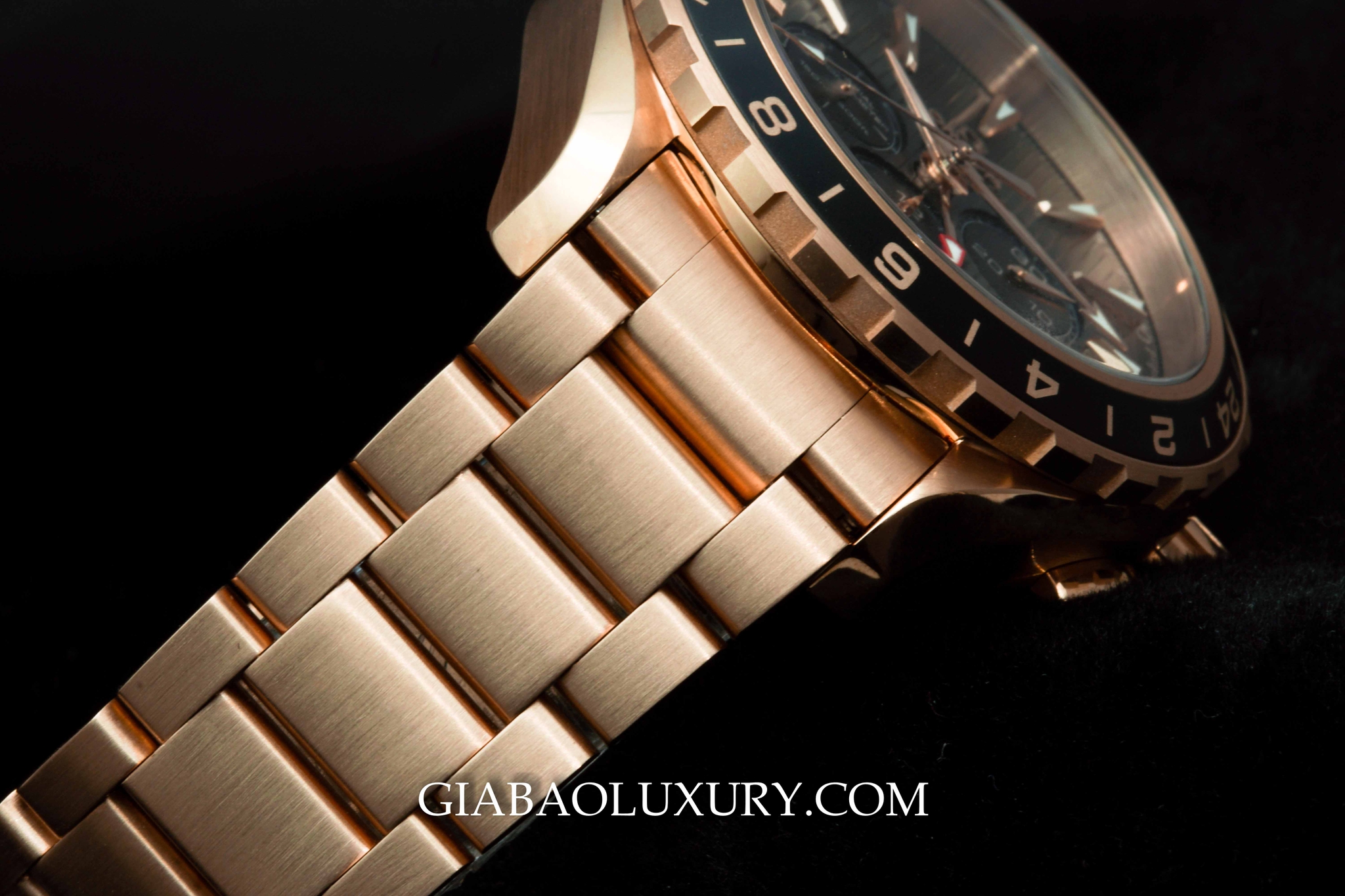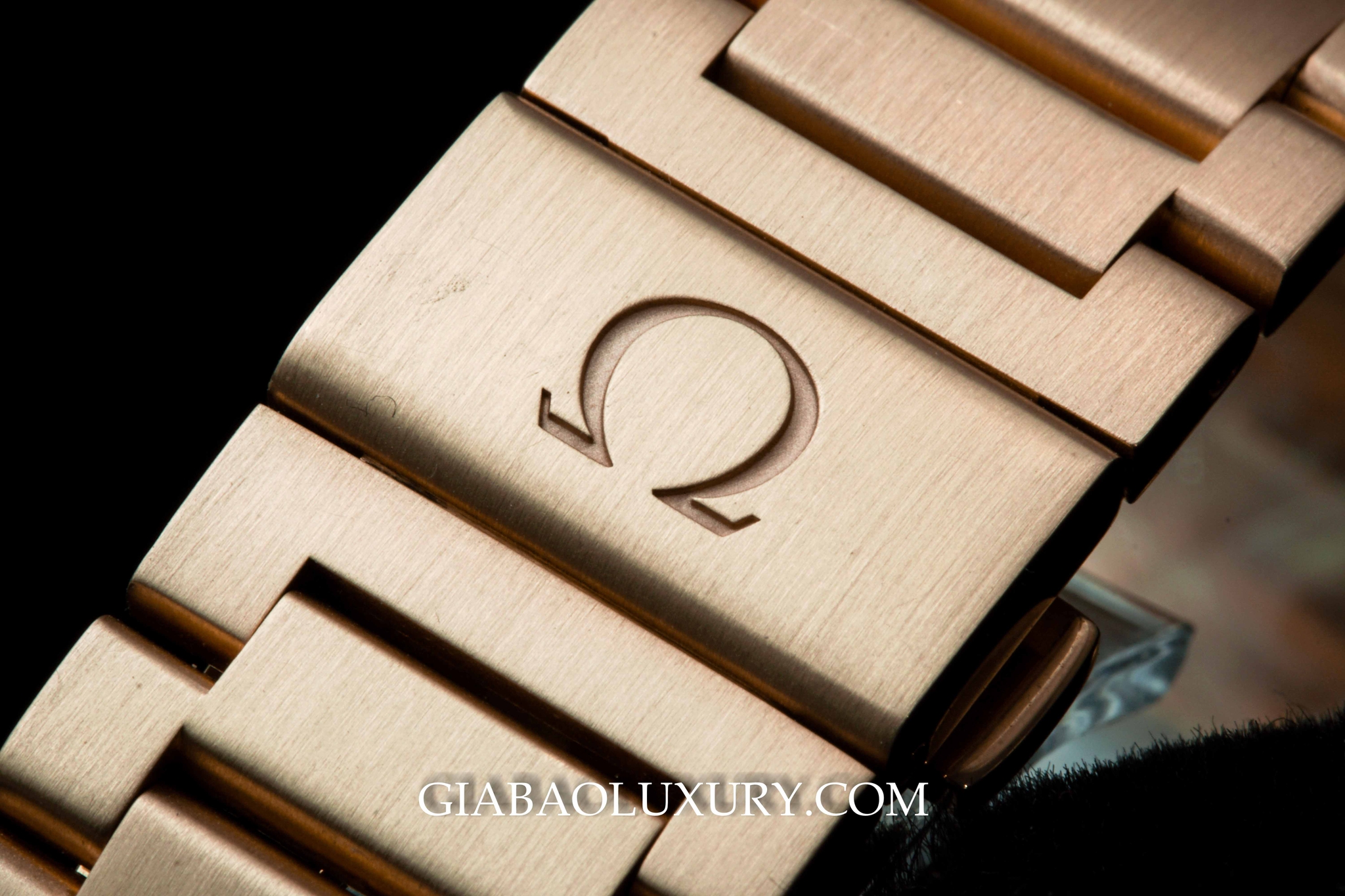 Nếu đầm tay do chất liệu vàng hồng đem lại thì cảm giác chắc tay chắc chắn sẽ do dây đeo cũng trong chất liệu vàng hồng với những mối nôi chữ nhật linh hoạt đem lại. Độ rộng của càng nối dây là 21 mm, một kích thước tiêu chuẩn thường thấy của những mẫu đồng hồ nam. Kết thúc một vòng dây đeo là khóa bướm giấu khóa với kí hiệu Omega bên trên. Nhìn chung khóa bướm là một sự lựa chọn đầy tinh tế của nhà sản xuất dành cho mẫu Omega Seamaster Aqua Terra 150m Co-Axial GMT Chronograph 44 mm vừa đảm bảo được độ an toàn, cố định đồng trên tay, vừa đảm bảo được vẻ đẹp giấu kín.