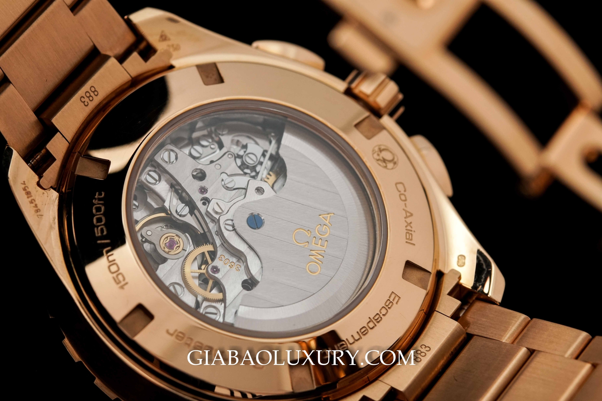 Bộ thoát Co-Axial chỉ mới được sử dụng trong những năm đầu thế kỷ XXI, được đánh giá cao về độ chính xác, cũng như khả năng kháng từ ưu việt. Hiện tại bộ máy tự động 3603 với sự góp mặt của 37 chân kính, gõ nhịp tại tần số 4Hz, có thể cung cấp năng lượng cho chiếc Omega Seamaster Aqua Terra 150m Co-Axial GMT Chronograph 44 mm vận hành trong vòng 55 giờ bền bỉ và chính xác, là một sự lựa chọn chuẩn xác cho hai ngày cuối tuần. Đặc biệt, được trang bị nắp lưng với lớp kính sapphire cao cấp trong suốt, việc quan sát từng chuyển động của hệ thống chronograph, bánh lắc của chiếc Omega Seamaster Aqua Terra 150m Co-Axial GMT Chronograph 44 mm là một điều hết sức đơn giản.