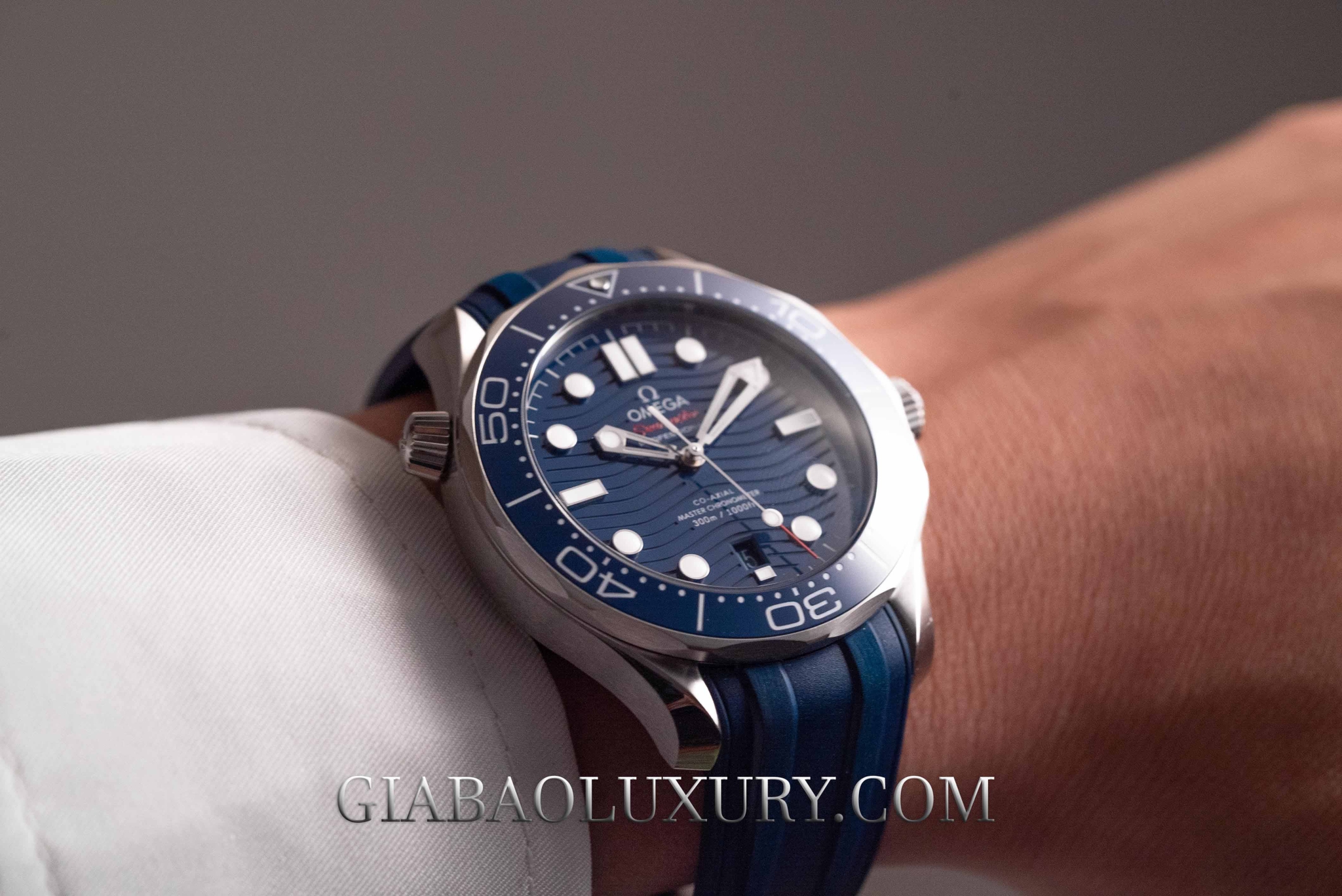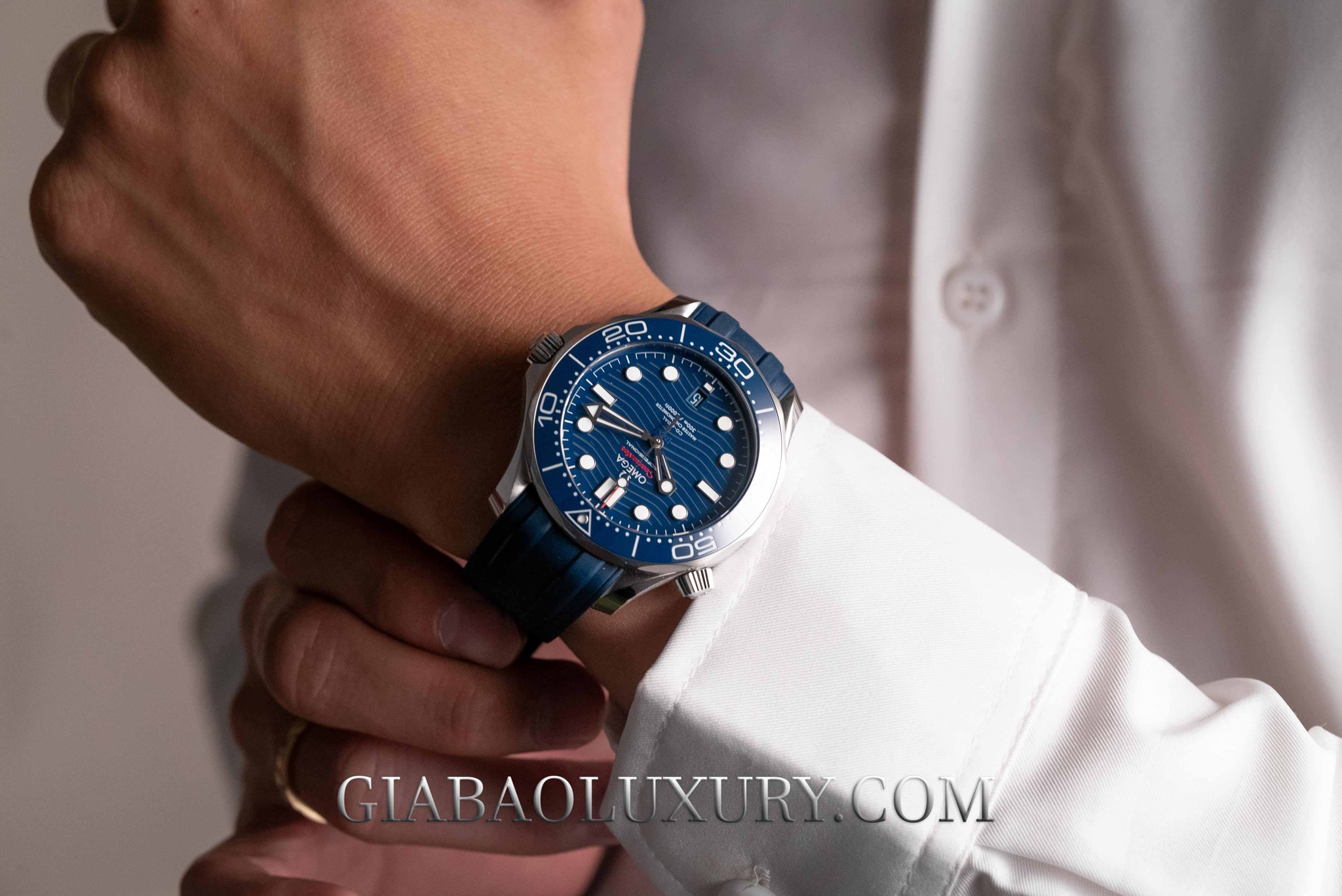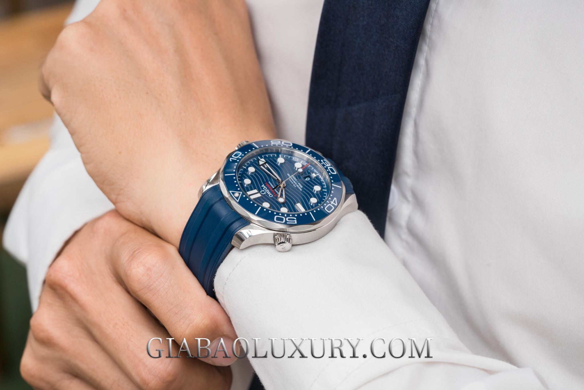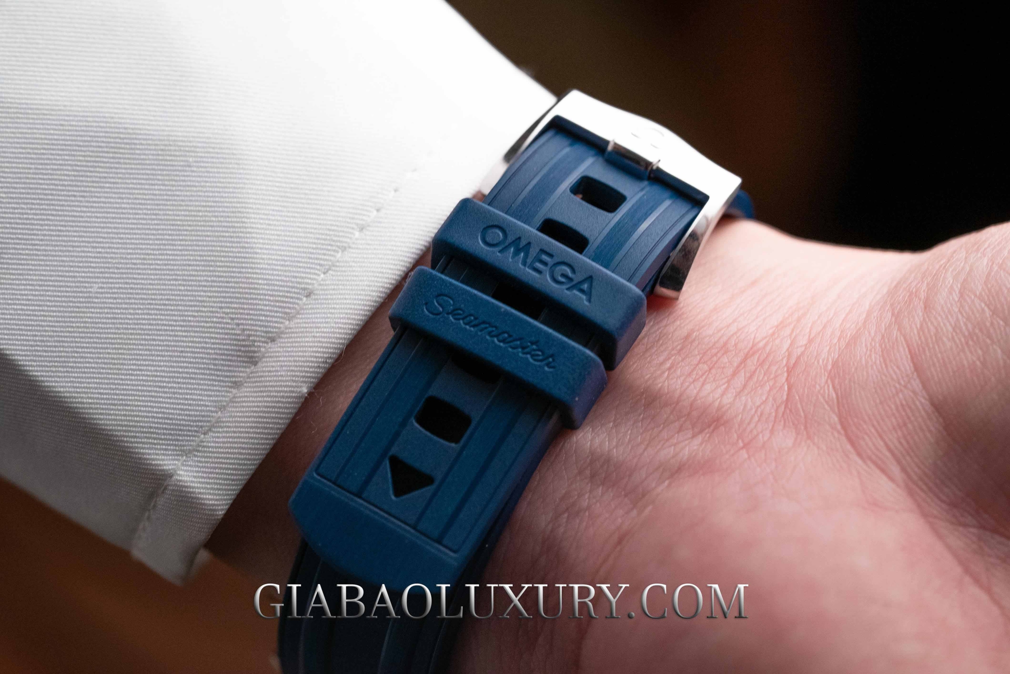 Khi đeo lên tay, chiếc Omega Seamaster Diver 300M thế hệ mới với dây cao su đem lại trải nghiệm lên tay vô cùng êm ái. Dây cao su mềm, ôm sát cổ tay người đeo, mang đến vẻ đẹp hiện đại, năng động và đậm chất sport. Nhà sản xuất quyết định dùng khóa cài cho phiên bản này, nếu như là khóa gấp thì sẽ tuyệt vời hơn rất nhiều theo quan điểm cá nhân của tôi. Chiếc đồng hồ có mức giá niêm yết 4,900 USD