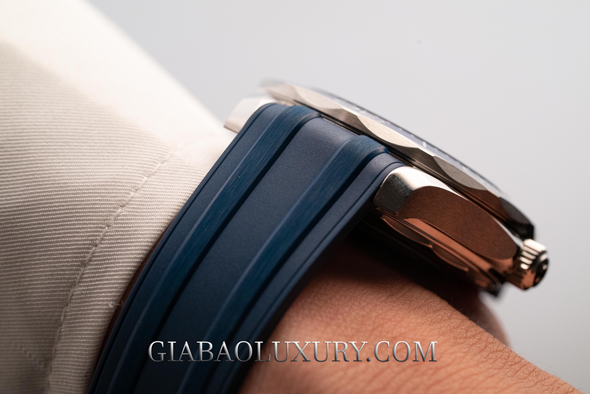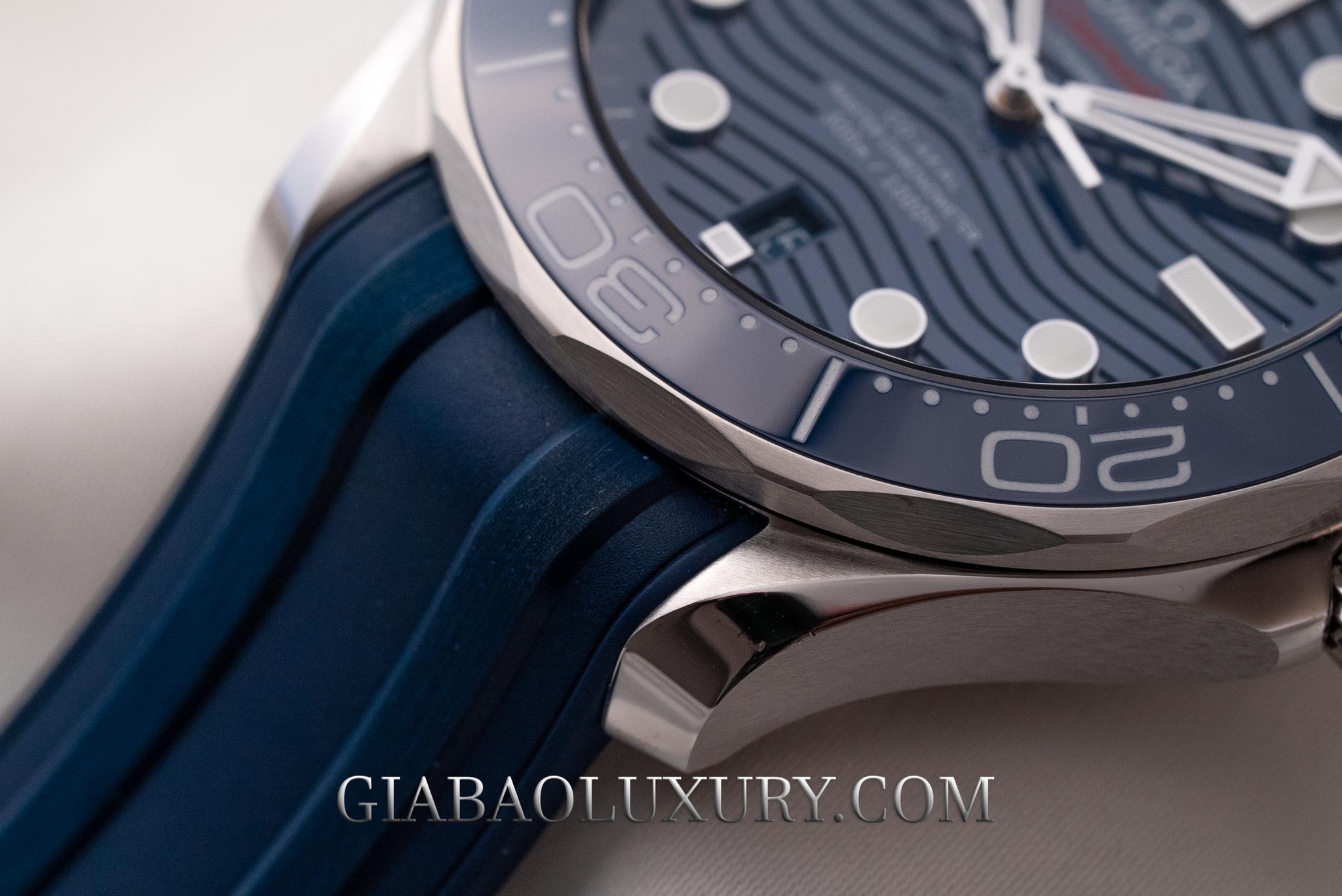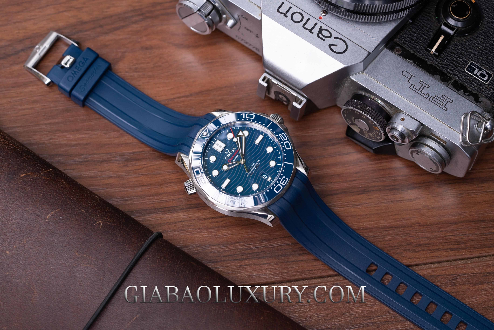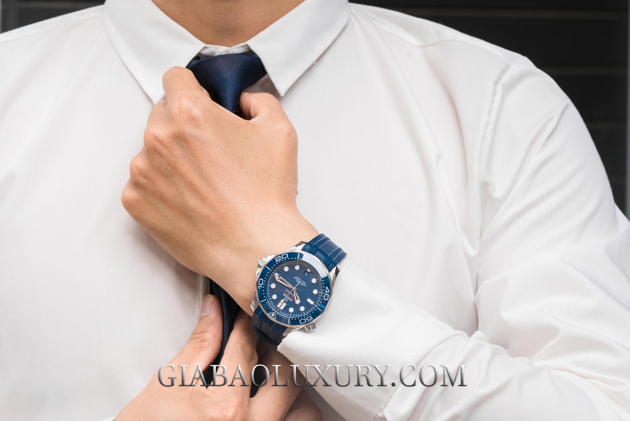 Khi đeo lên tay, chiếc Omega Seamaster Diver 300M thế hệ mới với dây cao su đem lại trải nghiệm lên tay vô cùng êm ái. Dây cao su mềm, ôm sát cổ tay người đeo, mang đến vẻ đẹp hiện đại, năng động và đậm chất sport. Nhà sản xuất quyết định dùng khóa cài cho phiên bản này, nếu như là khóa gấp thì sẽ tuyệt vời hơn rất nhiều theo quan điểm cá nhân của tôi. Chiếc đồng hồ có mức giá niêm yết 4,900 USD