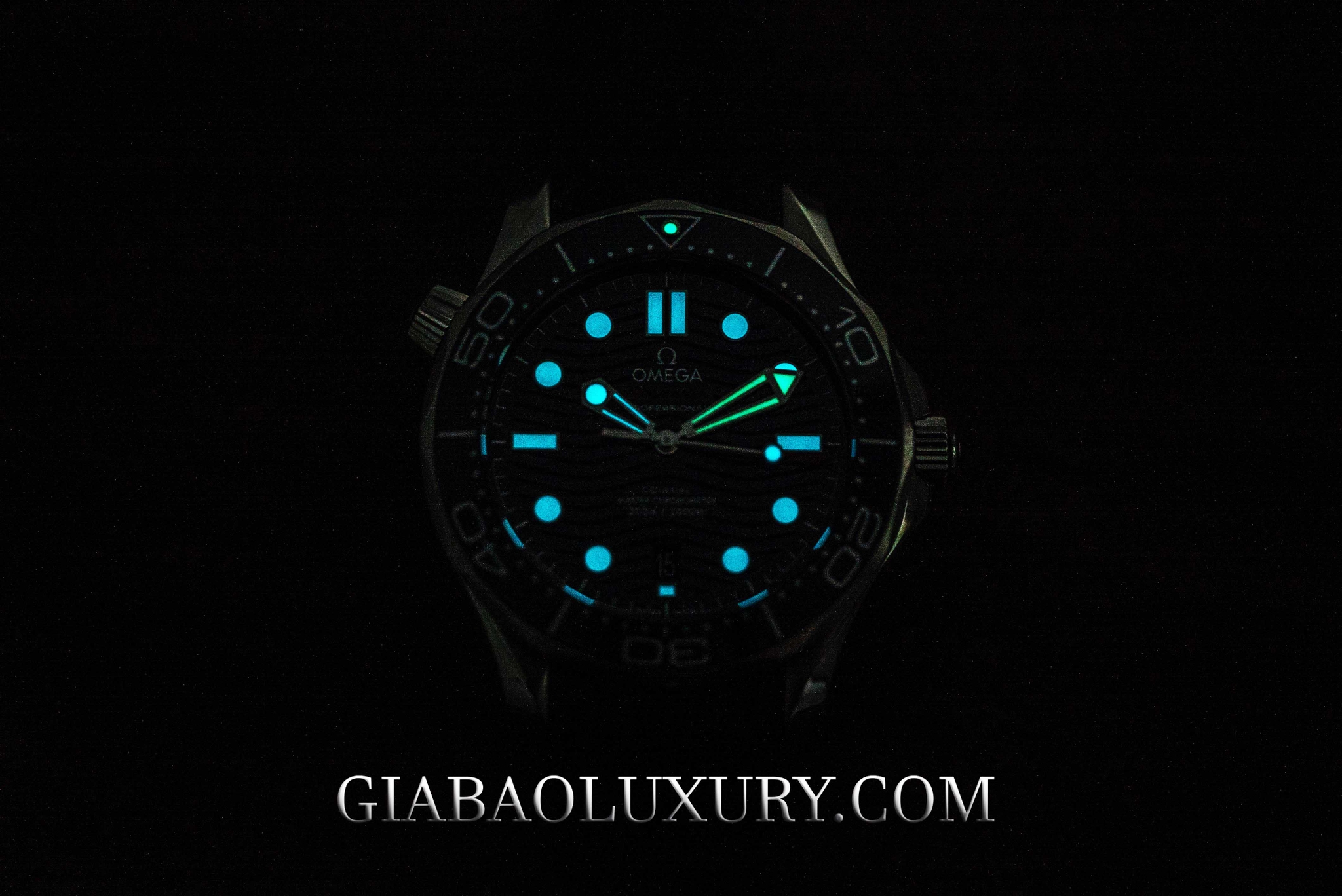 Góp mặt trên vành bezel là hệ thống đếm phút chính xác từ chất liệu men màu trắng. Tại góc 12 giờ là viên ngọc tròn trịa đã được phủ kín bởi chất phát quang cho ánh sáng màu xanh lá cực rõ nét trong môi trường thiếu ánh sáng như dưới đáy biển sâu. Nếu muốn kiểm nghiệm khả năng phát sáng của chất phát quang nhà Omega bạn có thể nạp năng lượng cho đồng hồ khi đứng dưới ánh nắng một lúc vào di chuyển nhanh chóng vào một căn phòng tối.