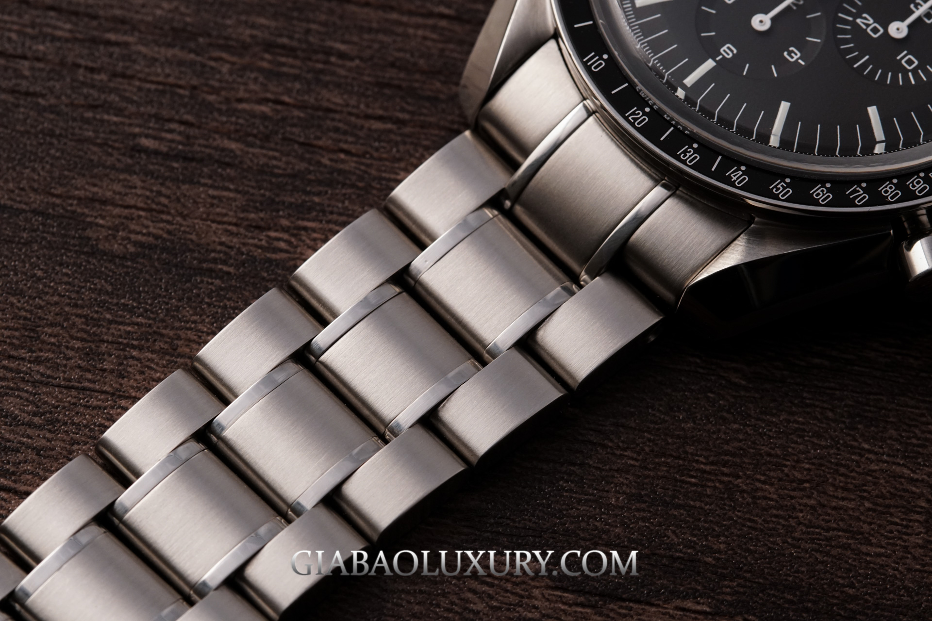 Bộ dây kim loại ba mắt được thiết kế ấn tượng với phần lớn bề mặt được chải xước, nhưng có Nếu để ý kỹ hơn, hai đường viền này là hai mấu riêng biệt chứ không phải là cách phần được hoàn thiện khác nhau trên một mấu chung. Điều này có nghĩa là sao? Điều này có nghĩa rằng việc chế tác sẽ phức tạp và tốn công hơn rất nhiều, và cũng cho ta thấy Omega sẵn sàng bỏ nhiều công sức để đem tới cho khách hàng những chiếc đồng hồ hoàn hảo nhất.