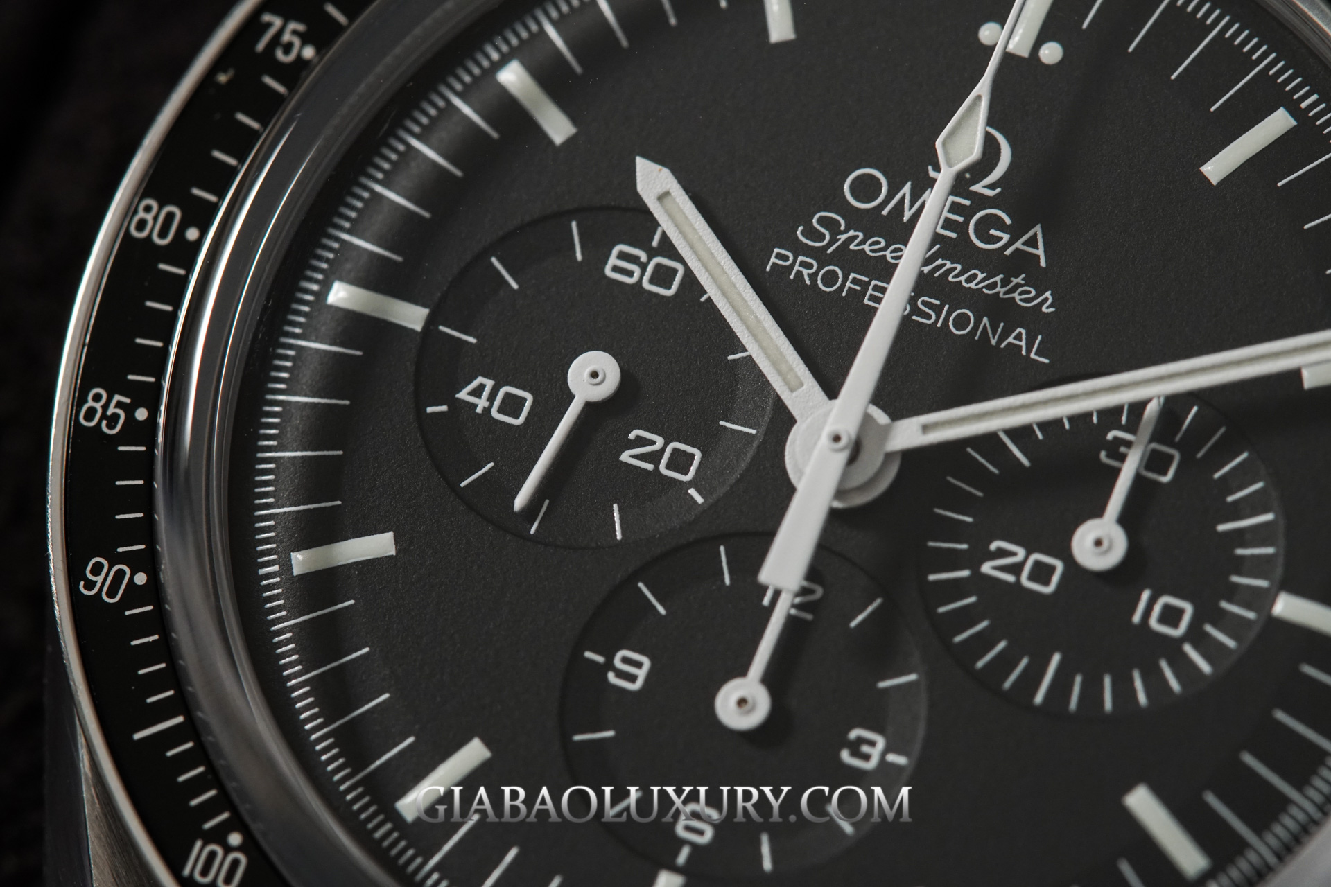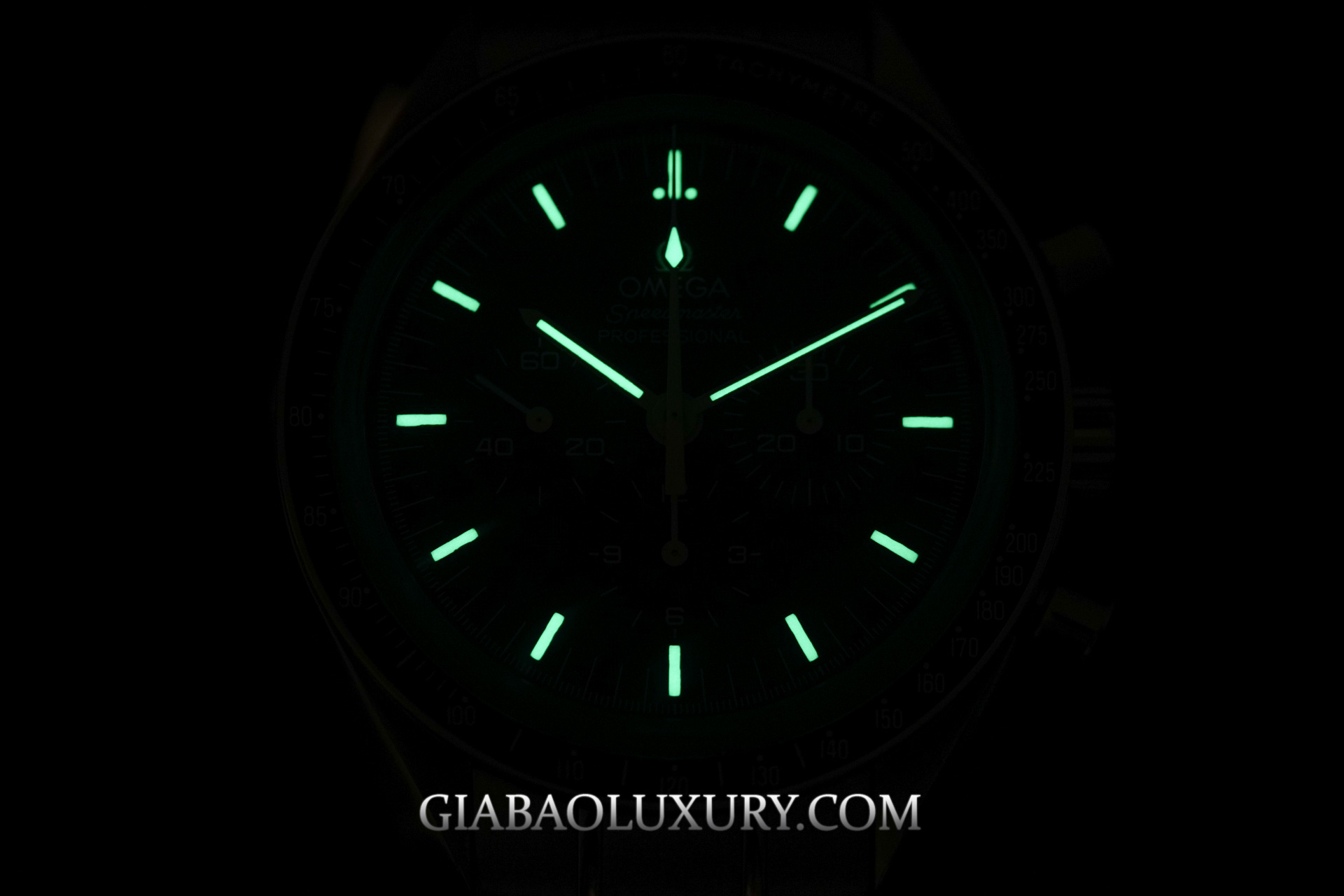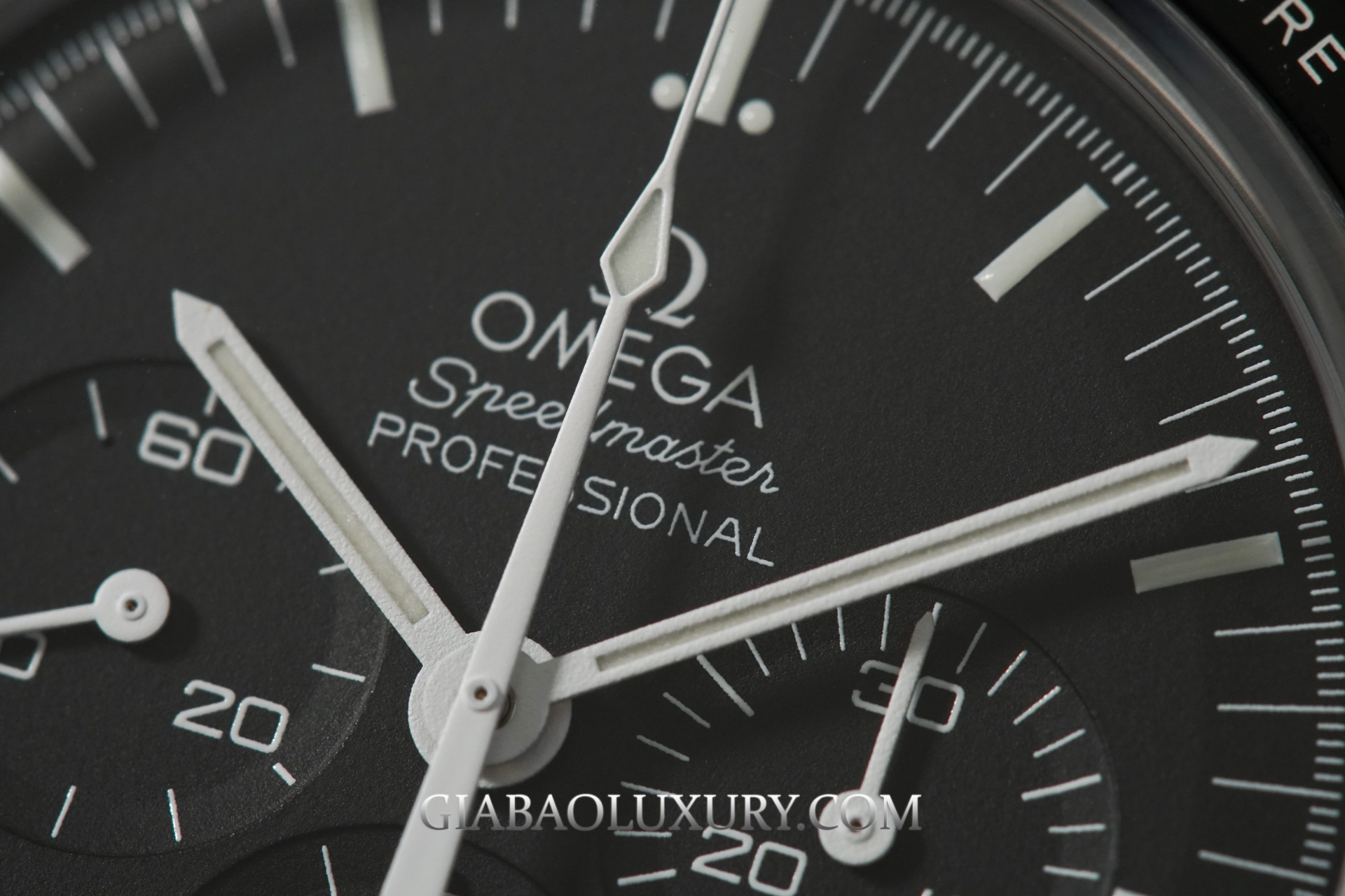 Mặt số của chiếc Omega Speedmaster Moonwatch Professional Chronograph 42mm được thiết kế đơn sắc với hai màu trắng đen đối lập, tạo độ tương phản lớn giúp người dùng dễ dàng quan sát hơn. Thiết kế mặt số khá đơn giản với màu đen bóng, không hoàn thiện chải tia hay vân tròn cầu kỳ, tất cả nhằm giúp người dùng có thể quan sát dễ dàng nhất. Dù diện tích bề mặt phủ chất phát quang không quá lớn, nhưng thật sự chất Super-LumiNova đã hoàn thành xuất sắc nhiệm vụ của mình khi mang lại một sắc xanh sáng rực khi thiếu ánh sáng bên ngoài.