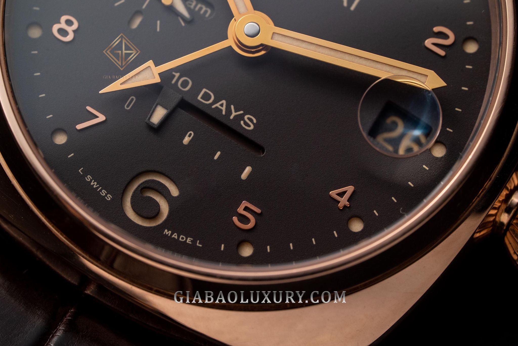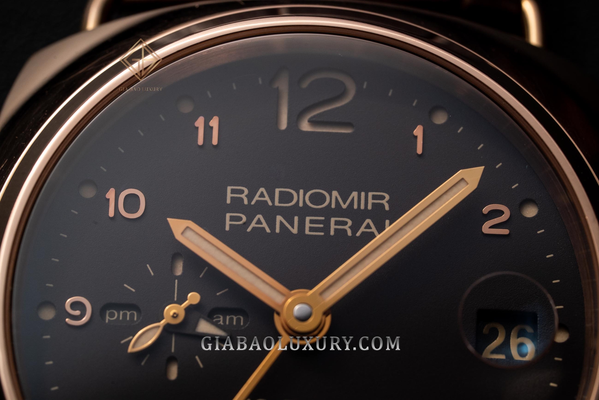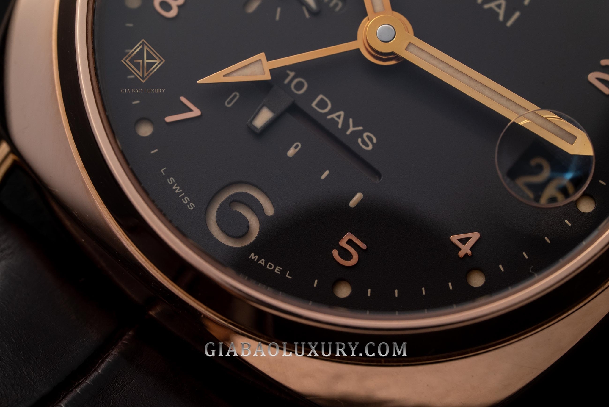 Như đã phân tích ở trên, mặt số là một trong những chi tiết đặc biệt nhất của dòng Radiomir, và đặc biệt là trong điều kiện thiếu ánh sáng. Trong bóng tối, mặt số của chiếc Paneirai Radiomir 10 Days GMT Automatic Oro Rosso 45mm thậm chí còn nổi bật hơn những lúc được chiếu sáng đầy đủ. Nổi bật nhất có lẽ là 2 cọc số 12 và 6 được cắt gọt kỹ lưỡng, lộ ra phần bên dưới được phủ đầy chất phát quang Super-LumiNova (không phải là Radium – một chất phóng xạ quá nguy hiểm).