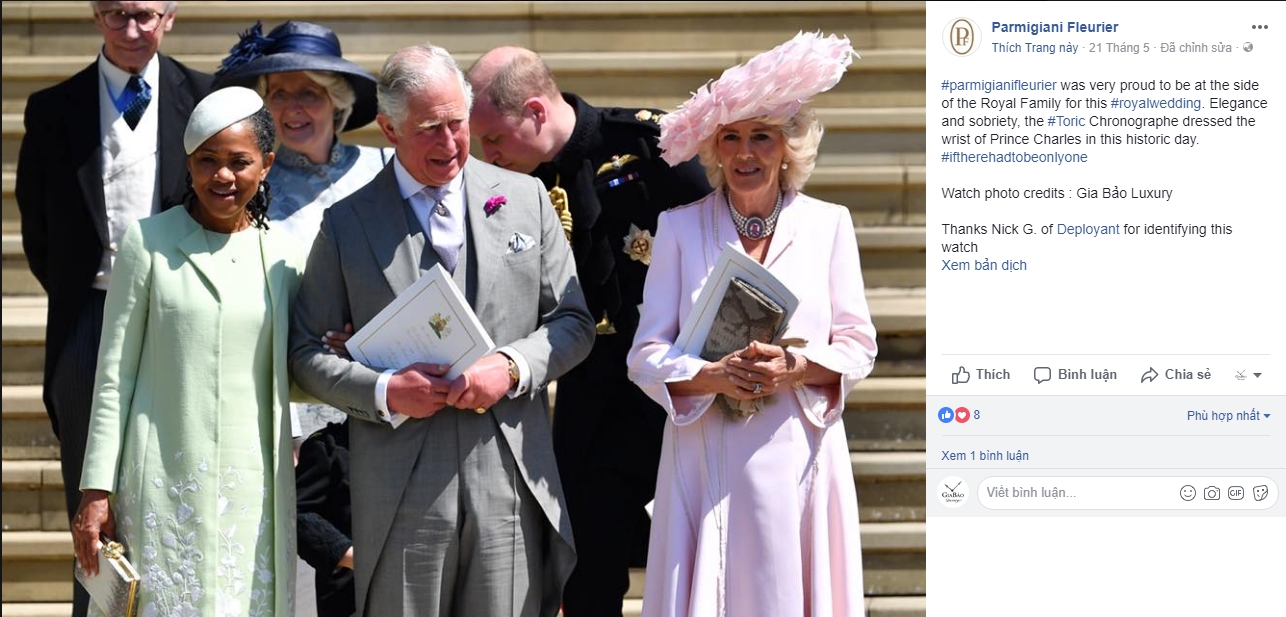 Chiếc đồng hồ Parmigiani Fleurier Toric Chronograph được đeo trên tay Prince Charles tại đám cưới hoàng gia Anh vừa diễn ra vài ngày trước. Và hình ảnh chiếc đồng hồ chụp bởi Gia Bảo Luxury đã được Parmigiani sử dụng trên fanpage chính thức của họ.