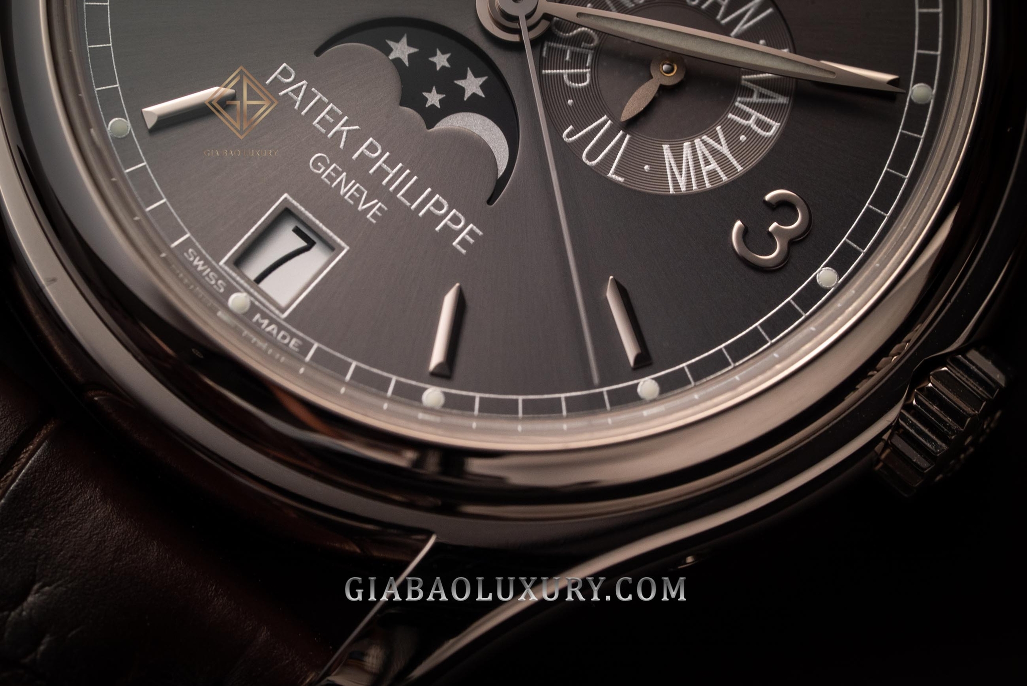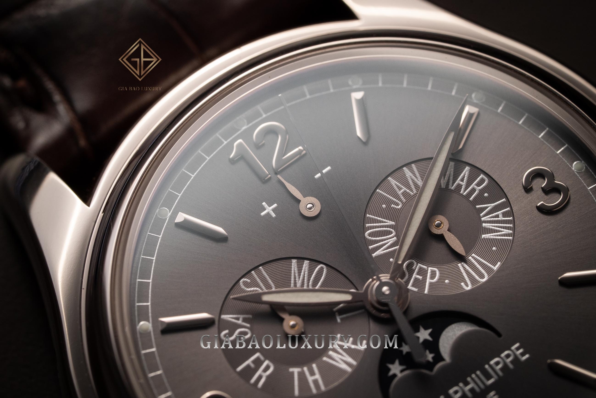Dưới ánh sáng Mặt Trời, mặt số xám chải tia càng trở nên nổi bật, cá tính với các chi tiết được căn chỉnh tuyệt vời từ 11 cọc chỉ số bằng vàng trắng đính nổi, từ những chữ số Ả Rập mềm mại tới cọc baton chỉn chu đến bộ kim trung tâm được hoàn thiện thủ công dưới bàn tay tài hoa của nghệ nhân nhà Patek. Là chiếc đồng hồ hữu dụng với hơn 5 chức năng nhỏ lẻ, thiết kế mặt số không hề phức tạp như nhiều người tưởng tượng mà ngược lại khá thông thoáng và dễ đọc.