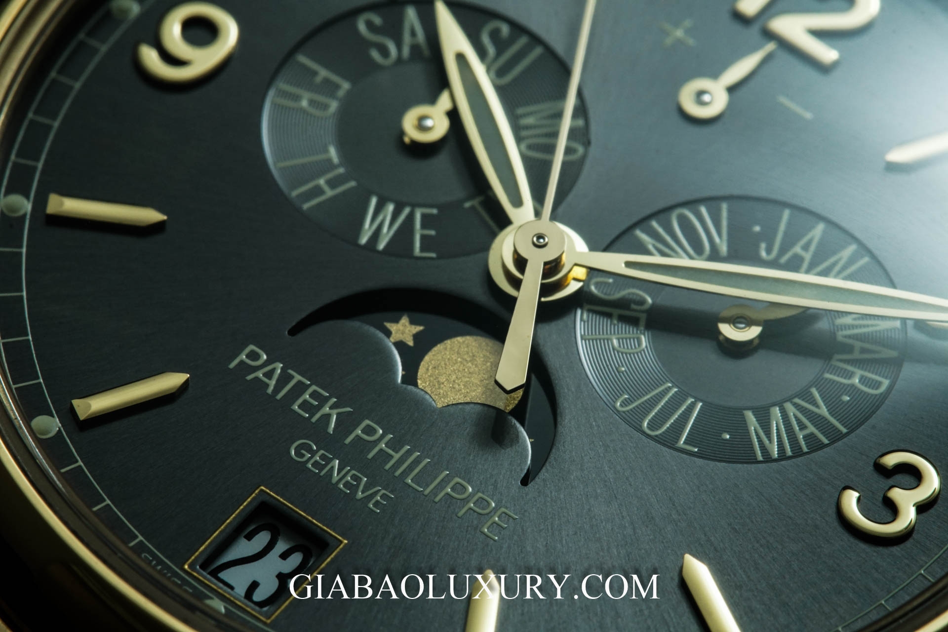 Tất cả các chi tiết đều không che lấp hệ thống chỉ giờ được đính nổi, trừ ô cửa sổ báo ngày. Nếu để đánh giá, mặt số của 5146J chứa đựng nhiều điểm hiện đại nhất. Đó chính là ba số chỉ giờ dạng Ả Rập, là cột mốc bên trong hai mặt số phụ, là sự có mặt của chất phát quang phủ kín bộ kim trung tâm hay 12 chấm nhỏ ngoài rìa mặt số, xen kẽ vạch chia phút màu trắng. Hơn hết, không thể bỏ qua toàn bộ đĩa mặt số màu xám ấn tượng. Bạn sẽ hiếm khi tìm thấy một chiếc đồng hồ có mặt số màu xám, vì mức độ nổi bật của màu xám khá khiêm tốn. Sự cá tính được gắn với màu đen, màu trắng là biểu tượng của sự thanh lịch, còn màu trắng là một gam màu lạnh trung tính, sẽ gây ấn tượng với người đối diện bởi sự khác lạ nhiều hơn.