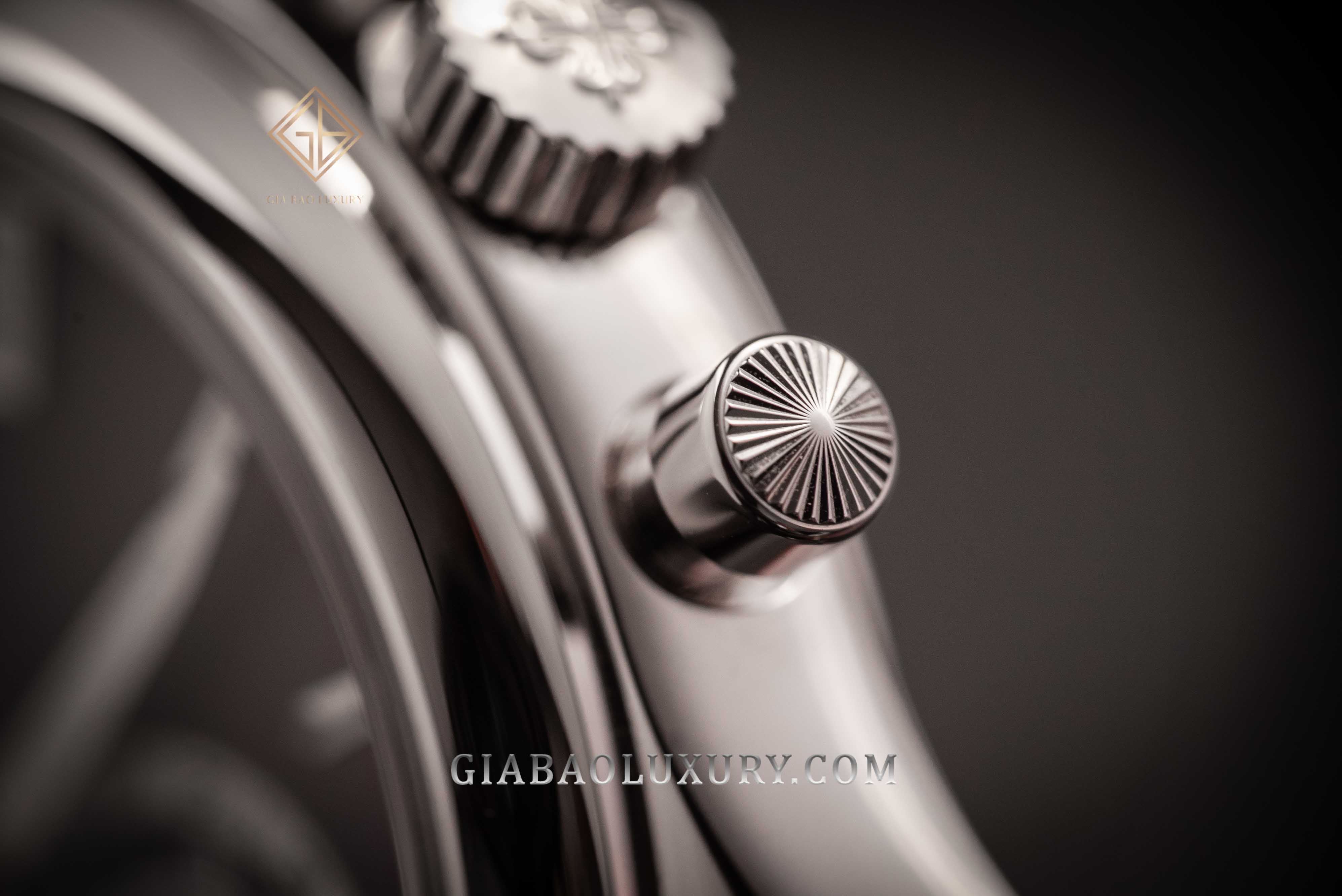 Ba ô cửa sổ lịch được điều chỉnh bởi hệ thống nút bấm bên trái, và cần công cụ đi kèm mẫu đồng hồ mới có thể sử dụng được. Còn bộ hiển thị chronograph góc 6 giờ lại được vận hành nhờ hai nút bấm chronograph có khắc vân guilloche bên cạnh khung. Hai vòng tròn bên trong chạy từ chỉ số 5 đến 60 phối hợp cùng kim màu đỏ sẽ đếm phút, còn vòng tròn màu trắng ngoài cùng kết hợp kim giây màu trắng dài hơn đếm giờ. Riêng kim đếm giây chronograph lại được Patek Philippe đặt ở trung tâm cùng hai kim báo giờ và phút có phủ thêm chất phát quang màu trắng.