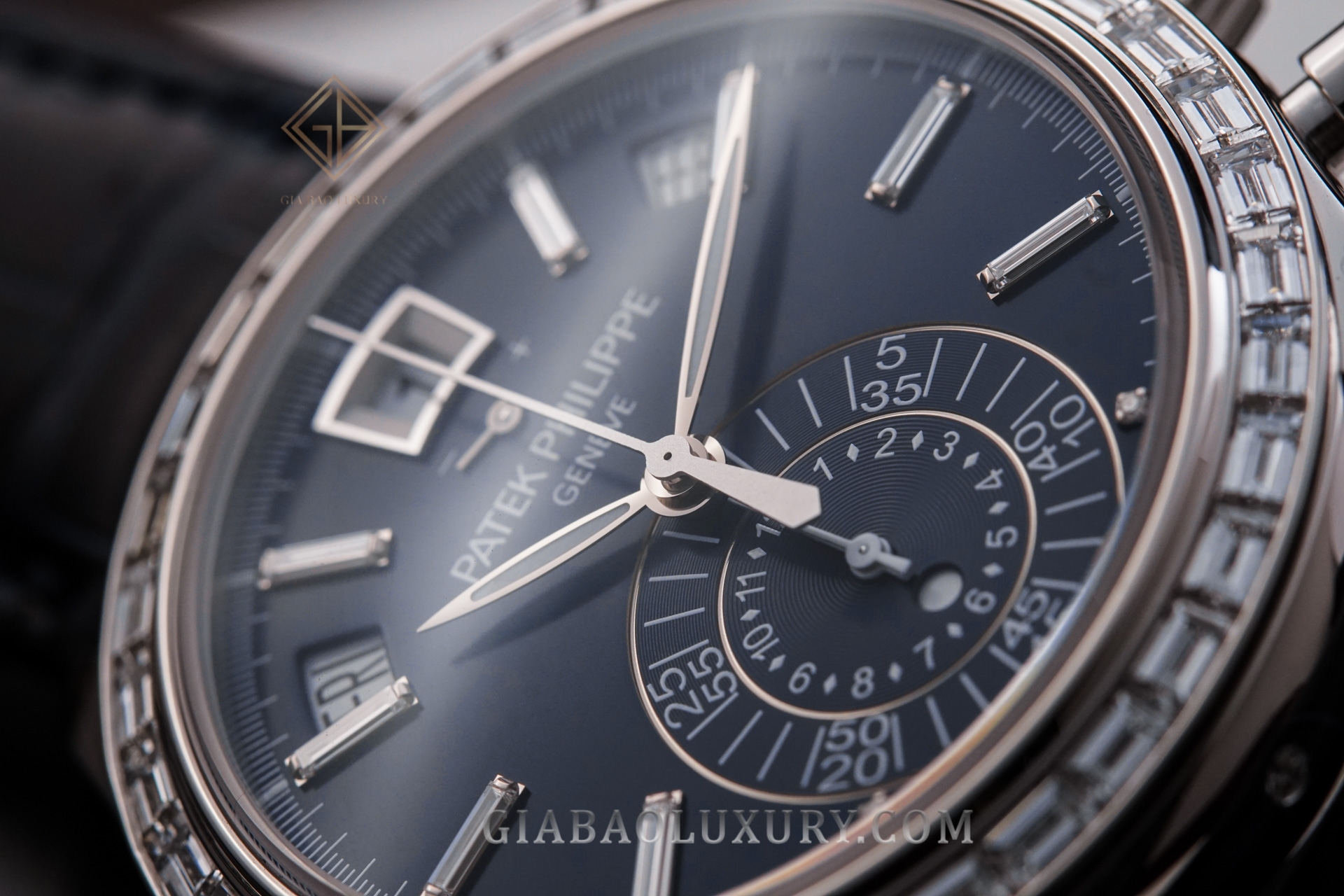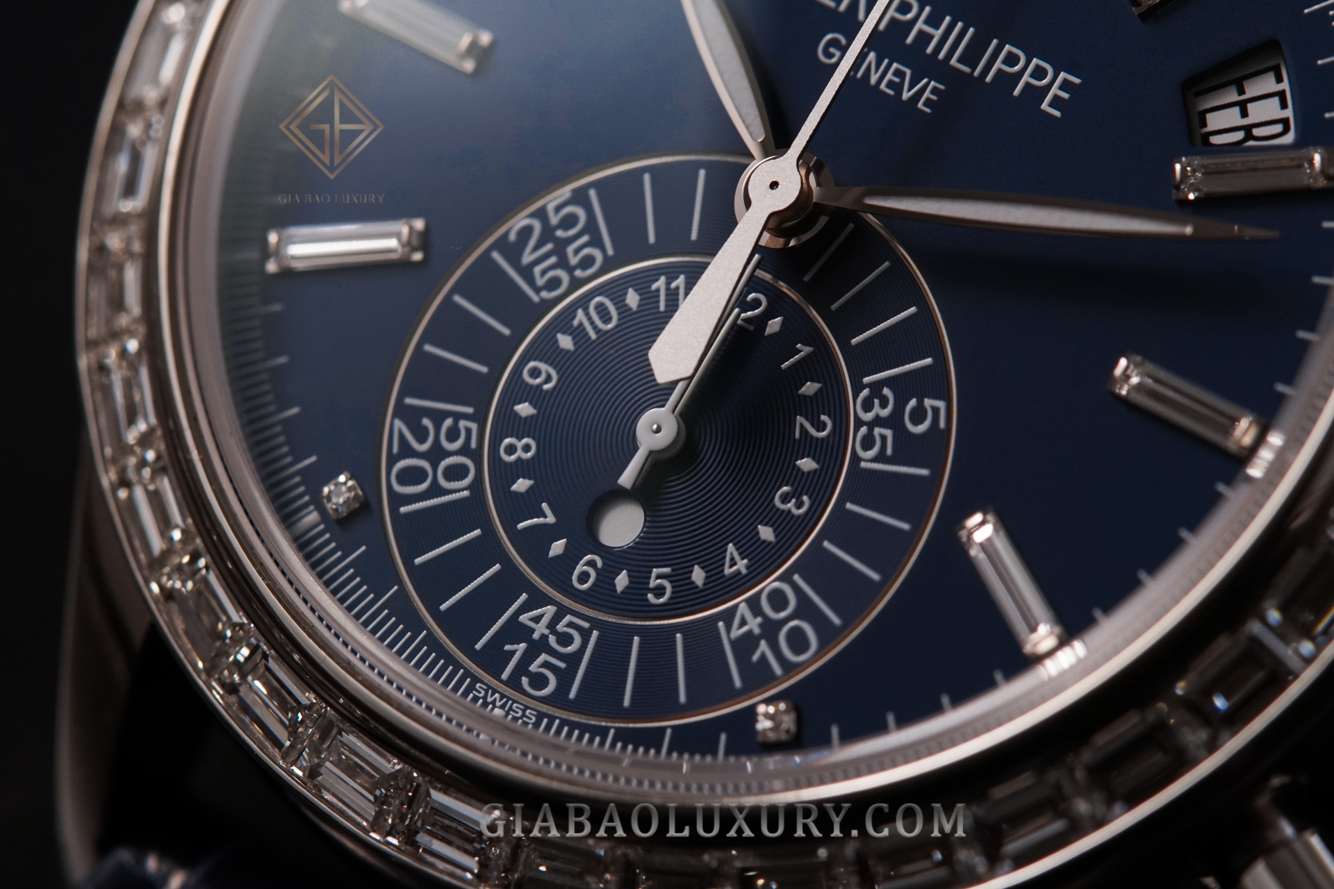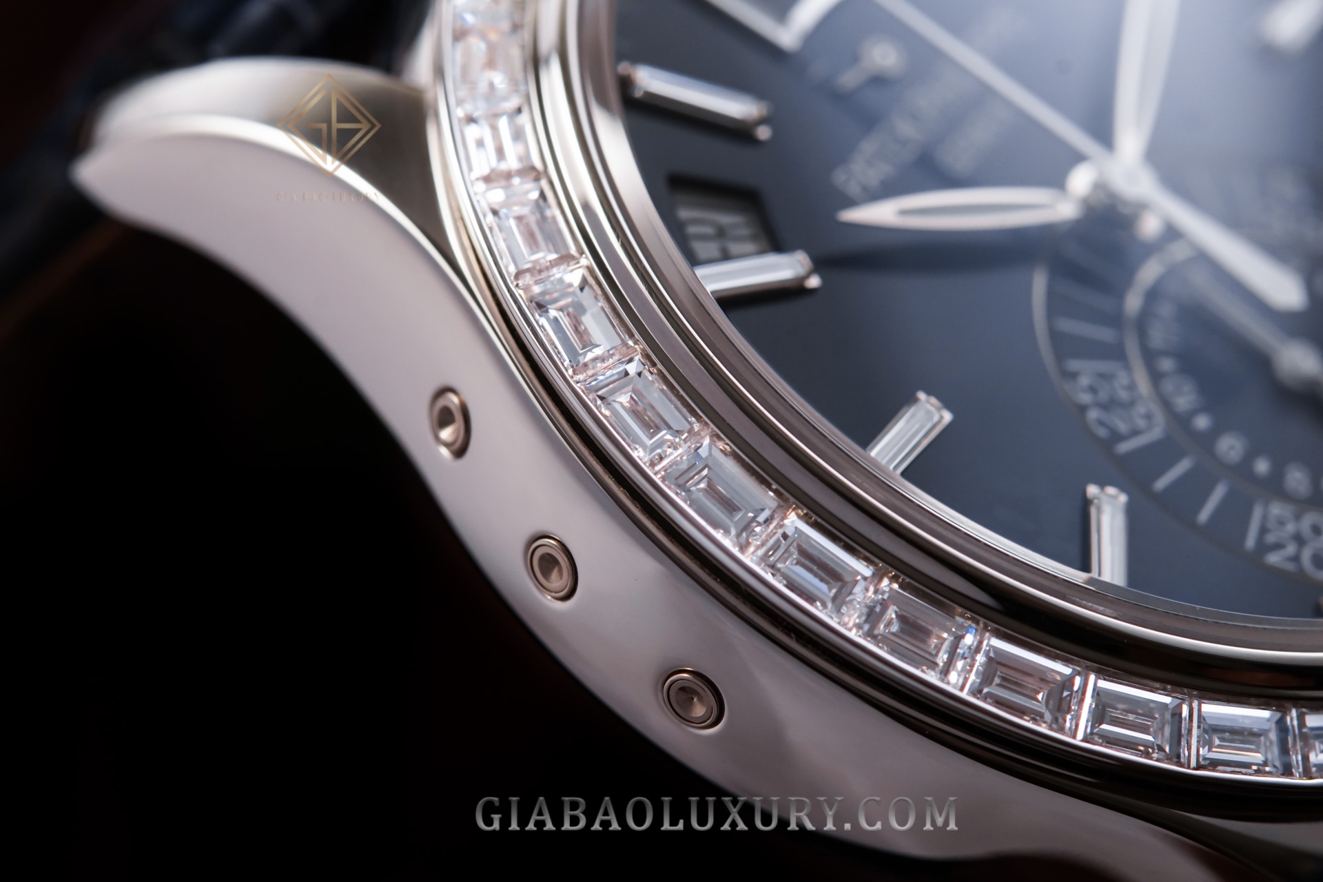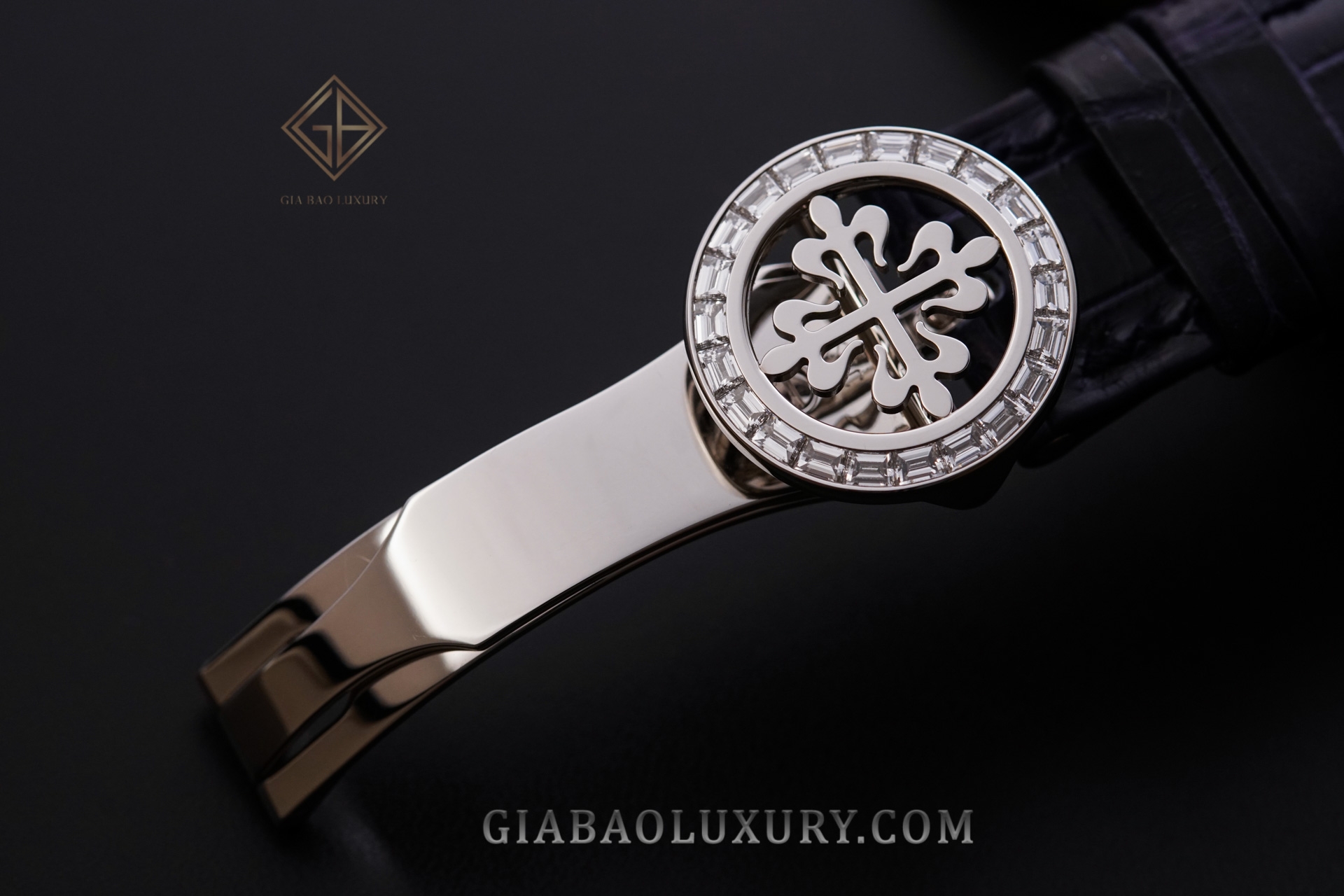 36 viên kim cương dạng ống (tương đương 3,48 cara) đã được đính thủ công trên vành bezel đồng hồ, 8 viên kim cương baguette làm cọc chỉ giờ trên mặt số, trong khi phía khóa hoa thị Calatrava duyên dáng là 22 viên kim cương kích cỡ nhỏ hơn đã được đính chặt bên trên. Tất cả số kim cương được sử dụng đều là nguyên bản, đã được lựa chọn kỹ càng cũng như khảm trong chính nhà máy của thương hiệu Patek Philippe