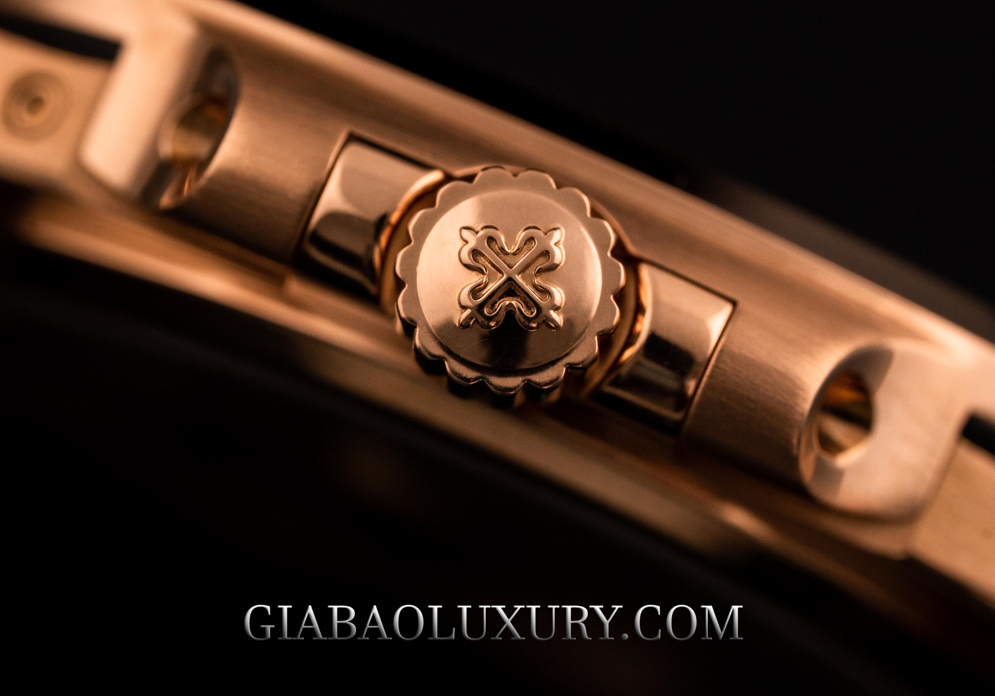 Kết hợp với vàng hồng 18K là dây đeo tay da bê nâu nhã nhặn, mang lại vẻ thanh lịch mà không giản đơn cho Patek Philippe Nautilus 5712R .