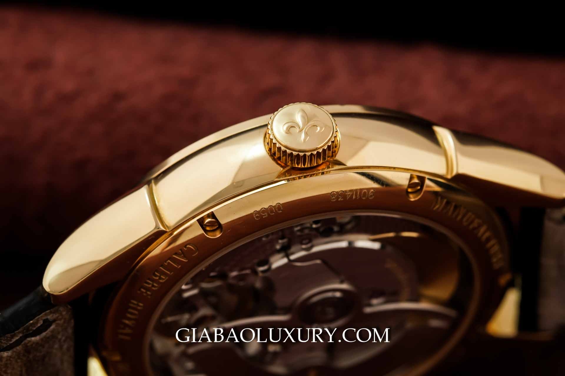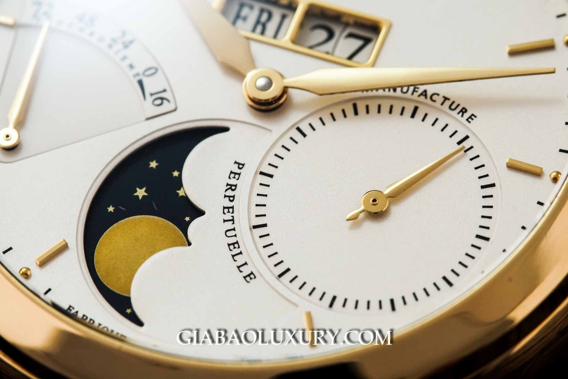 Hoàn thiện cho mặt số là hai kim giờ và phút bằng vàng mỏng, sắc nét, được cắt gọt cẩn thận cũng như đánh bóng chỉn chu cùng hệ thống cọc chỉ giờ được đính nổi thủ công xung quanh. Bên ngoài cùng là hệ thống vạch chia xen kẽ các chấm tròn bằng vàng, hỗ trợ việc xem phút được chính xác.