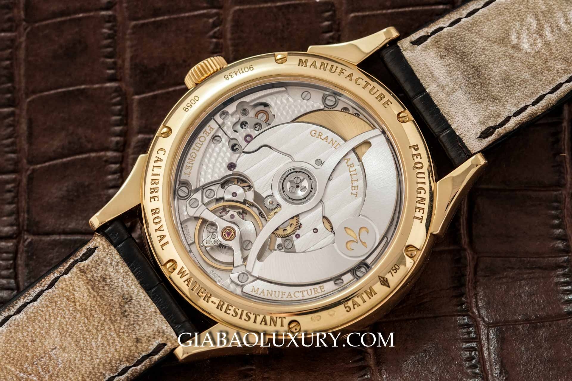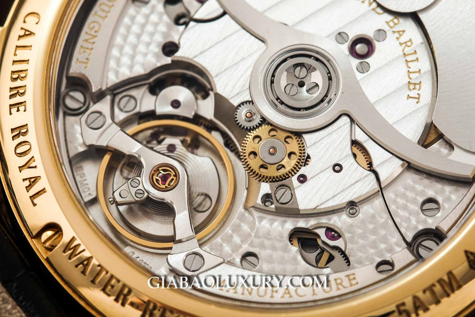Như đã nhắc đến ở bên trên, bên trong bộ vỏ khung chắc chắn của Rue Royale Moonphase là cỗ máy ấn tượng Calibre Royal cơ bản với ba của hãng. Bộ máy này được quan sán thuận tiện hơn nhờ lớp kính sapphire ở phía nắp lưng. Bộ máy Calibre Royal hiện lên với không quá nhiều tầng lớp bởi việc đã tích hợp ba chức năng tháng-giờ, bộ hiển thị Moonphase, bộ báo năng lượng trên cùng một khung chính. Do đó những chi tiết hoàn thiện được quan sát khá là dễ dàng. Những chi tiết hiện lên với cách hoàn thiện cổ điển như hệ thống vân Côtes de Genève, đường viền được mài sáng bóng và hệ thống vân bán nguyệt xếp chồng nhau rõ nét.