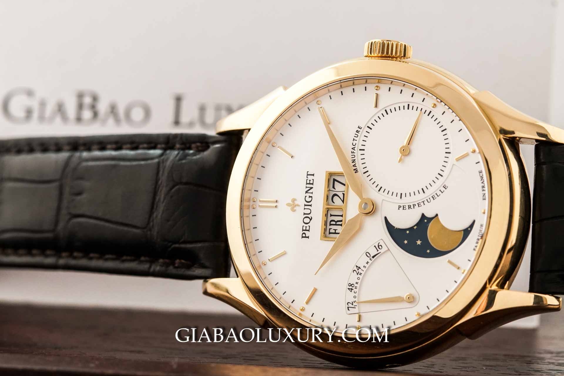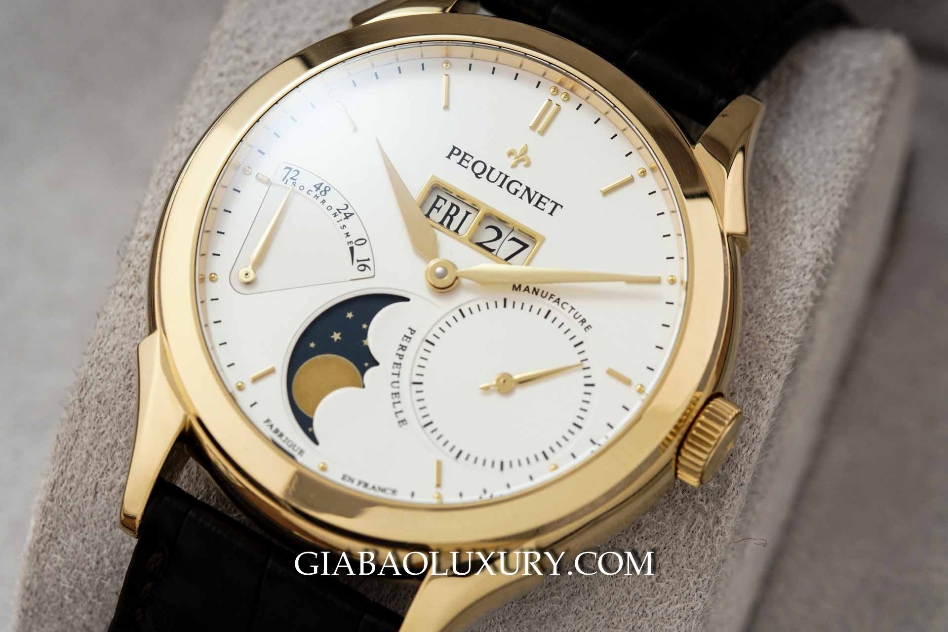 Mặt số trắng được sử dụng để phô diễn 3 tính năng, ngoài xem giờ cơ bản, nhưng không hề rối mắt, mà lại vô cùng thông thoáng, dễ nhìn. Bên dưới logo và tên thương hiệu Pequignet viết hoa là hai ô cửa báo tháng và ngày với kích thước lớn. Tháng cũng như ngày được điều chỉnh thông qua núm vặn được chia khía bằng vàng vàng tại góc 3 giờ. Với bộ máy Calibre Royal vốn được trang bị, người dùng có thể điều chỉnh tháng và ngày bất kỳ thời gian nào, không phải lo lắng về việc trật đĩa hay bang răng bên trong.
