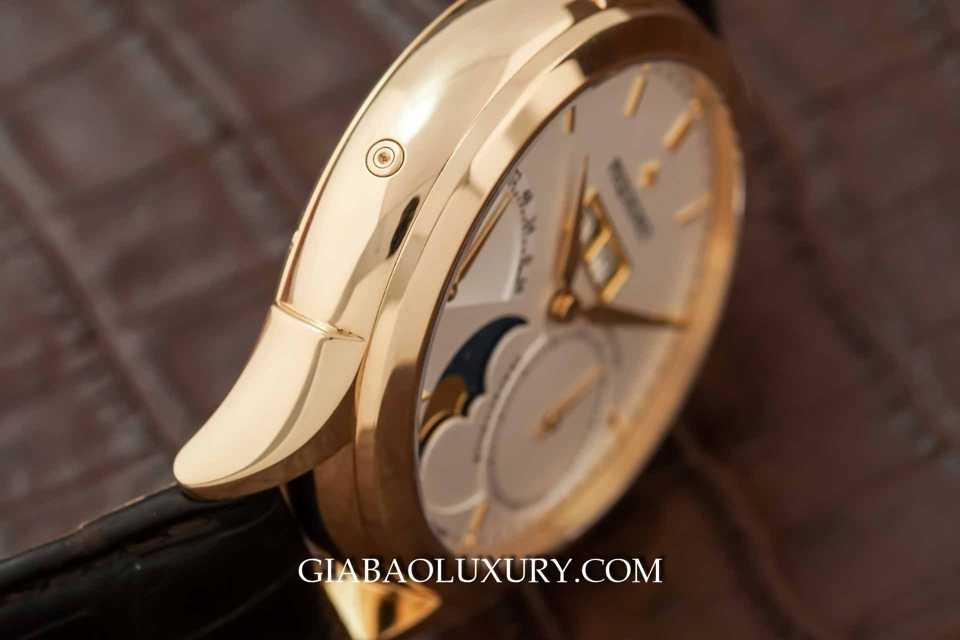 Về mặt thiết kế, Rue Royale Moonphase hiện lên với vẻ ngoài trang nhã, cổ điển của nước Pháp thơ mộng. Bộ vỏ khung kích thước 42mm được làm trong chất liệu vàng vàng cao cấp, có khả năng chống nước ở độ sâu 50m. Với dáng tròn cổ điển, bộ vỏ khung của Rue Royale Moonphase trông hút mắt nhờ bề mặt được đánh bóng láng mịn và kỹ lưỡng. Càng nối dây vát chéo nối liền với dây đeo da cá sấu màu đen ôm sát cổ tay người đeo. Đi từ kích thước đến kiểu dáng thiết kế, Rue Royale Moonphase vẫn luôn là nét cổ điển phù hợp trên mọi cổ tay nam giới.