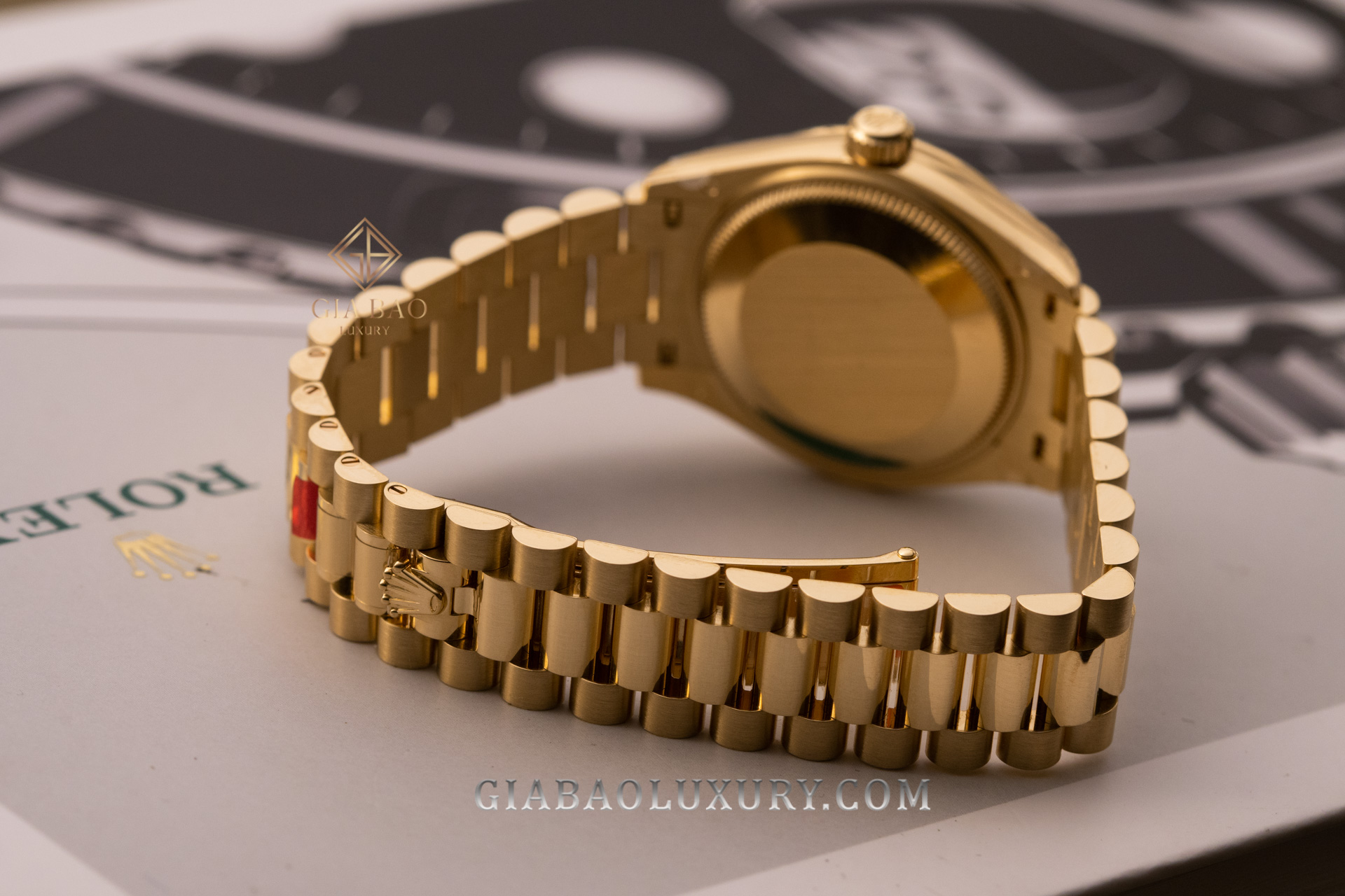 Trên nền mặt số xanh ô liu đã được hoàn thiện kiểu chải tia của cỗ máy Rolex Datejust 278278 là những cọc chỉ giờ bằng kim cương đã được tuyển chọn kỹ lưỡng. Vừa nhằm mục đích cố định các cọc chỉ giờ, vừa đảm bảo bụi bẩn không xâm nhập xuống bộ máy 2236 bên dưới, nhà sản xuất Rolex đã tiến hành bọc vàng vàng cho từng viên kim cương. Ở vị trí 12 giờ trên mặt số là biểu tượng logo vương miện Rolex sáng bóng và quyến rũ không kém bộ kim tại trung tâm.