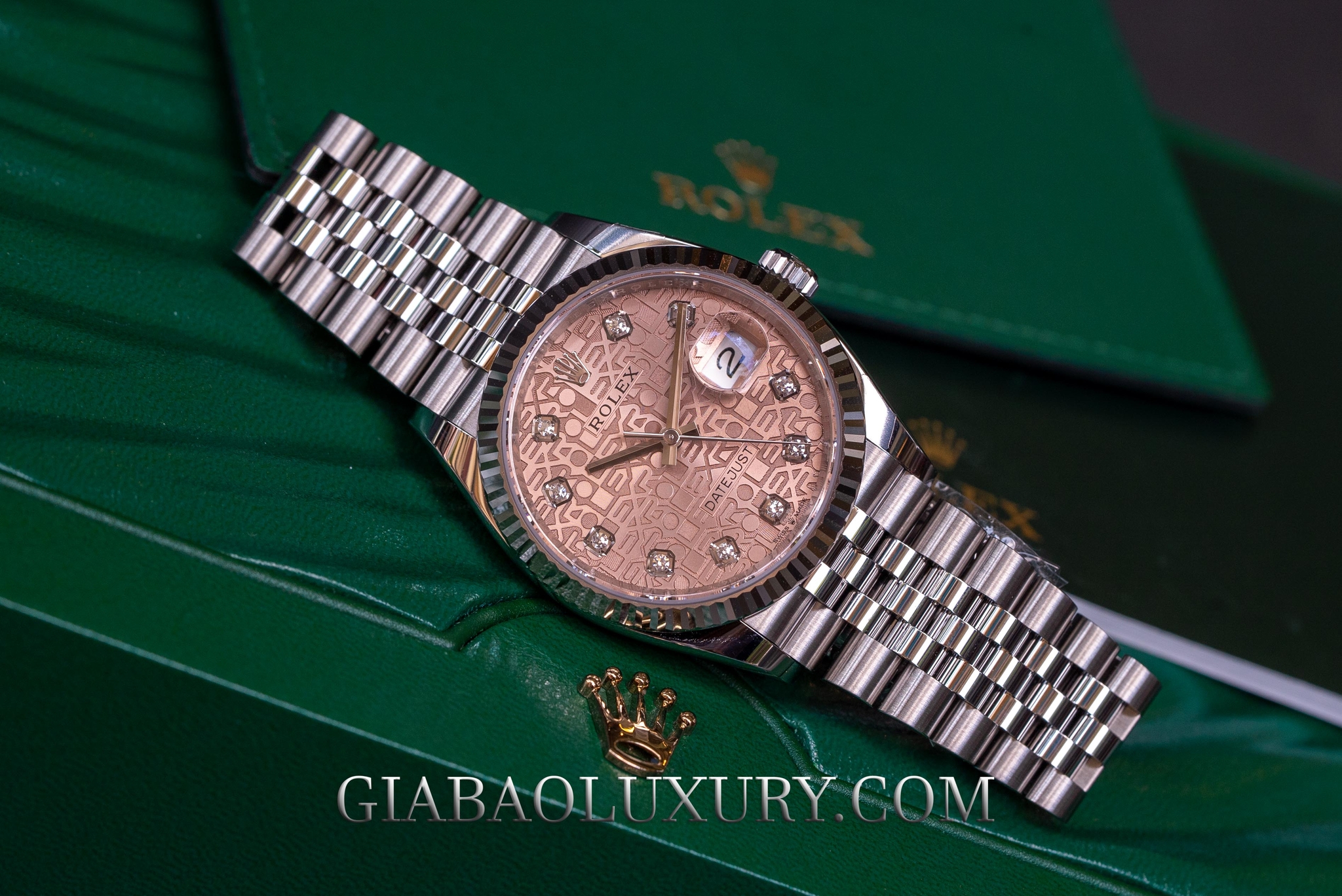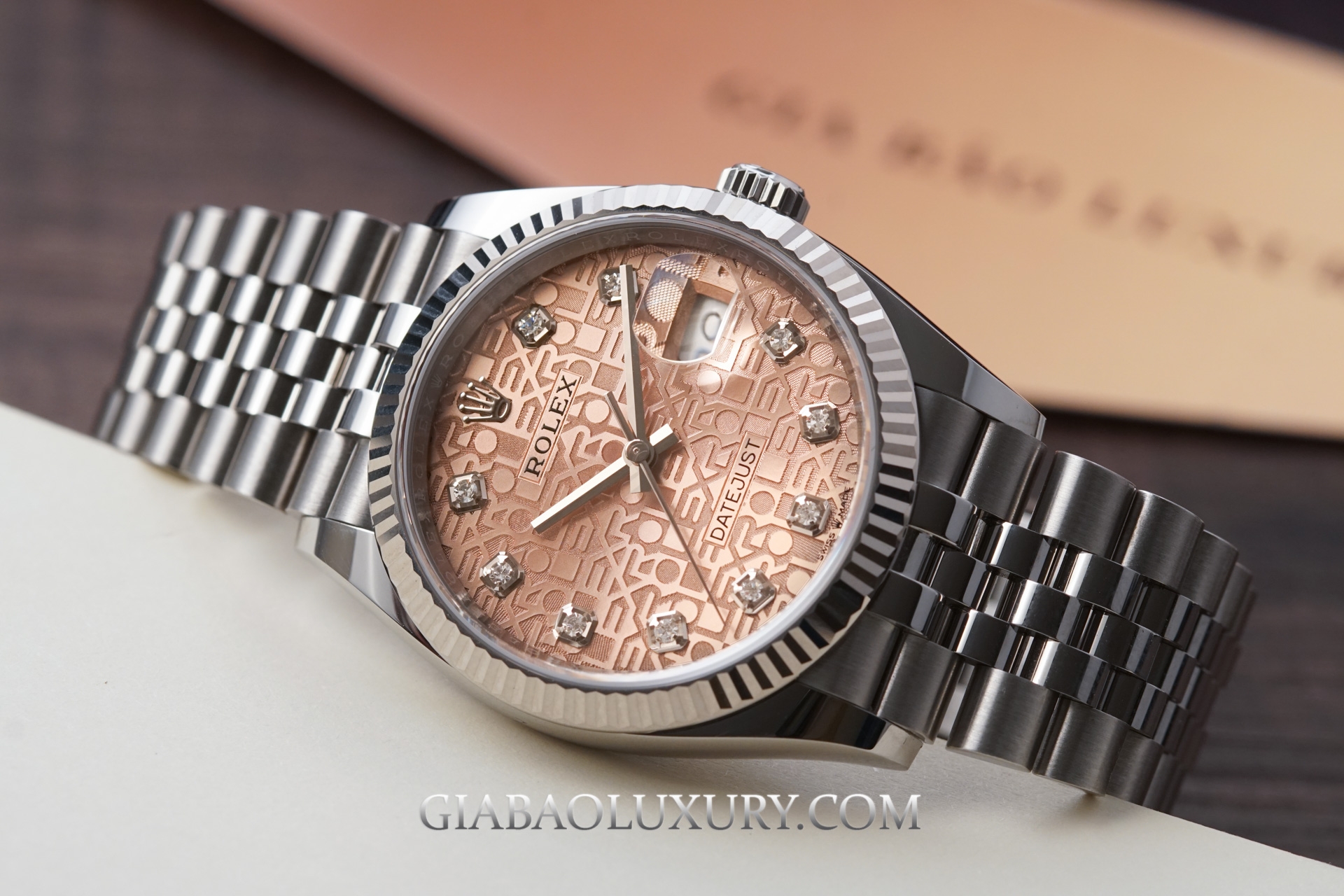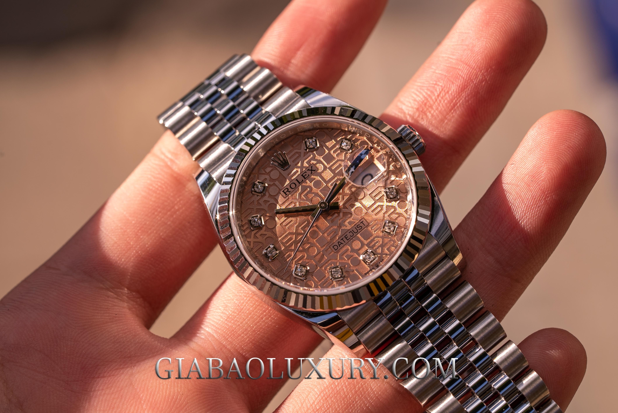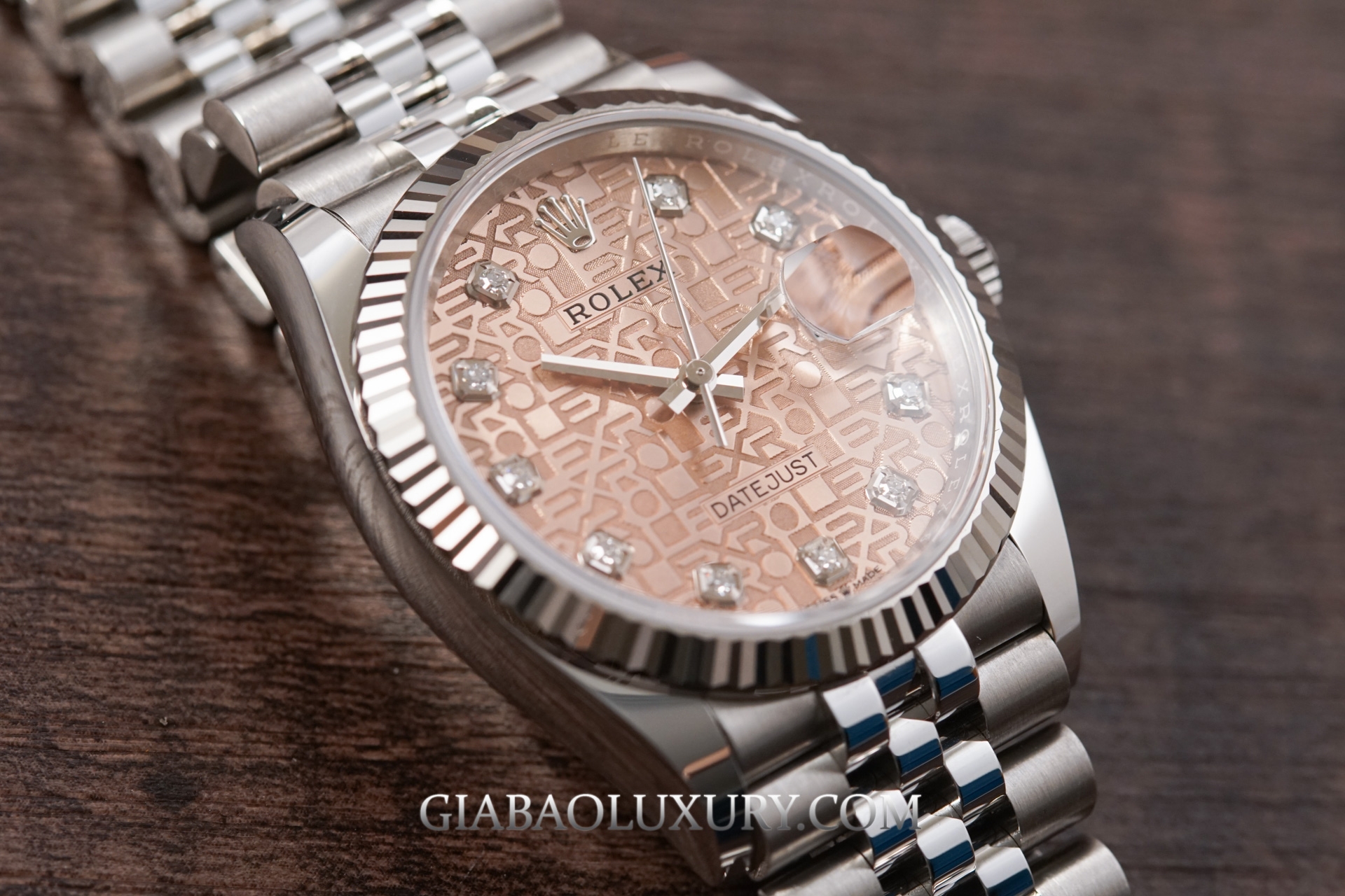 Những chiếc Datejust được thiết kế trong kích thước đa dạng để phù hợp với nhiều đối tượng khách hàng kể cả nam với nữ. Trong số đó, dòng đồng hồ Datejust 36 dường như chiếm được cảm tình hơn cả vì vẻ đẹp mang tính chất “phi giới tính”. Nam hay nữ đều có thể đeo được những chiếc đồng hồ này. Trong công cuộc tái sinh là dòng đồng hồ Datejust 36 kể từ năm ngoái, năm nay tại sự kiện toàn cầu Baselworld, Rolex tiếp tục đem đến vài thiết kế Datejust 36 mới mẻ trong chất liệu Rolesor (sự kết hợp giữa vàng trắng và thép không gỉ) đến giới mộ điệu. Là một trong những mẫu đồng hồ ấy, cỗ máy Datejust 36 có mặt tại Gia Bảo Luxury mang số hiệu ref. 126234, hiện diện trong mặt số vi tính màu cá hồi đầy cổ điển.