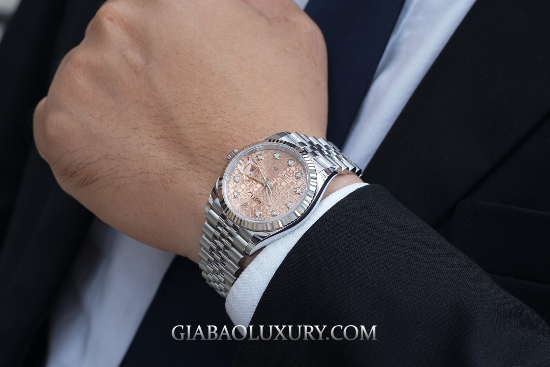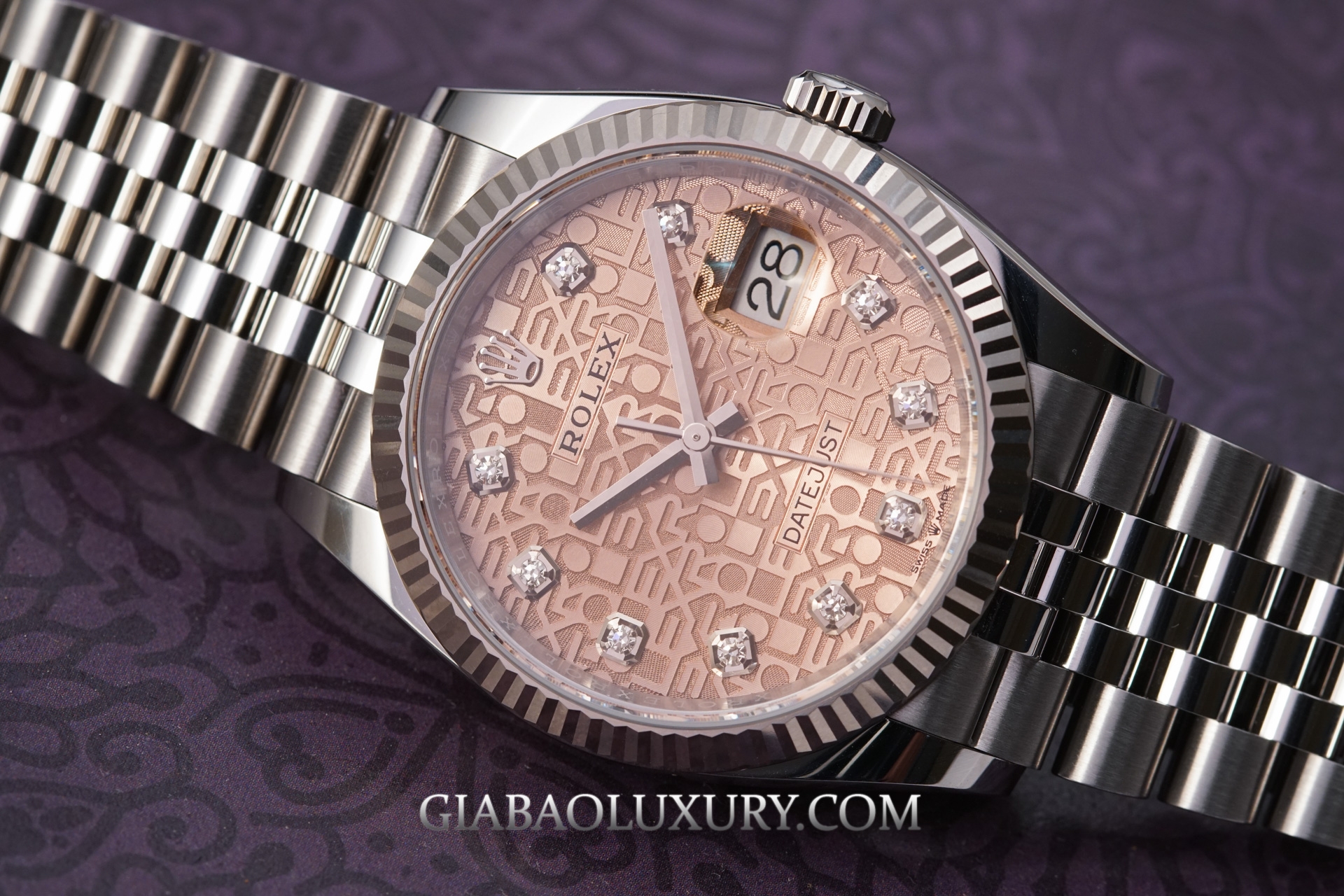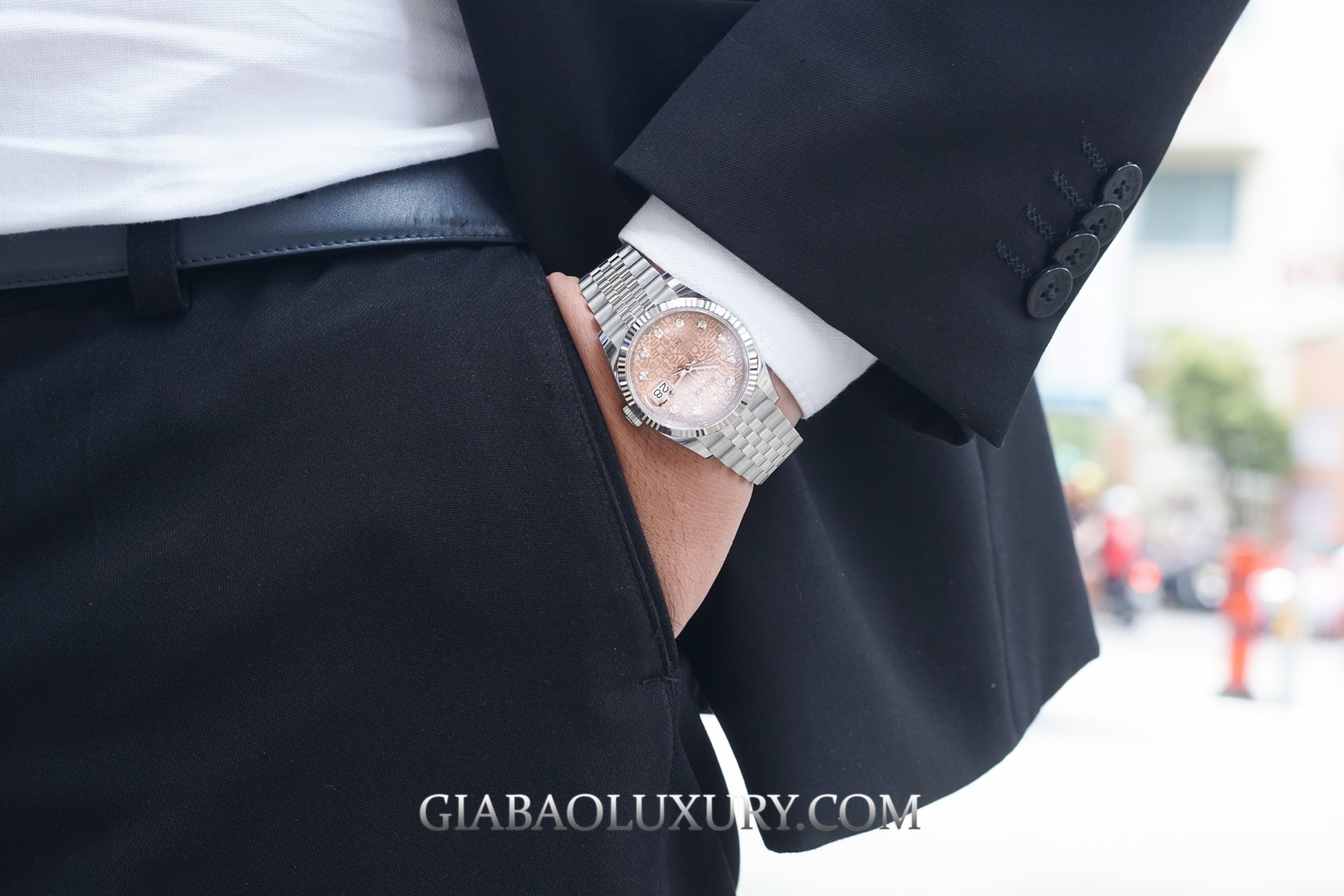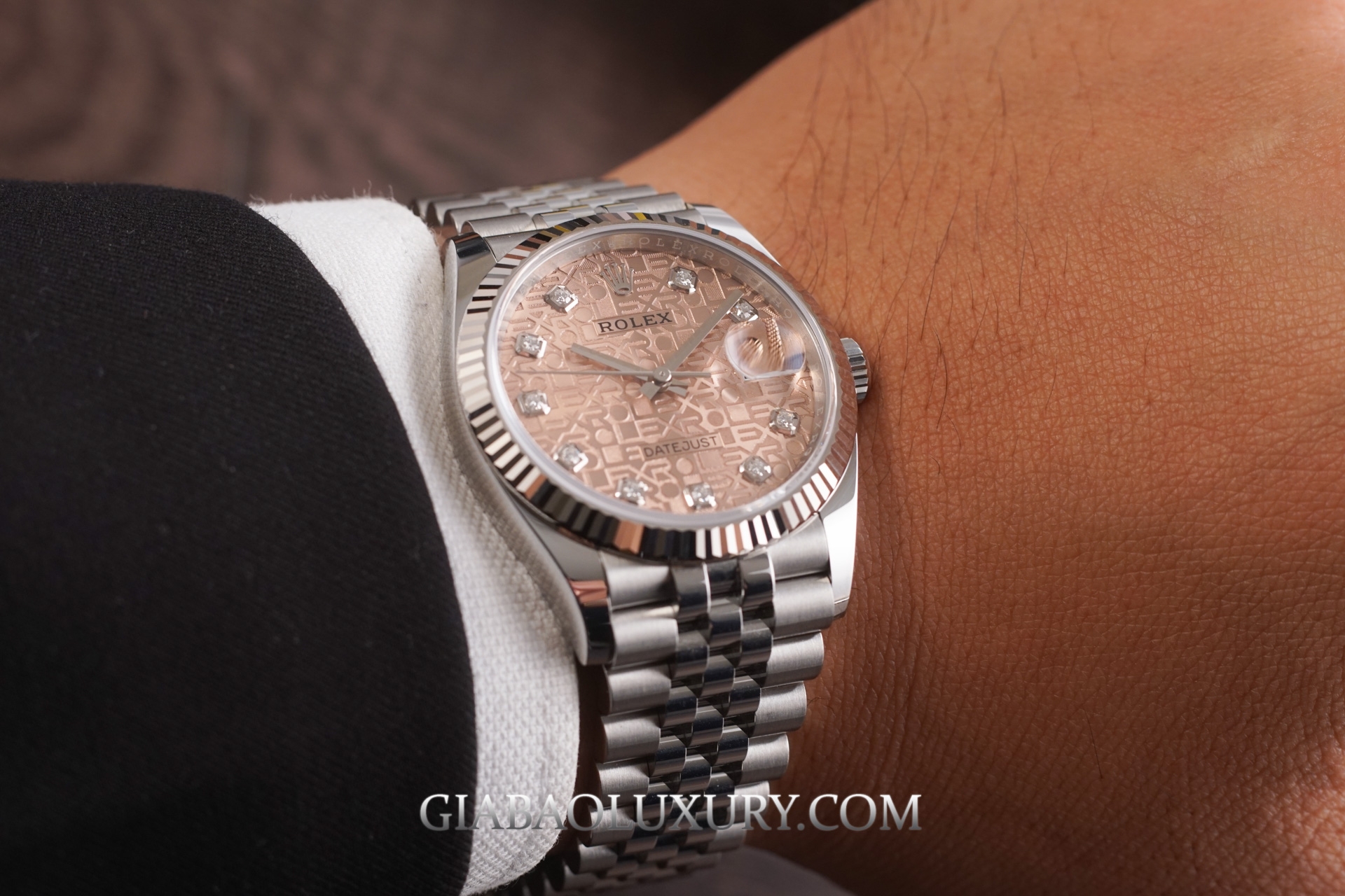 Những chiếc Datejust được thiết kế trong kích thước đa dạng để phù hợp với nhiều đối tượng khách hàng kể cả nam với nữ. Trong số đó, dòng đồng hồ Datejust 36 dường như chiếm được cảm tình hơn cả vì vẻ đẹp mang tính chất “phi giới tính”. Nam hay nữ đều có thể đeo được những chiếc đồng hồ này. Trong công cuộc tái sinh là dòng đồng hồ Datejust 36 kể từ năm ngoái, năm nay tại sự kiện toàn cầu Baselworld, Rolex tiếp tục đem đến vài thiết kế Datejust 36 mới mẻ trong chất liệu Rolesor (sự kết hợp giữa vàng trắng và thép không gỉ) đến giới mộ điệu. Là một trong những mẫu đồng hồ ấy, cỗ máy Datejust 36 có mặt tại Gia Bảo Luxury mang số hiệu ref. 126234, hiện diện trong mặt số vi tính màu cá hồi đầy cổ điển.